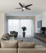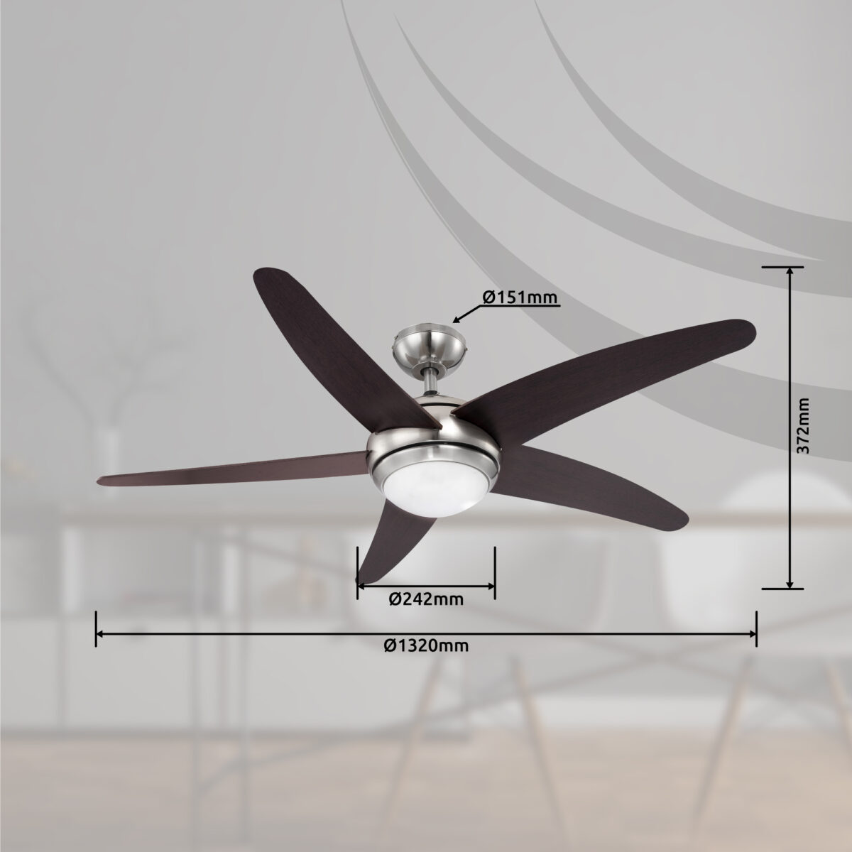 Ovaj plemeniti stropni ventilator predstavlja se sa pet zaobljenih lopatica rotora u boji oraha. Može se uključiti u tri faze i bez problema se može koristiti do veličine prostorije od 30 m2. Promjer mu je 132 cm i može se postaviti na kosim krovovima ako se ne prekorači nagib od 30°. Zahvaljujući desnoj i lijevoj rotaciji, ovaj ventilator može raditi i ljeti i zimi. Nadalje, okretaji se mogu podešavati u 3 stupnja i mogu se kontrolirati pomoću daljinskog upravljača koji je jednostavan za korištenje. Maksimalna snaga motora je 55 W.