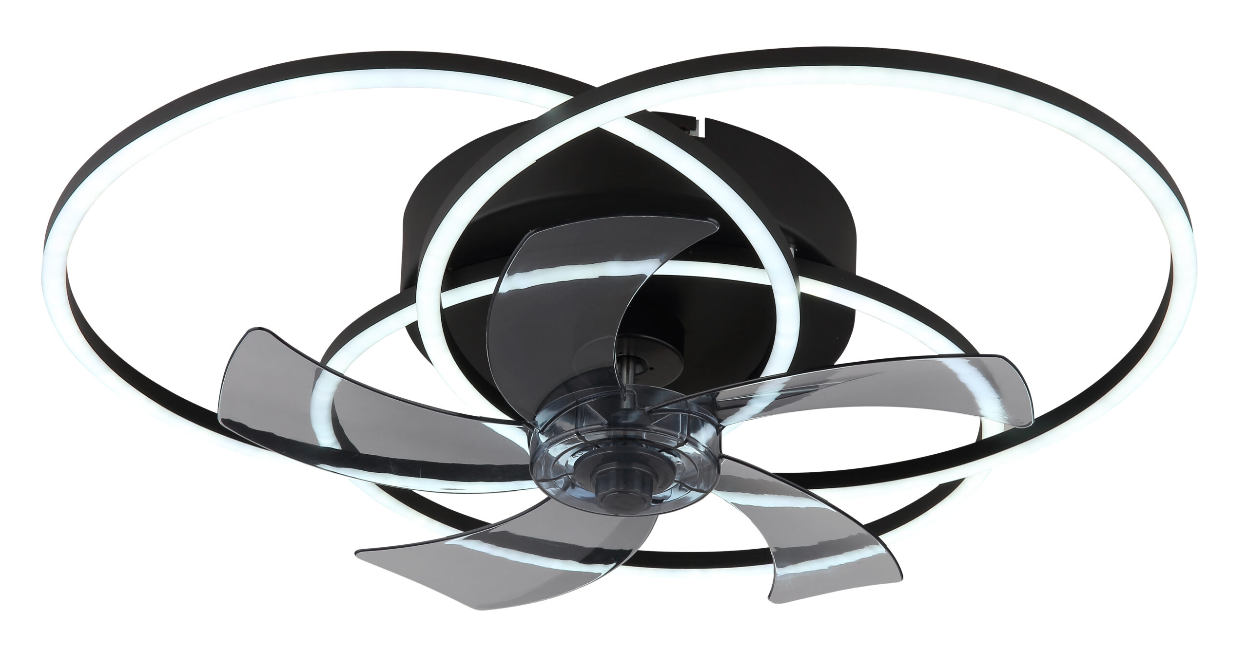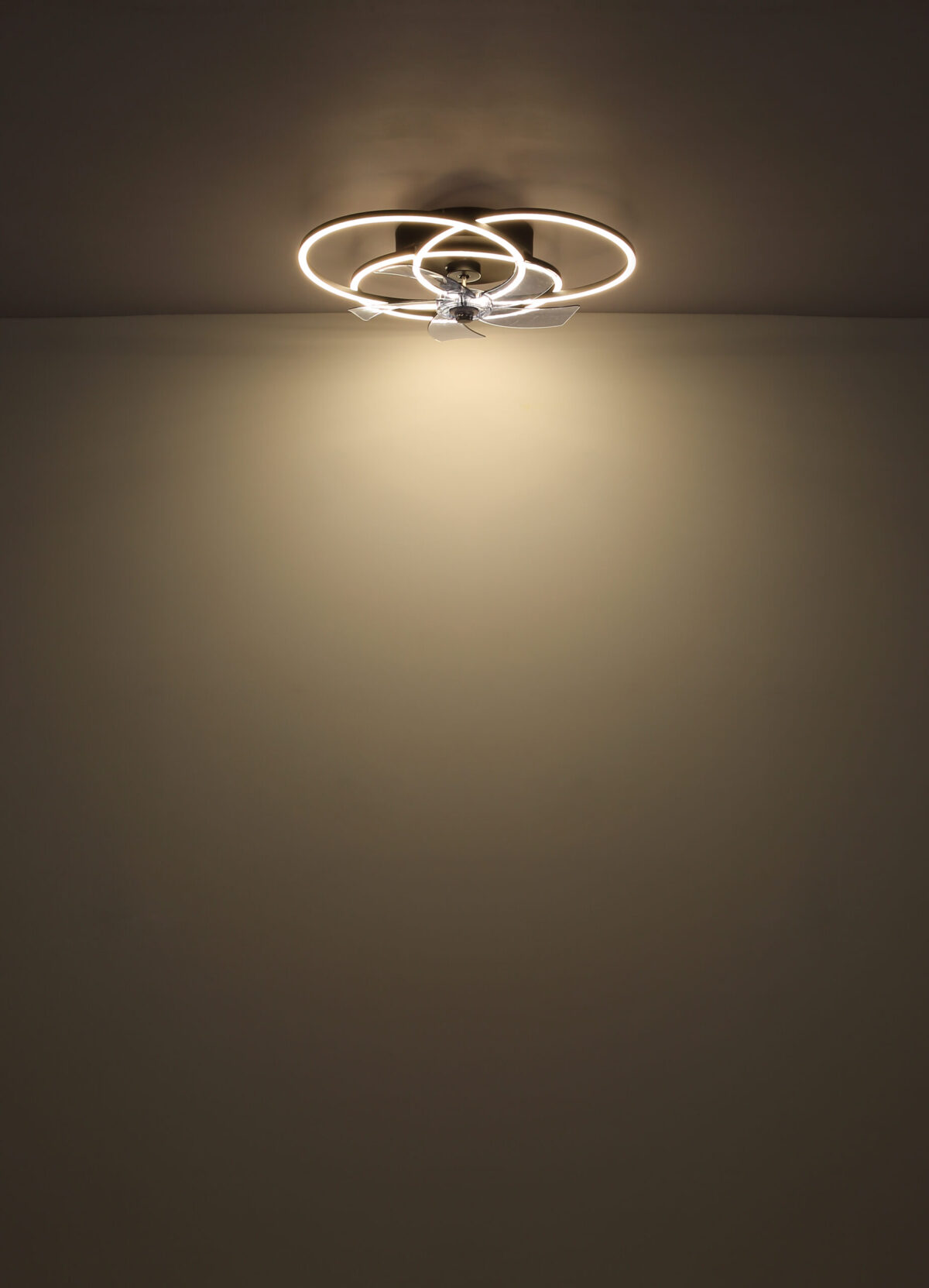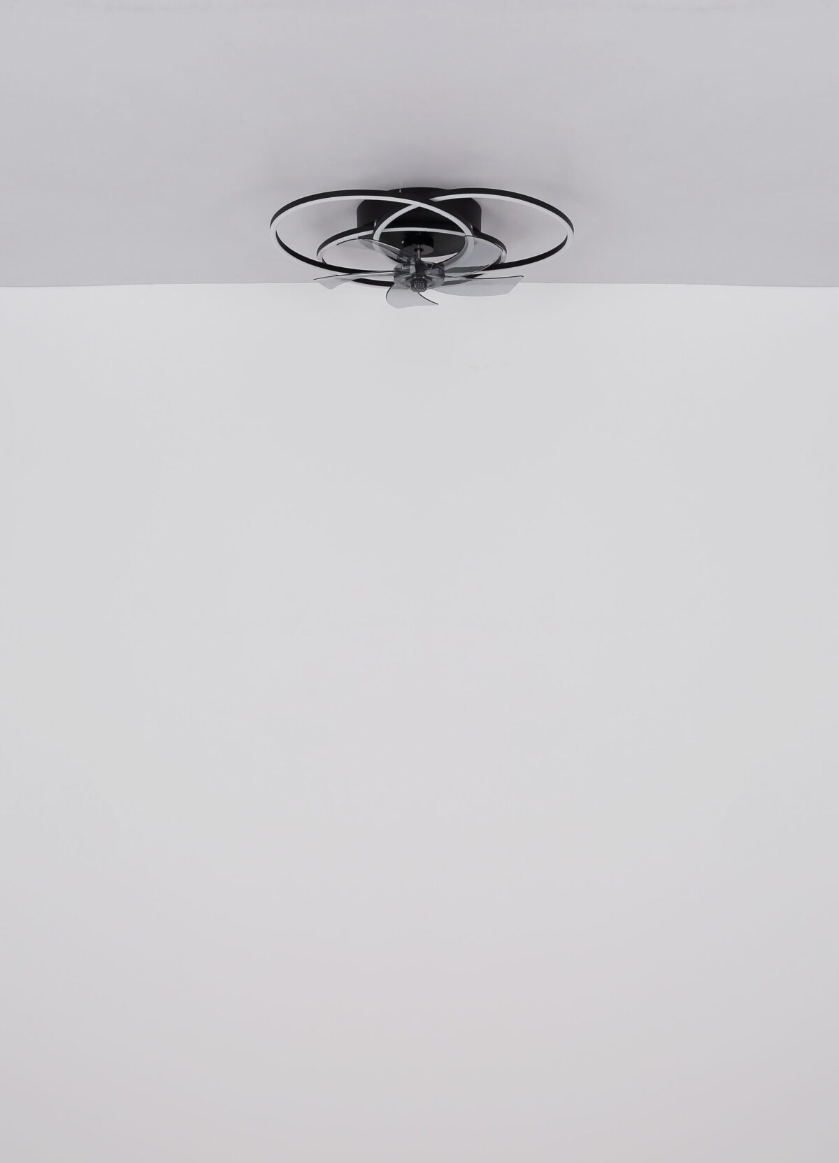 Otkrijte ALIA lampu – moderan i praktičan plafonski ventilator koji će revitalizirati vaš prostor. Lampa ima tijelo od crnog, mat lakiranog metala, na kojem su postavljena tri prstena za ventilator. Sam ventilator je opremljen s pet lopatica koje se lako i tiho okreću. Sjenilo je izrađeno od aluminijuma i ofarbano crno radi poboljšanja vizuelnog dojma. Plastični poklopci dostupni su u opalnoj ili dimljenoj varijanti, kako bi se lampa mogla prilagoditi vašem ukusu. ALIA lampa dolazi s daljinskim upravljačem, funkcijom zatamnjivanja (dimming), mogućnošću podešavanja boje svjetlosti i memorijskom funkcijom. Uz to ima i funkciju noćnog svjetla i svjetlosni izlaz od 2000 lumena. Temperatura boje (CCT) se može podešavati od 3000K do 6500K kako bi se postiglo optimalno osvjetljenje. Idealno za one koji traže moderno i praktično rješenje za svoj životni prostor.