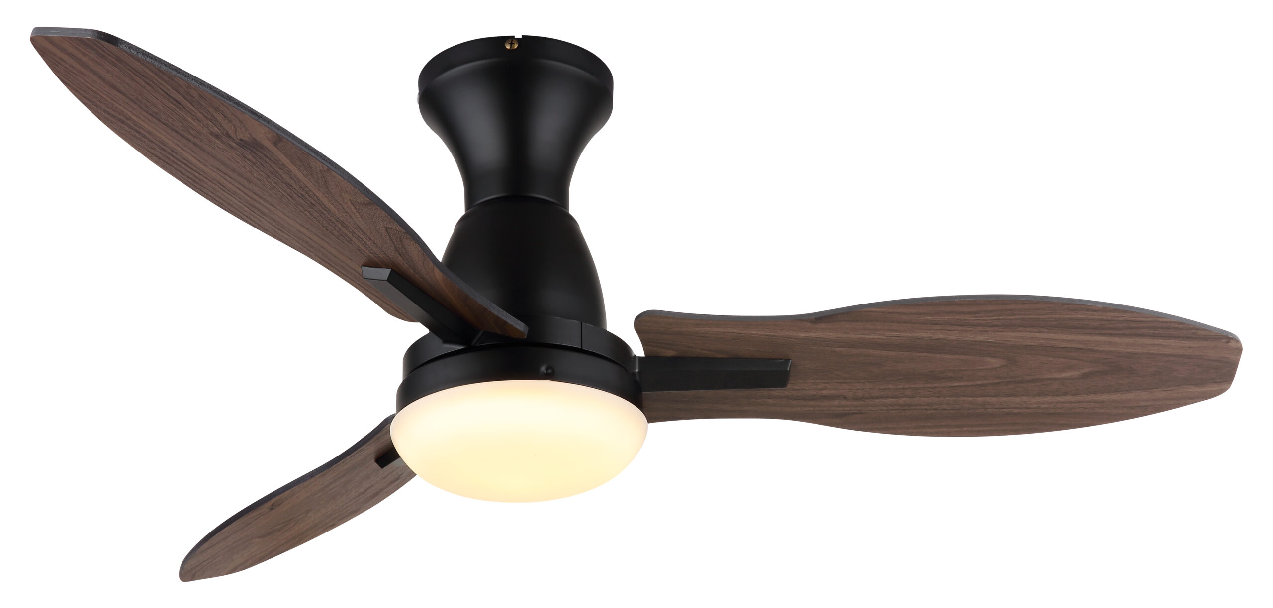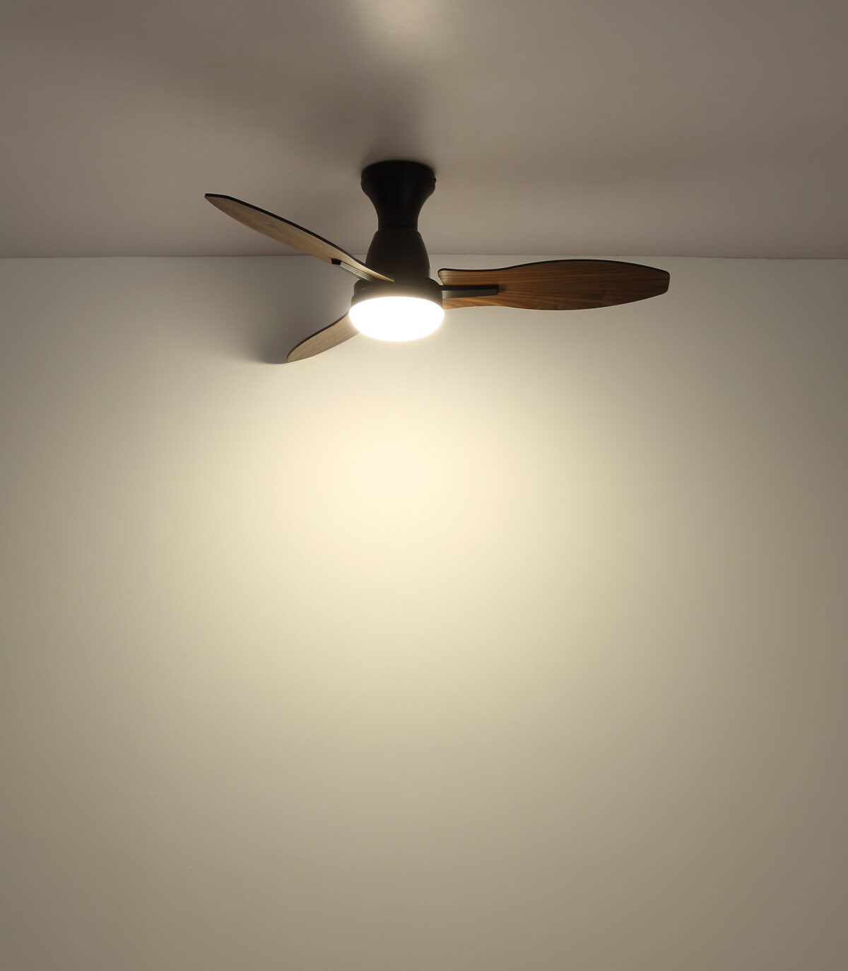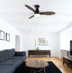 GALE plafonski ventilator – moderan izgled i pametne funkcije. Okrugli GALE plafonski ventilator kombinuje savremeni dizajn sa snažnom tehnologijom. Sa tri krila u izgledu tamnog ili svijetlog drveta i tijelom od mat crnog metala, unosi elegantan i prirodan ton u svaki prostor. Sjenilo od opalne plastike osigurava prijatnu, neblještavu distribuciju svjetlosti. Zahvaljujući integrisanoj LED tehnologiji, GALE pruža svjetlosni učinak od 2100 lumena i podesivu CCT temperaturu boje od 3000 K do 6500 K. Prigušive i fiksabilne boje, kao i memorijska funkcija, omogućavaju individualno podešavanje osvjetljenja po želji. Sa prečnikom od 1070 mm, GALE osigurava optimalnu cirkulaciju zraka. Lako se upravlja pomoću daljinskog upravljača koji dolazi u paketu. Savršen za sve koji žele spoj funkcionalnosti i modernog dizajna u jednom ventilatoru!