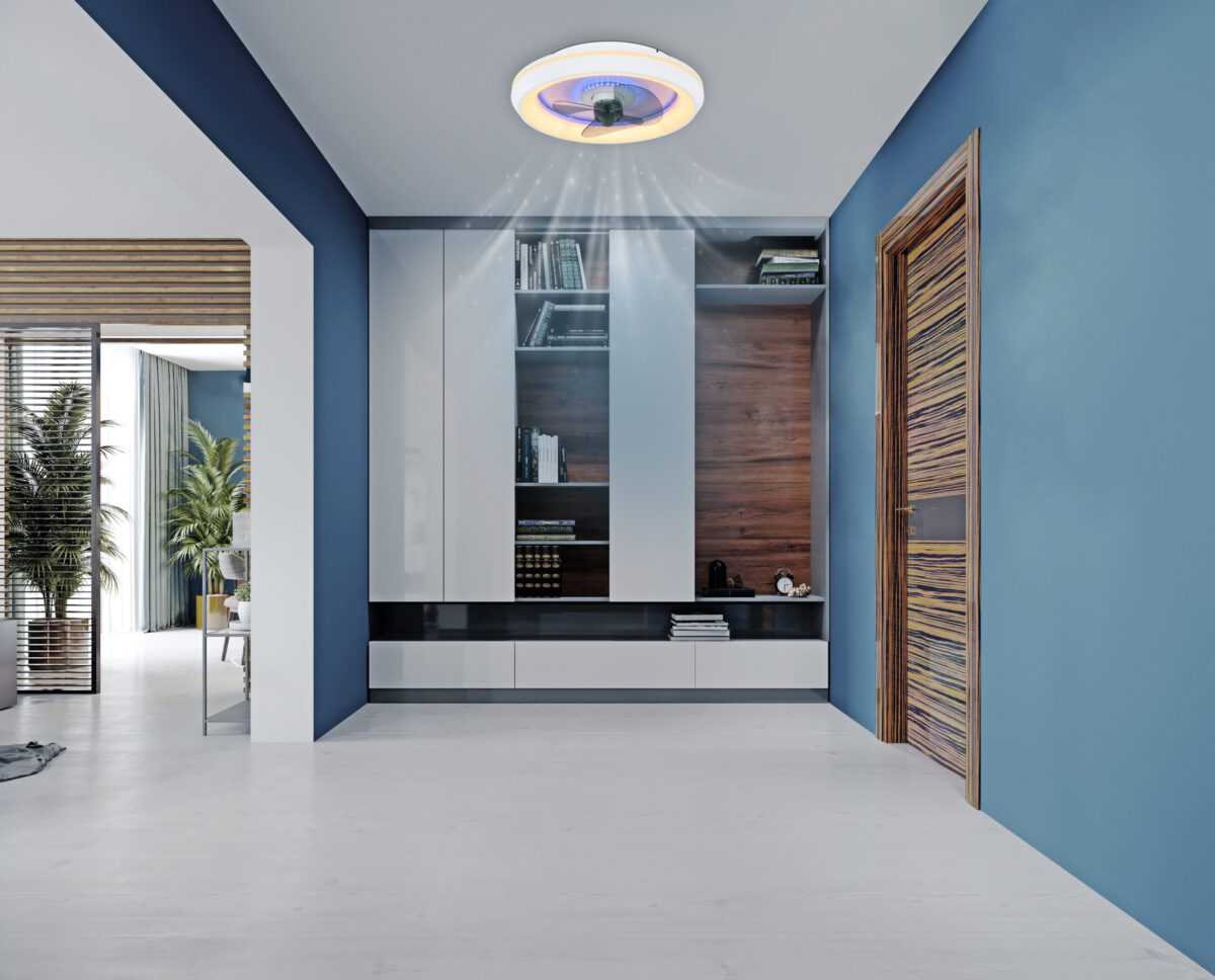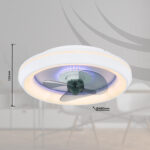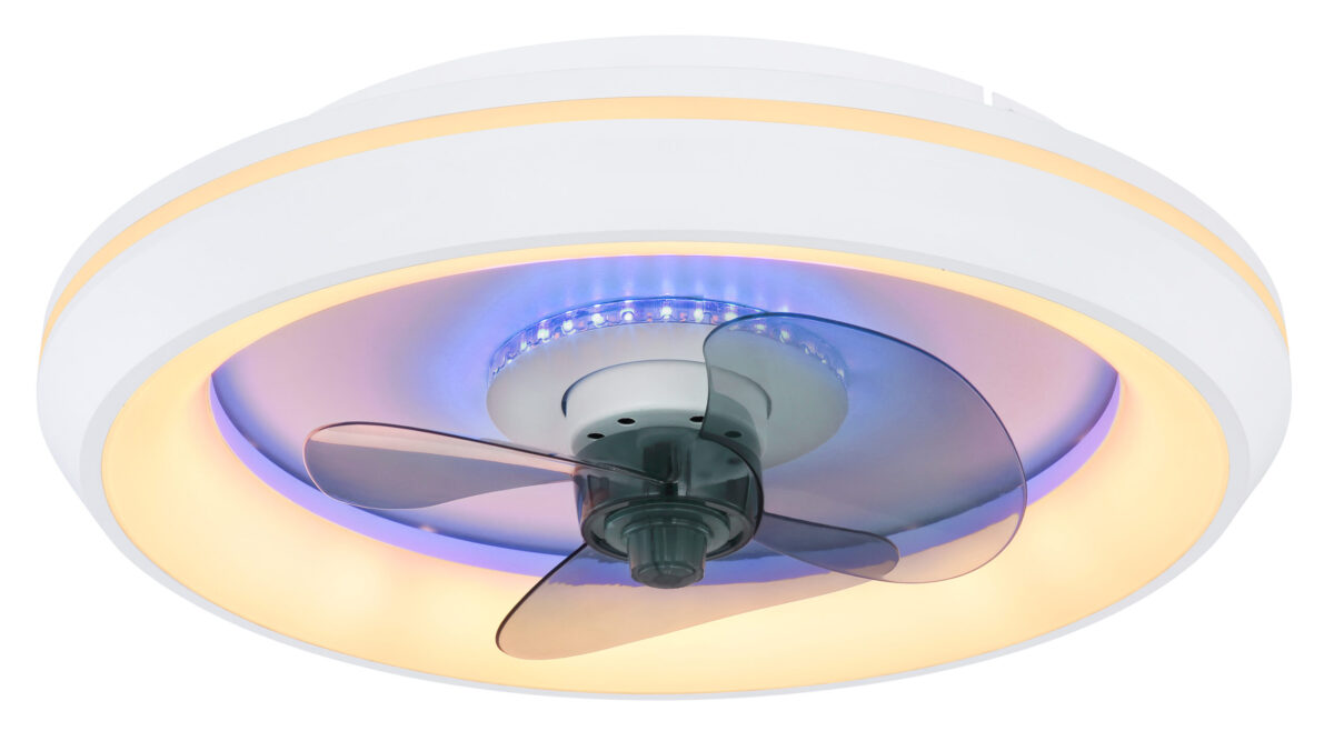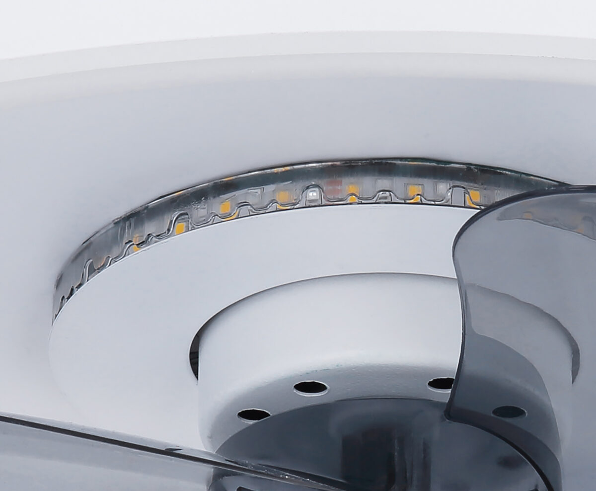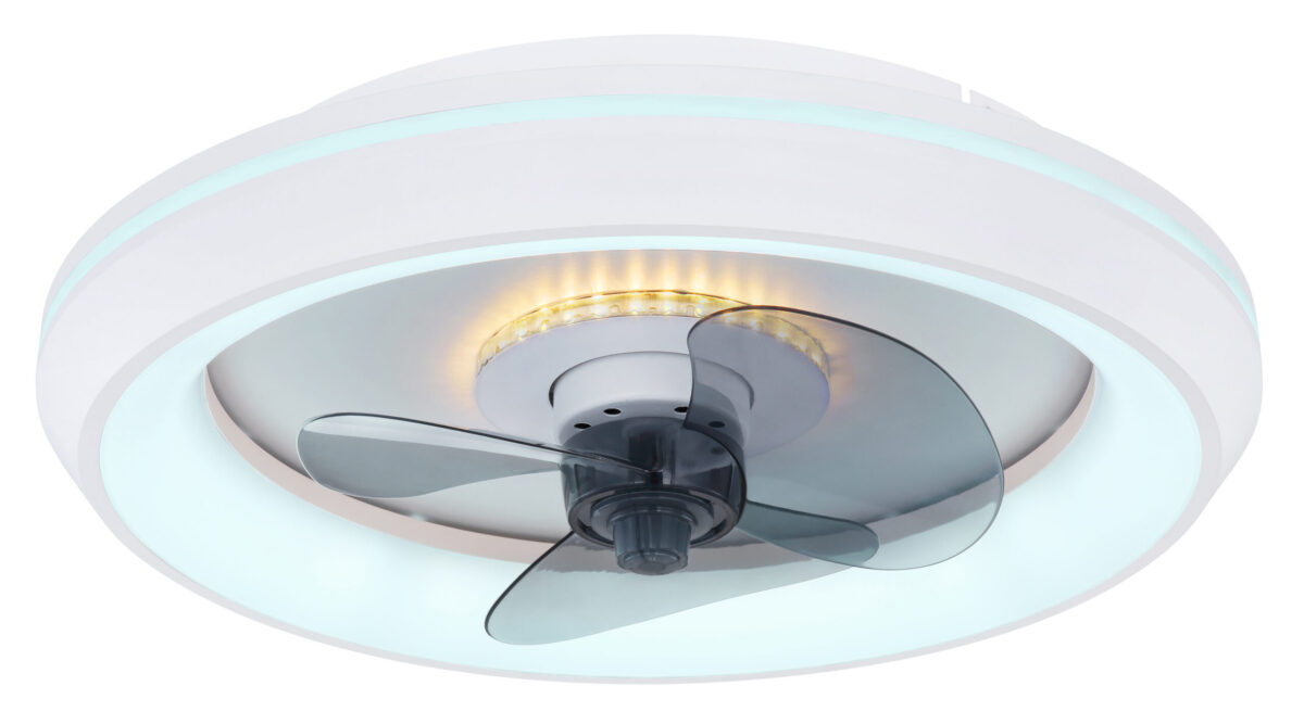 Ovaj stropni ventilator iz Joey serije (ø 45 cm) predstavlja stilski dodatak vašem enterijeru. Lopatice rotora izrađene su od dimljenog stakla i imaju LED traku koja može svijetliti u više boja, doprinoseći tako savršenom izgledu ventilatora. Spoljašnji dio ventilatora obrubljen je opalnim plastičnim prstenom koji je obložen bijelim metalom. Ugrađene LED sijalice ispod plastike pružaju snažno svjetlo jačine 2216 lumena. Uz pomoć priloženog daljinskog upravljača, ne samo da možete prigušiti svjetlo, već i individualno podešavati boju svjetla u više nivoa, između tople bijele (2700 Kelvina) i hladne bijele (6500 Kelvina), a tu je i funkcija noćnog svjetla. Osim toga, možete prilagođavati i brzinu rotacije lopatica, čime uvijek osiguravate svjež zrak u svom prostoru.