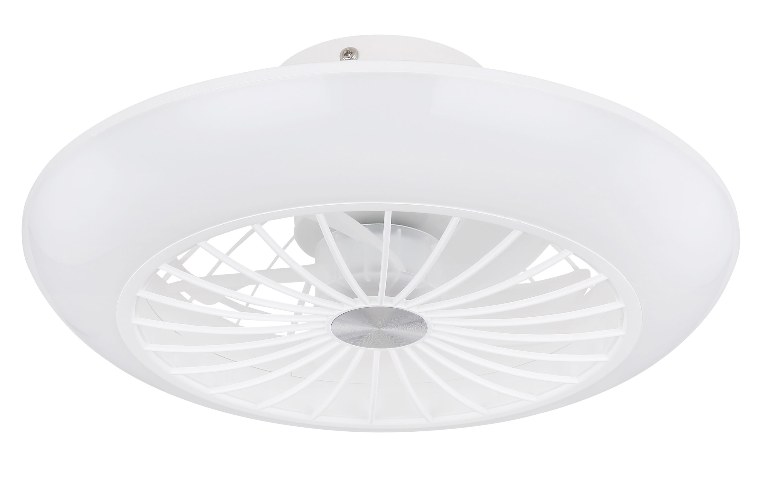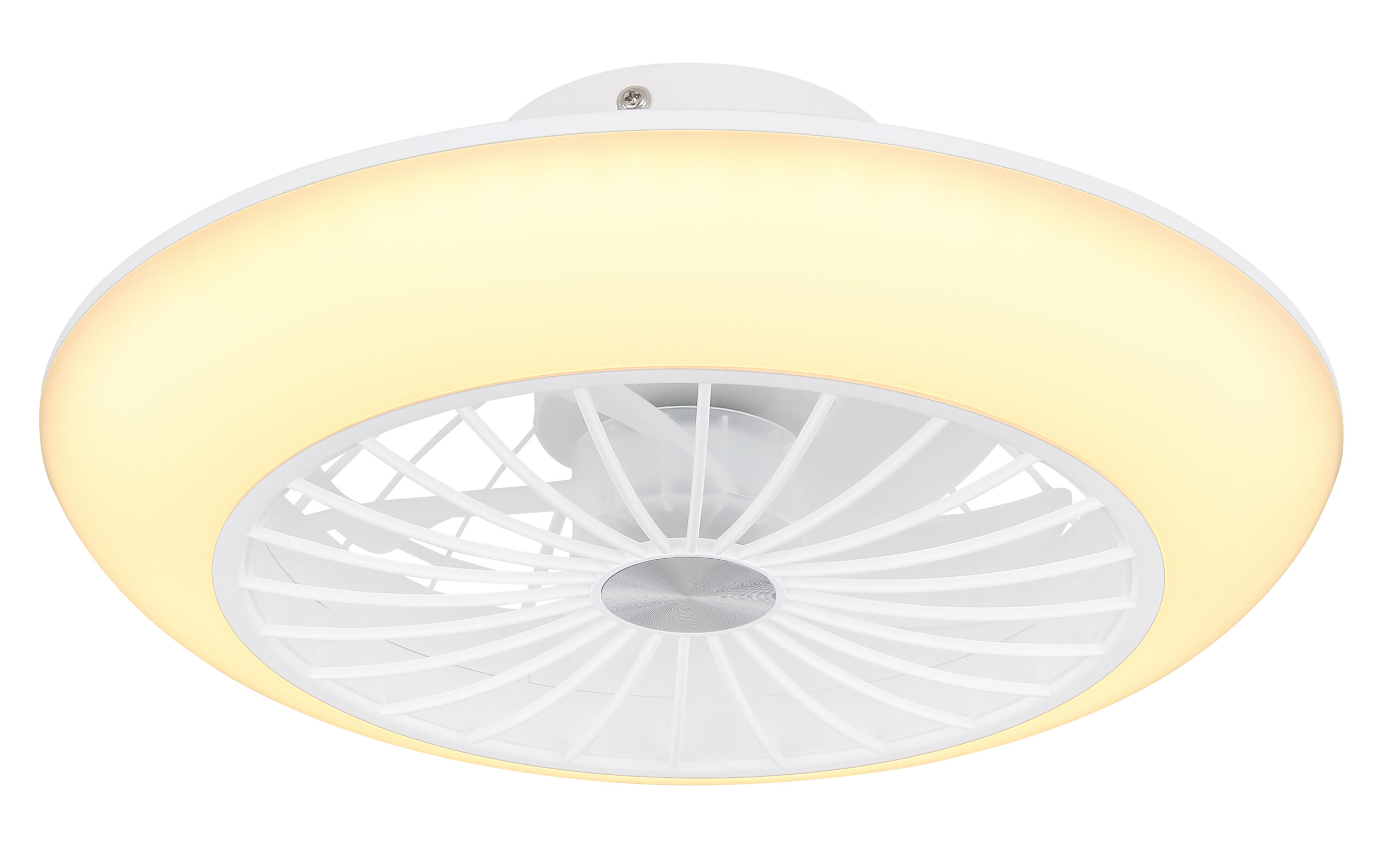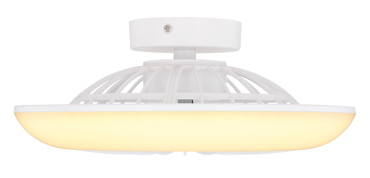 Ova sjajna stropna lampa u prelijepoj bijeloj boji fascinira svojom kombinacijom lampe i ventilatora. Okrugla stropna svjetiljka (Ø30 cm) ima prstenastu LED ploču sa integrisanim ventilatorom u sredini i može se uključivati u 3 faze putem zidnog prekidača. Prva faza uključuje svjetlo, druga ventilator, a treća omogućava rad oba istovremeno pri prijatnoj svjetlosnoj jačini toplo bijele boje od 3000 Kelvina, uz mogućnost zadržavanja posljednje korištene postavke zahvaljujući funkciji memorije.