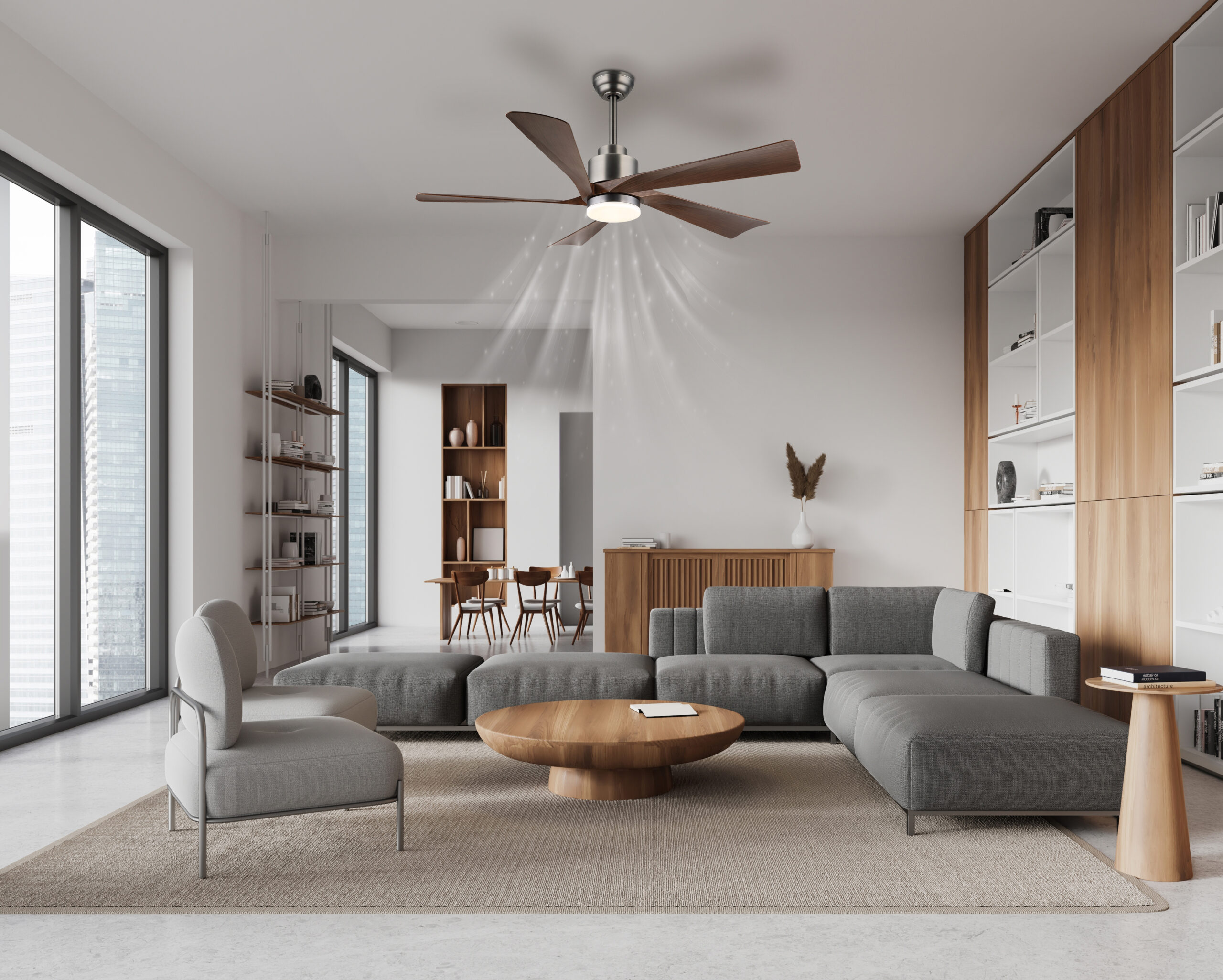 Kombinujući moderan dizajn s vrhunskom funkcionalnošću, stropni ventilator MODESTO je savršen izbor za savremene životne prostore. Sa prečnikom od 1320 mm i pet elegantnih krila, osigurava efikasnu cirkulaciju zraka i ugodnu klimu u prostoriji. Telo ventilatora izrađeno je od tamnosivog metala, dok su svijetlosive metalne površine i sjenilo od opalne plastike skladno uklopljeni. U drvenom izgledu, ventilator se ističe ne samo kao funkcionalan element, već i kao stilski dekorativni predmet. MODESTO je opremljen praktičnim daljinskim upravljačem koji omogućava jednostavno podešavanje funkcija i prigušivanje svjetla. Sa snagom svjetla od 1600 lumena i podesivom temperaturom boje svjetla (CCT) od 2700 K do 6500 K, možete optimalno prilagoditi osvjetljenje prostoru. Fiksne boje i korisna memorijska funkcija omogućavaju da vaša podešavanja ostanu sačuvana pri svakom uključivanju ventilatora. Integrisano noćno svjetlo zaokružuje kompletan doživljaj. Uživajte u savršenoj kombinaciji udobnosti, stila i funkcionalnosti uz MODESTO stropni ventilator!