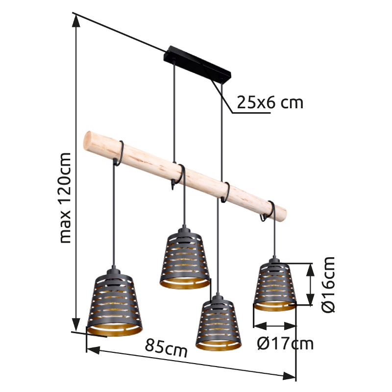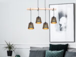 Uz ovu, izuzetno modernu viseću lampu sa četiri plamena, postavljeni su svetleći akcenti. Polovan e.B. u kuhinjskom ili dnevnom boravku, ovaj model sa svojim ukrasnim perforacijama, dužine 85 cm i zlatnom bojom iznutra, može doprinijeti ugodnom okruženju. Zbog činjenice da je ova unutrašnja svjetiljka podesiva po visini, svjetiljka se može fleksibilno koristiti. Ima četiri E27 utičnice, koje vam omogućavaju da sami odredite izvor svjetlosti, a time i intenzitet svjetla i boju svjetla. Zbog njihove dugovječnosti i uštede energije, preporučujemo korištenje LED sijalica za ovu unutarnju svjetiljku. Sa ostalim modelima ove serije možete dodatno uljepšati sliku svog životnog prostora.