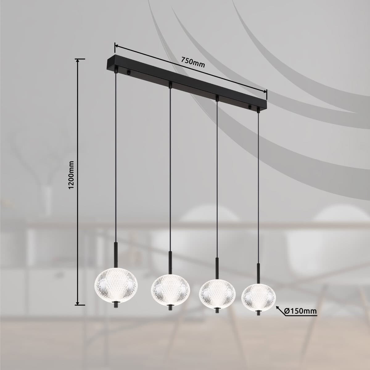 Visina lampe je dužine 850 mm, širine 150 mm i visine 1200 mm. Izrađen je od crnog, mat metala i prozirnog akrila. Kabl je crne boje i izrađen od PVC-a. Viseća lampa ima nekoliko koraka koji se mogu kontrolisati preko zidnog prekidača. Boje se mogu popraviti i postoji memorijska funkcija. Viseća lampa je opremljena LED sijalicom snage 25W i napona 230V. Izvor svjetlosti ima svjetlinu od 2500lm izvora i izlaznu svjetlinu od 1500lm sa temperaturom boje od 3000/4500/6000K. Lampa je moderan i elegantan rasvjetni element, savršen za dnevni boravak, blagovaonicu ili spavaću sobu. Sa svojom memorijskom funkcijom, možete sačuvati željena podešavanja i pozvati ih u bilo kom trenutku. Boje se mogu popraviti, tako da možete prilagoditi osvjetljenje svom raspoloženju. Viseća lampa se lako postavlja i može se sastaviti za nekoliko minuta.