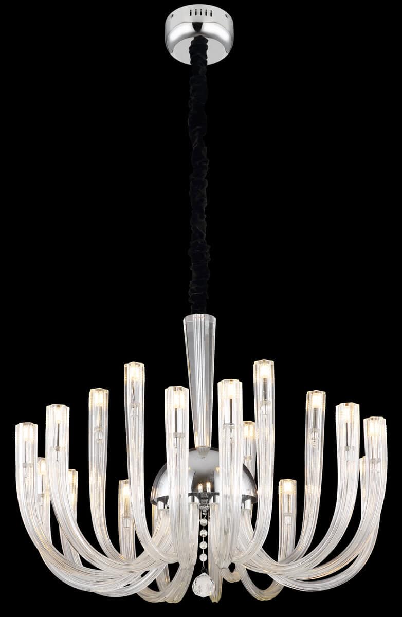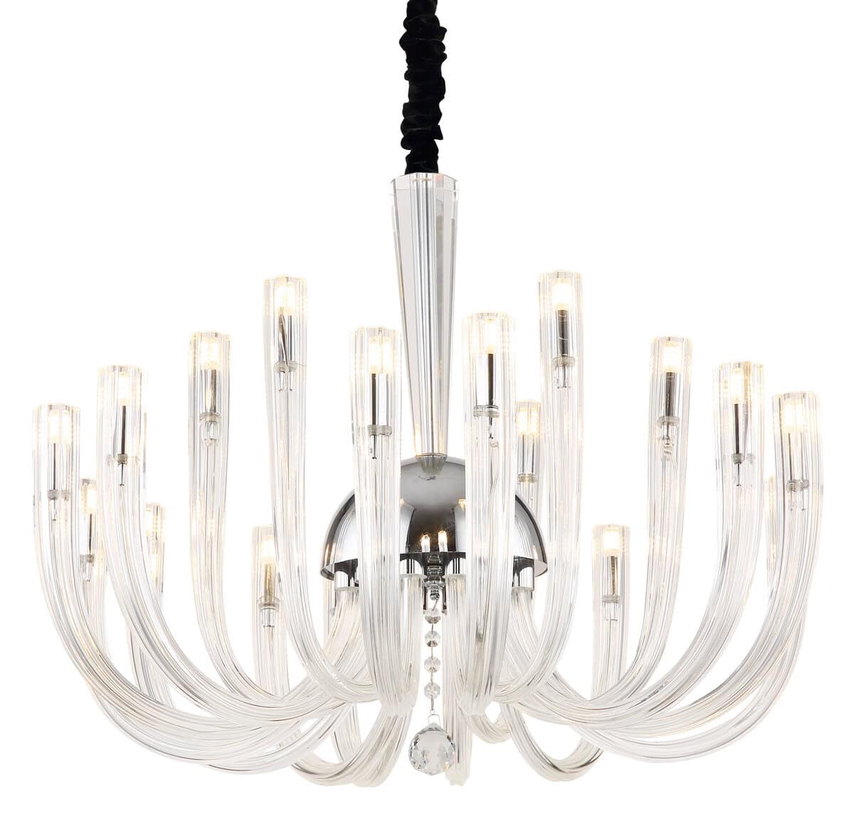 Viseća lampa je izrađena od hromiranog metala i prozirnih staklenih šipki raspoređenih u prečniku od 720 mm. Svetiljka se isporučuje bez sijalica i zahteva 18 G9 sijalica, svaka snage do 7 W i napona 230 V. Viseća lampa je prava pažnja i idealna je za moderne životne prostore. Lanac sa crnim baršunastim poklopcem daje lampi elegantan izgled. Sa dimenzijama od 720 mm (prečnik) i 1200 mm (visina), harmonično se uklapa u svaku prostoriju.