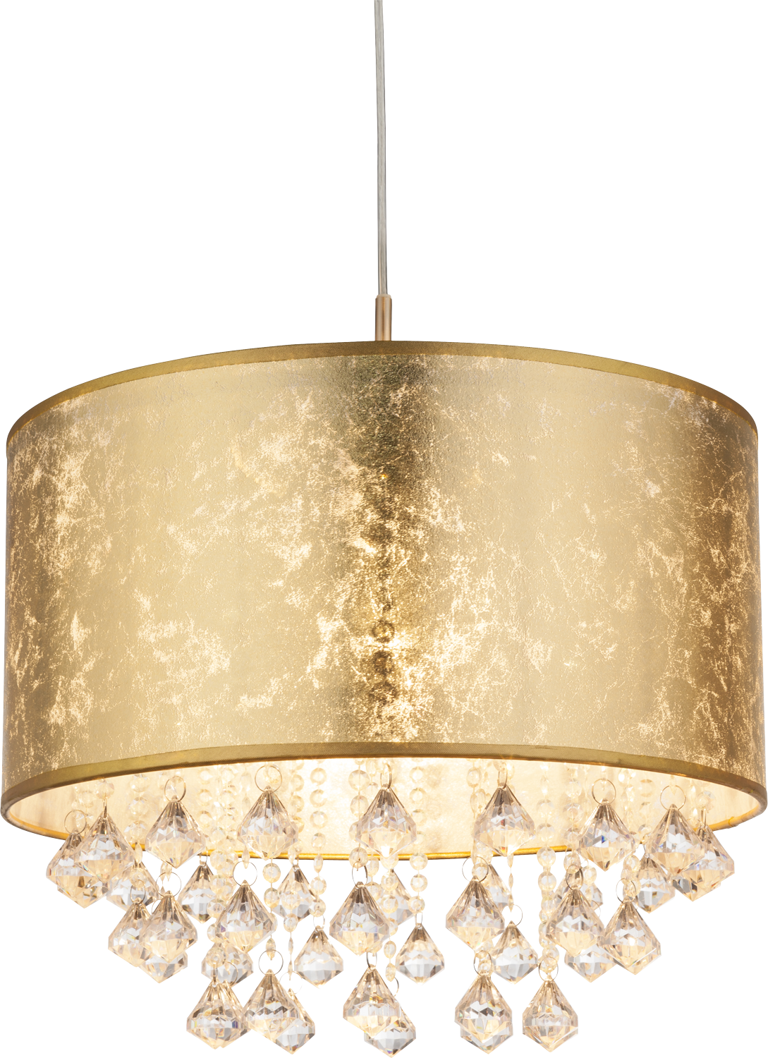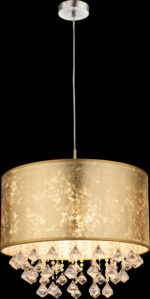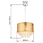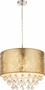 Upadljiva viseća lampa Amy zadivljuje svojim dizajnom i materijalima. Odlična izrada i odličan kvalitet. Nikl-mat okvir, zlatno obojena tekstilna nijansa i kristali koji vise sa njega privlače poglede u svakom dnevnom boravku. Sjenilo je prečnika oko 40 cm i opremljeno je E27 utičnicom. Ovo vam omogućava da odredite željeni intenzitet svjetlosti i odgovarajuću temperaturu boje korištenjem različitih lampi prikladnih za utičnicu. Zbog uštede energije i dugovečnosti preporučujemo LED lampe.