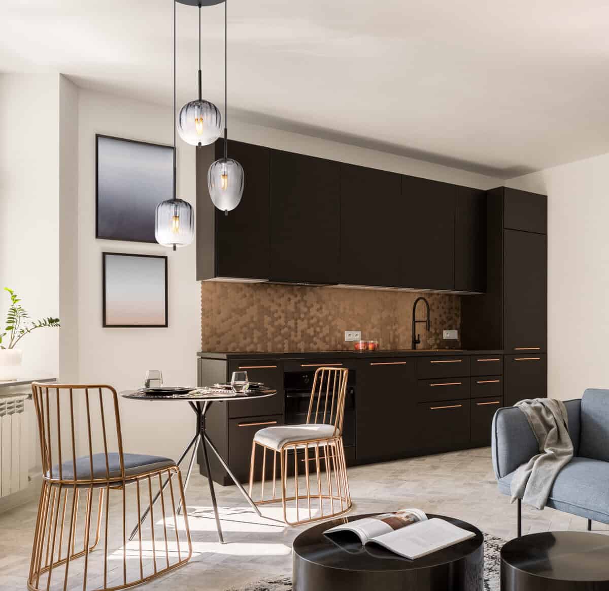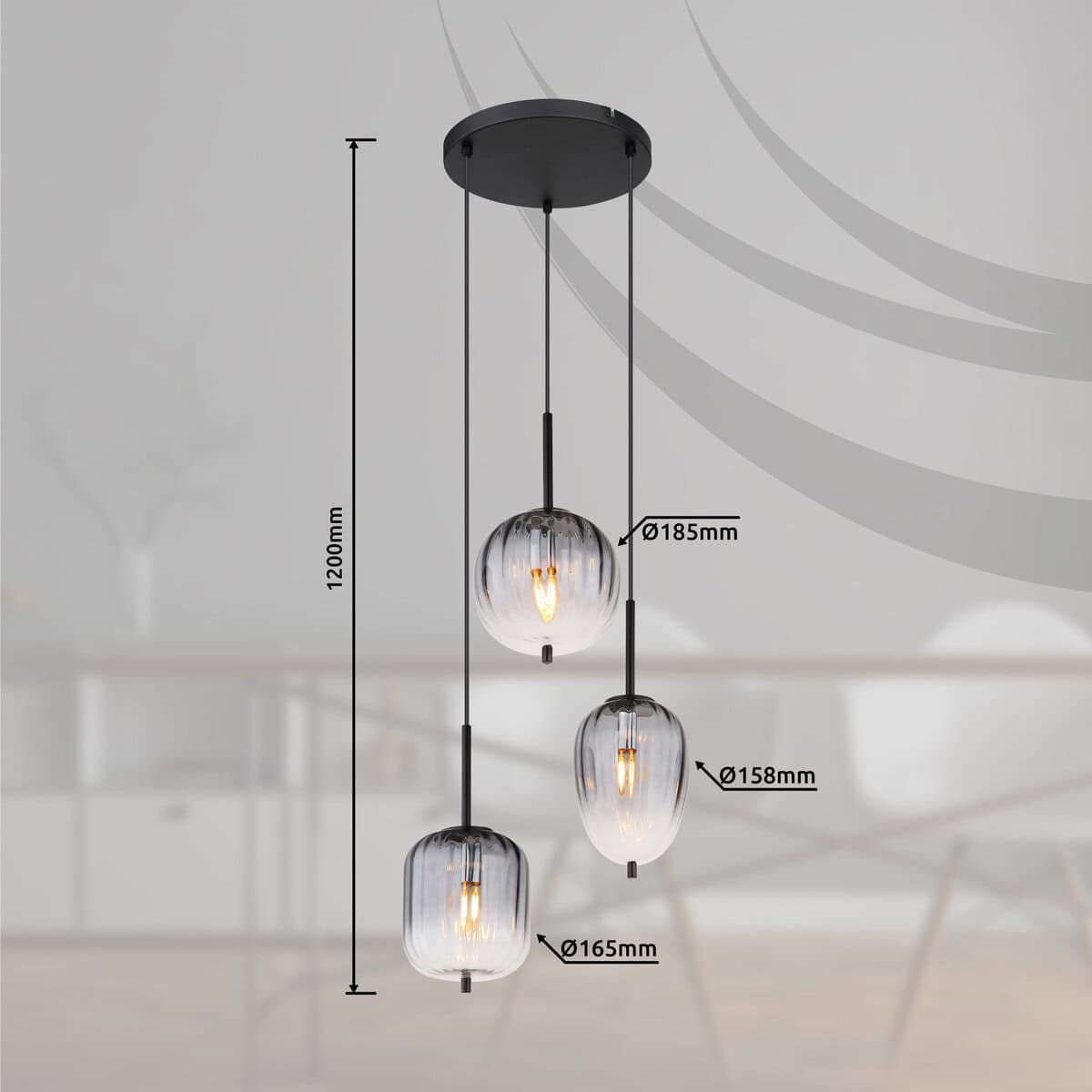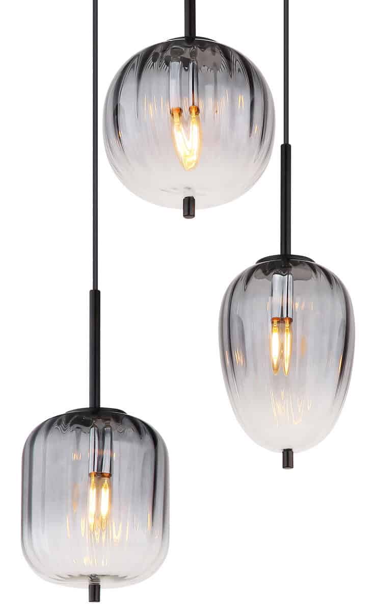 Visina lampe je prečnika 460 mm i visine 1200 mm. Izrađen je od crnog, mat metala i stakla u boji dima koje ima jasan gradijent. Kabl je crne boje i izrađen od PVC-a. Prečnik stakla varira između 15,8 cm, 16,5 cm i 18,5 cm. Lampa je moderan i elegantan rasvjetni element, savršen za dnevni boravak, blagovaonicu ili spavaću sobu. Svojim staklom u boji dima i jasnim nagibom stvara ugodnu atmosferu u svakoj prostoriji. Viseća lampa se lako postavlja i može se sastaviti za nekoliko minuta.