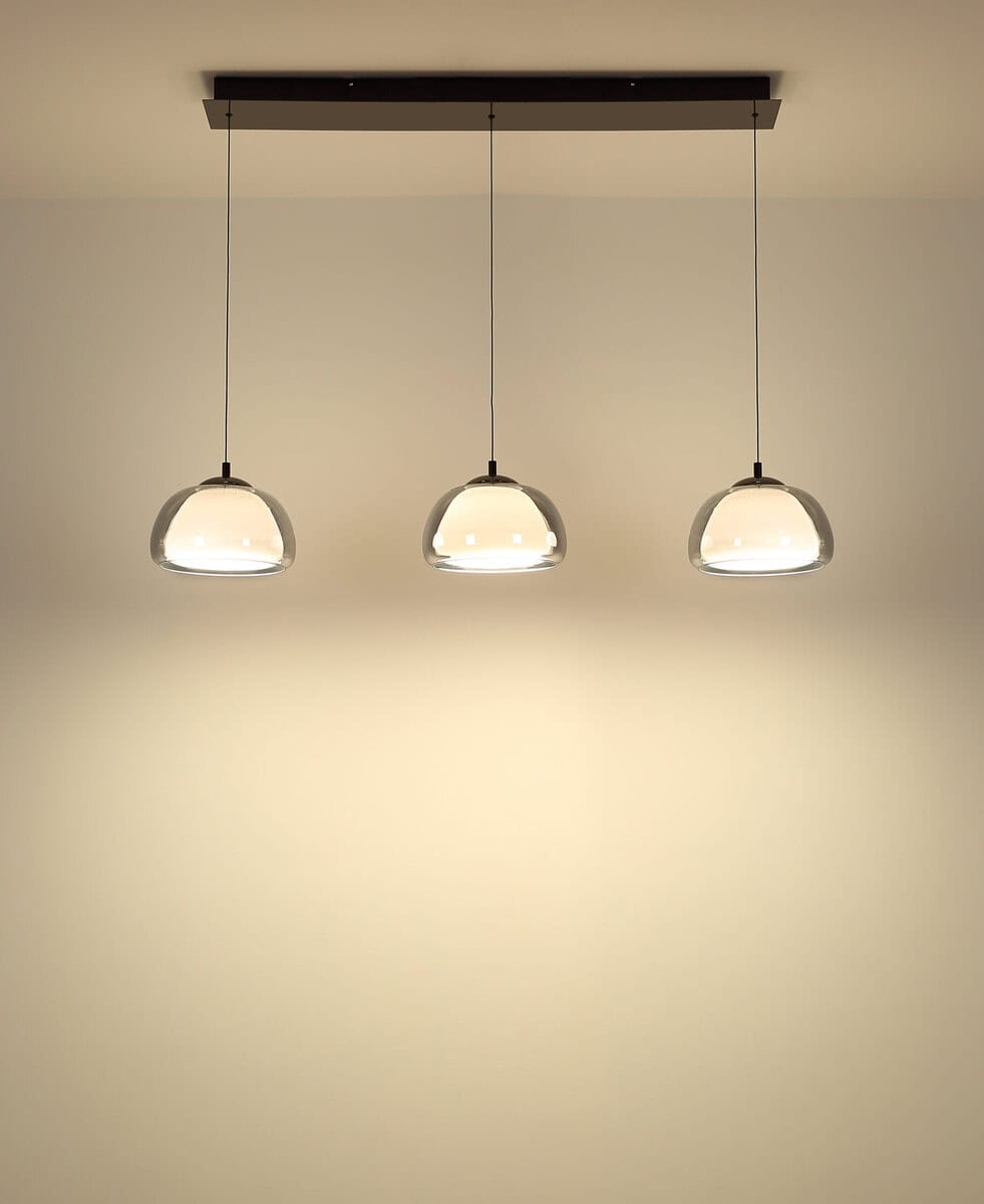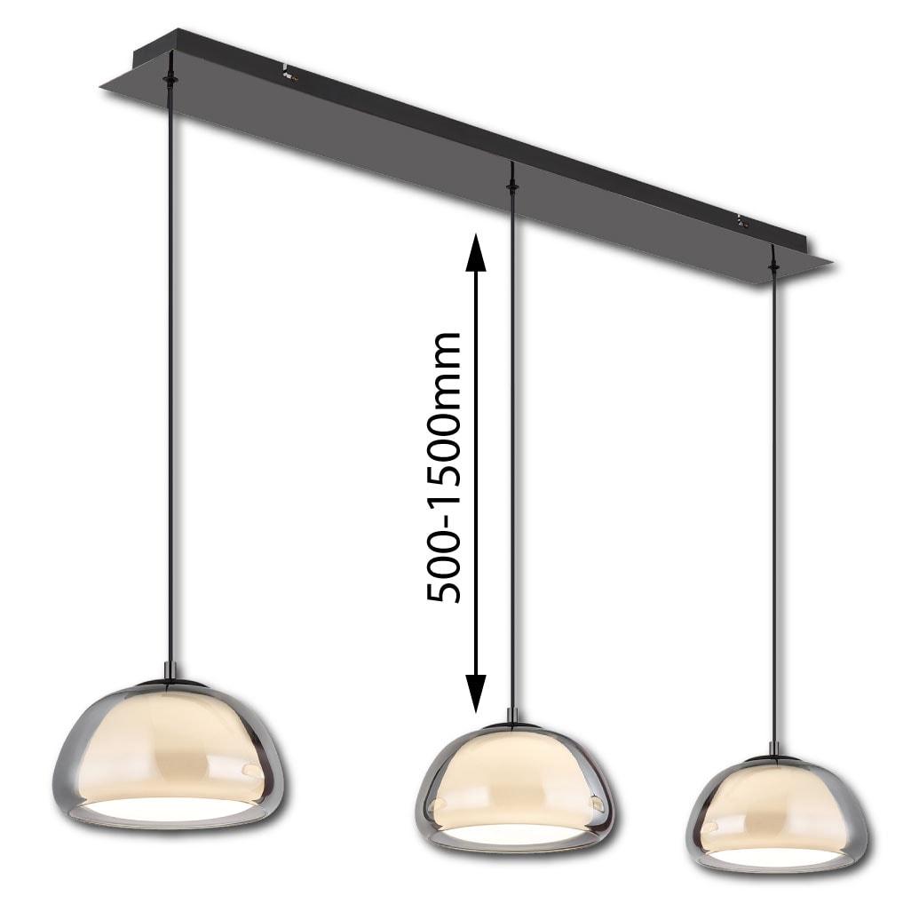 Pravougaona viseća lampa AVILA kombinuje moderan dizajn sa inovativnom tehnologijom. Kućište izrađeno od crnog i hromiranog metala daje privesnoj lampi elegantan i savremen izgled. Tri nijanse od dimljene boje i opalnog stakla sa unutrašnjim staklom osiguravaju ravnomjernu distribuciju svjetlosti i dodaju elegantne akcente vašoj sobi. Sa daljinskim upravljačem koji je uključen u isporuku, možete prigušiti svjetlo prema vašim željama, podesiti temperaturu boje od 2700 K do 6500 K i popraviti različite boje. Funkcija memorije pamti vaše željene postavke, a noćno svjetlo pruža meko svjetlo noću. Sa impresivnom snagom lumena od 2700 lumena, viseće svjetlo AVILA ne samo da nudi odličnu svjetlinu, već i ugodnu atmosferu. Uključujući LED sijalice, nudi savršenu kombinaciju funkcionalnosti i dizajna – idealno za moderne životne prostore.
