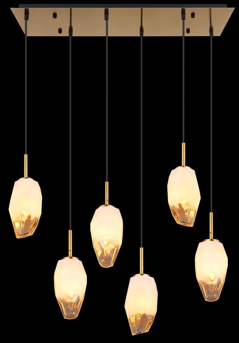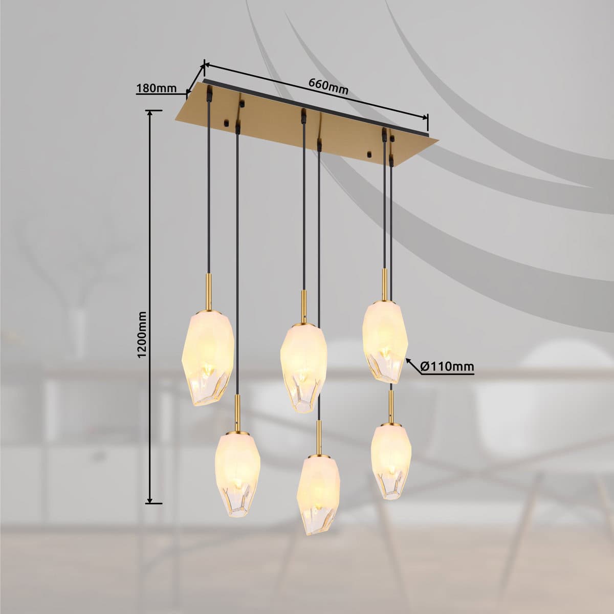 Viseća lampa BARCLEY serije od metala u mesinganoj boji sa opalom i prozirnim staklom je moderan izbor za svaku prostoriju. Kabl u PVC crnoj boji daje lampi moderan štih. Lampa je dimenzija 720x240x1200mm, što je čini odličnim izborom za sobe srednje veličine. Za svetiljku je potrebno 6x E14 LED 7W 230V (nije uključeno) i obezbeđuje jako i efikasno osvetljenje. Opal i prozirno staklo proizvode difuzno i ugodno svjetlo. Ova viseća lampa je savršena za sve koji traže elegantno i efikasno rešenje za osvetljenje.