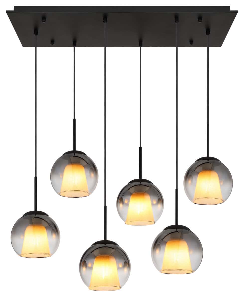 Pravougaona visilica BARRY sa šest staklenih kuglica je impresivan rasvjetni element koji će zablistati svaku prostoriju. Kućište izrađeno od mat crnog lakiranog metala pruža moderan izgled, dok staklene kuglice u boji dima sa jasnim gradijentom i unutrašnjim kristalnim staklom daju plemenit izgled. Sa dimenzijom od 900 mm dužine i 380 mm širine, ova viseća lampa je idealna za velike trpezarije ili otvorene kuhinje. Prozirni stakleni kristali unutar sfera pružaju blistave svjetlosne efekte i stvaraju privlačnu atmosferu. Sa grlom E27, BARRY visilica nudi fleksibilne opcije osvjetljenja i može se savršeno integrirati u vaš individualni životni koncept.