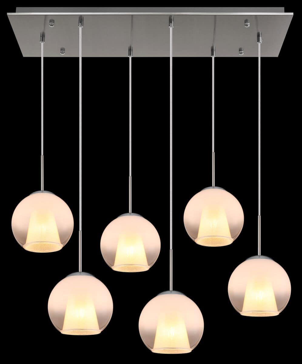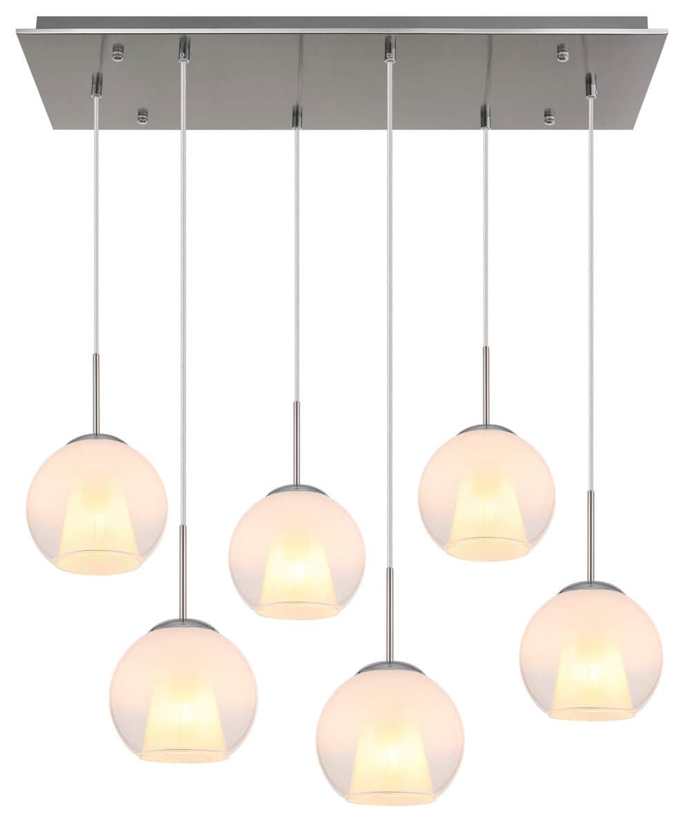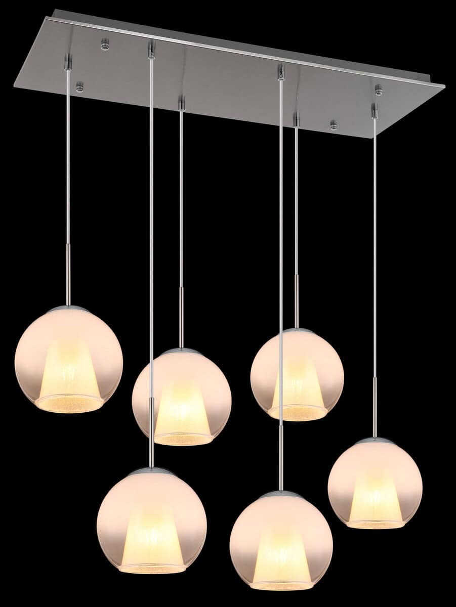 Pravougaona visilica BARRY sa šest staklenih sfera kombinuje elegantan dizajn sa funkcionalnošću. Sa dužinom od 900 mm i širinom od 380 mm, savršen je za velike trpezarije ili kuhinje. Kućište od nikl-mat metala i hromiranog metala naglašava modernu estetiku. Opalne i prozirne staklene kuglice osiguravaju ravnomjernu i ugodnu raspodjelu svjetlosti. Kristalni akcenti u unutrašnjosti postavljaju dodatne naglaske i stvaraju harmoničan svjetlosni ambijent. Utičnica E27 omogućava individualni dizajn rasvjete.