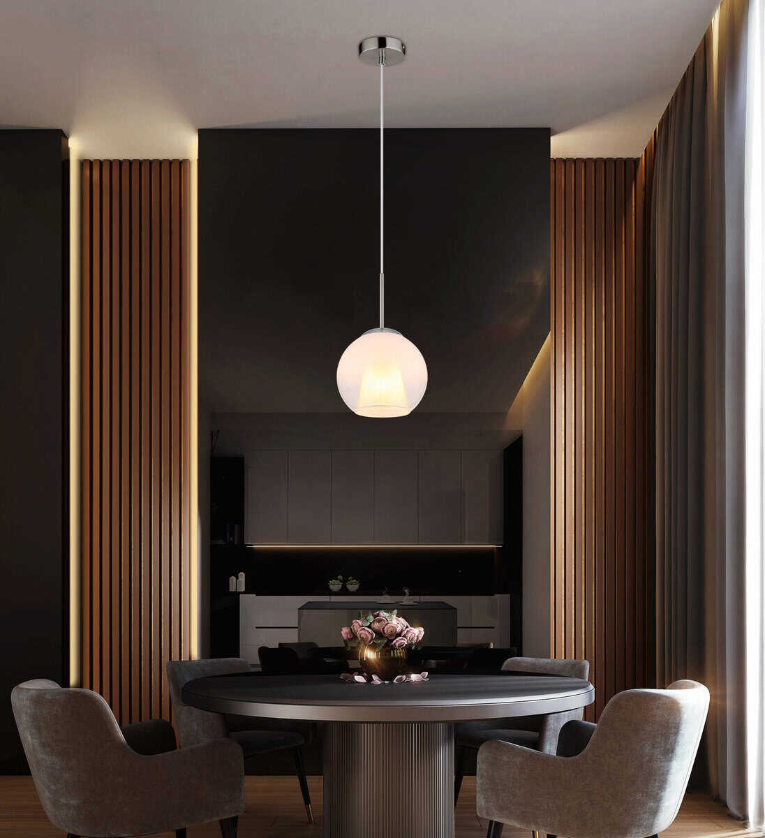 Okrugla visilica BARRY uvjerava svojom elegantnom staklenom kuglom prečnika 200 mm. Kućište od niklovanog mat i hromiranog metala daje lampi moderan izgled. Opalna, prozirna staklena sfera s gradijentom dizajna pruža harmonične svjetlosne akcente i toplu atmosferu. Ova lampa je idealna za trpezarije ili kao dekorativni element u bilo kojoj prostoriji. Unutrašnji kristali stvaraju dodatne svetlosne efekte, dok E27 utičnica nudi fleksibilne opcije osvetljenja.