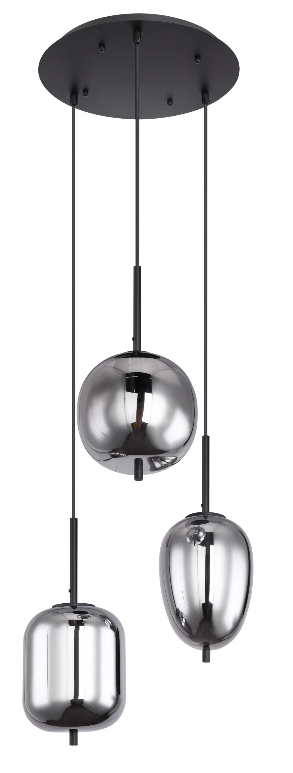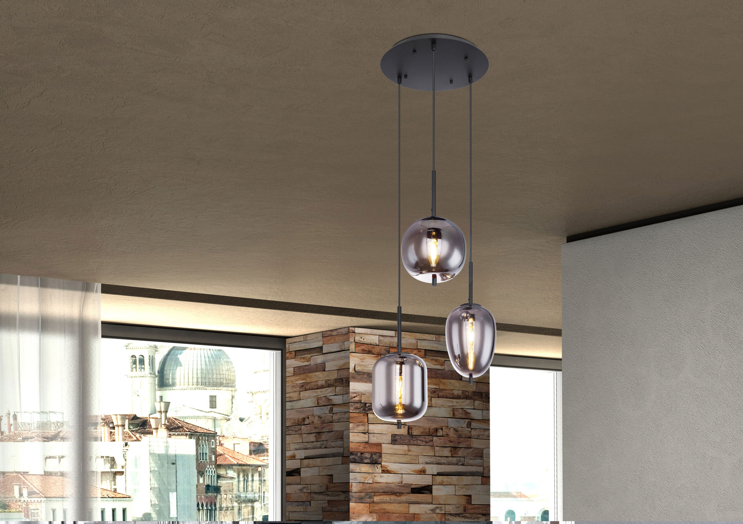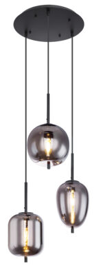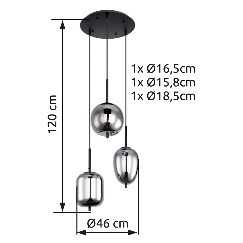 Ova visilica BLACKY (Ø 46cm) izrađena je od crnog metala sa staklima u boji dima. Tri viseće čaše su individualne po svojoj prezentaciji i veličini. Ova umjetnička svjetiljka prečnika 120 cm ima tri E14 grla (sa maks. 40 vati), što omogućava slobodan izbor sijalica. Zbog njihove izdržljivosti i uštede energije preporučujemo LED izvor svjetlosti. Ova viseća lampa je idealna za vaš dnevni boravak i trpezariju.