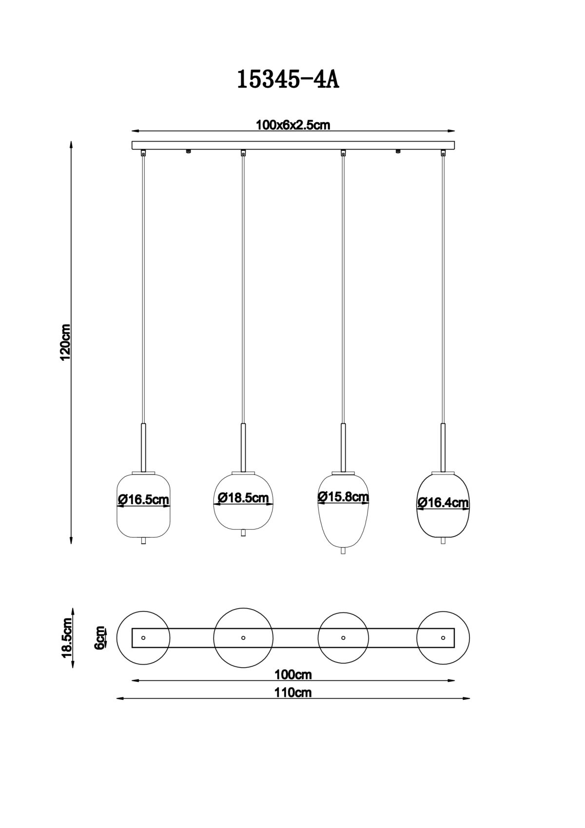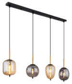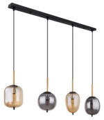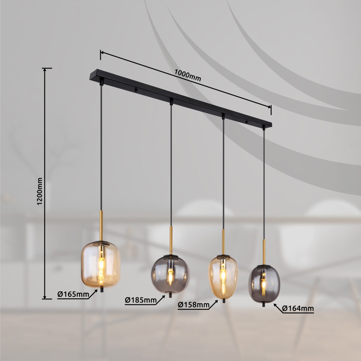Ova moderna visilica iz serije Blacky oduševit će mlade i stare. Četiri kabla dužine 1,2 m vire iz pravougaonog plafonskog uređaja i svaki kraj na E14 utičnici sa uobličenim staklenim sjenilima u različitim oblicima i bojama (jantarne, dimljene boje). E14 utičnice vam omogućavaju da sami odredite boju svjetla i svjetlinu do maksimalne snage od 40 vati. Zbog izdržljivosti i uštede energije preporučujemo LED sijalice.