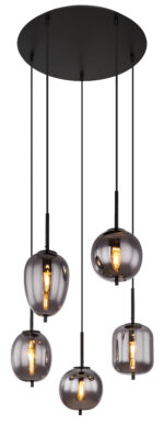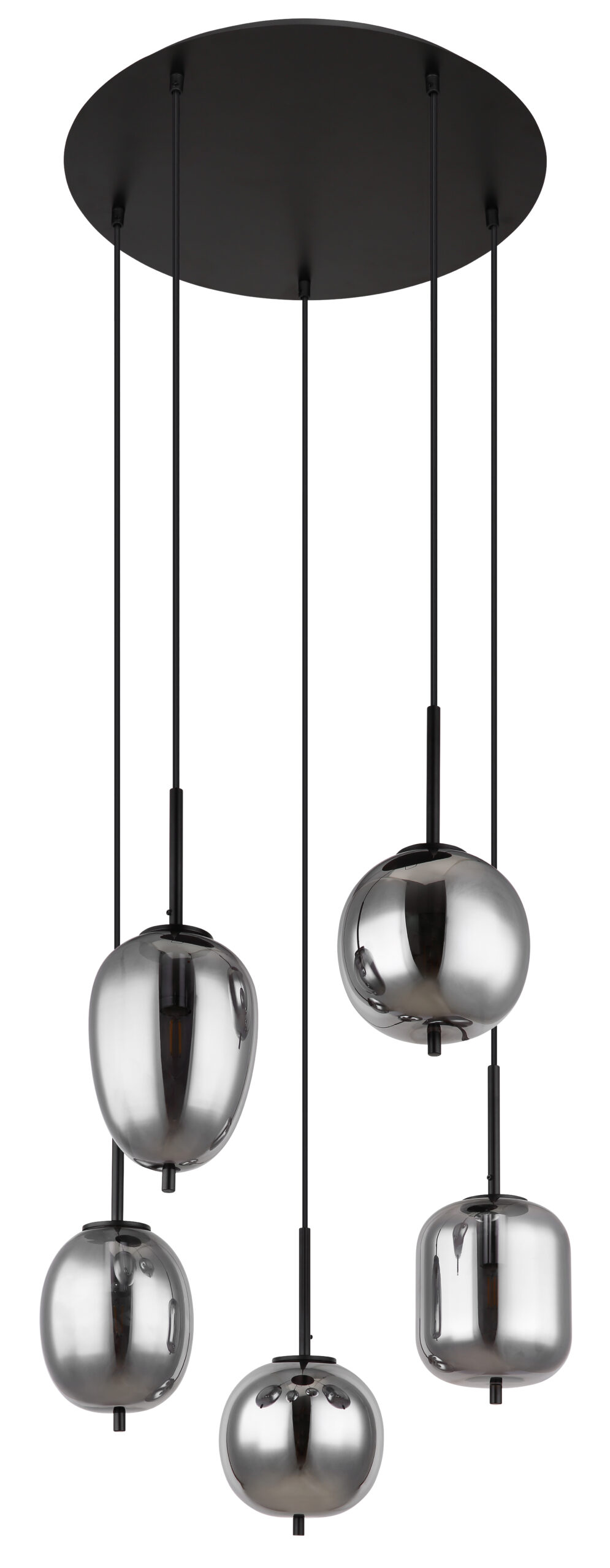 Sjajna visilica iz serije Blacky inspirira mlade i stare. Od crnog okruglog plafonskog priključka, 5 užadi se protežu do 1,5 m od plafona i teku do E14 utičnice. Svaka E14 utičnica ima nijansu u boji dima u različitim oblicima i pruža odličnu ukupnu sliku. E14 utičnice vam omogućavaju da sami odredite boju svjetla i svjetlinu do maksimalne snage od 40 vati. Postavite nove akcente u svoje prostorije.
