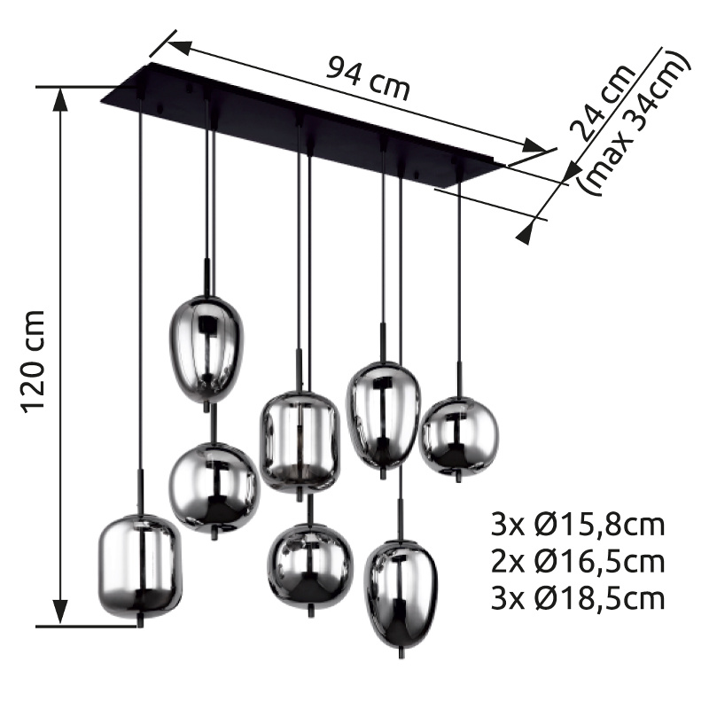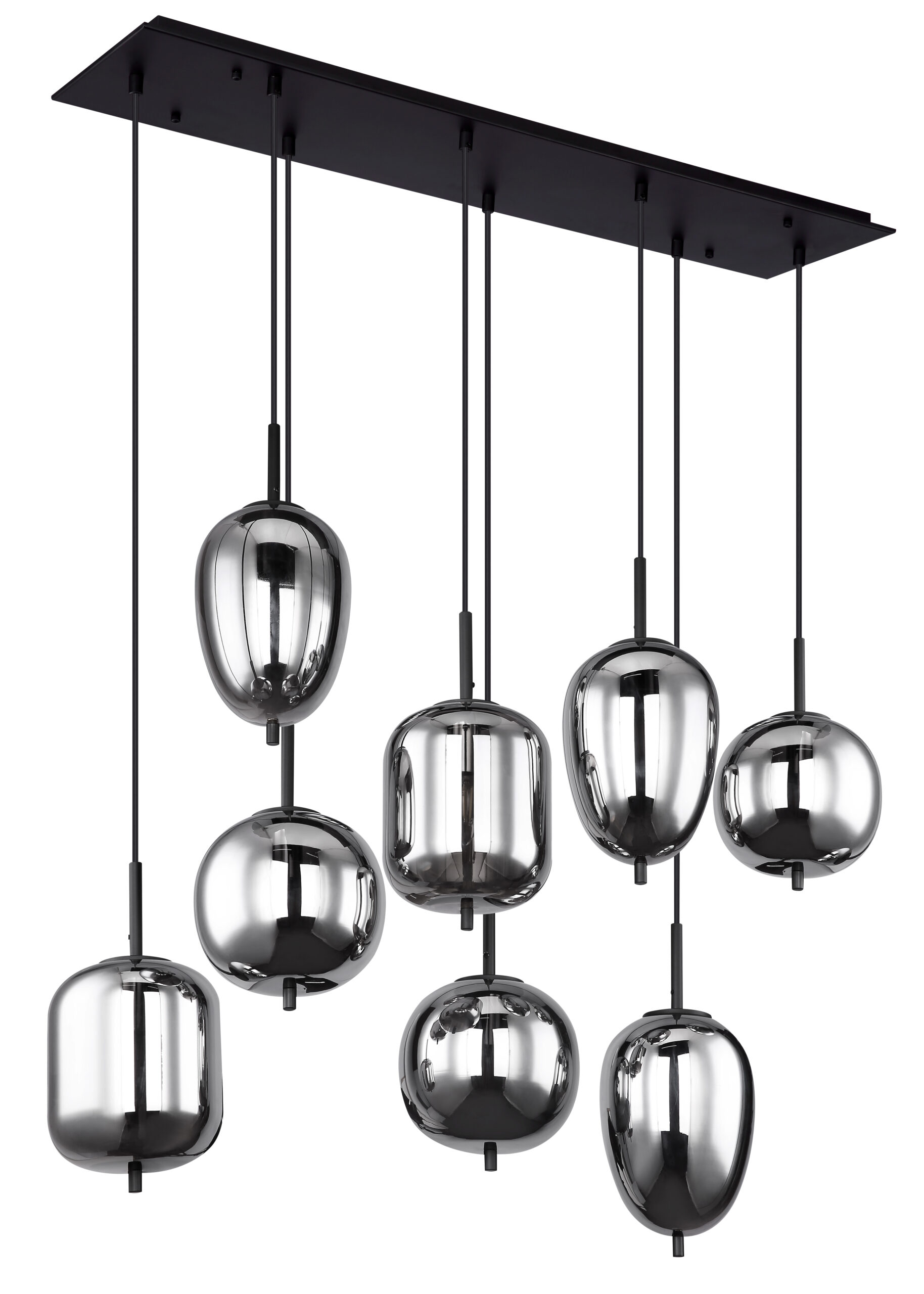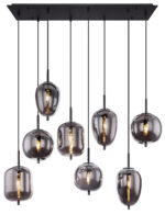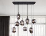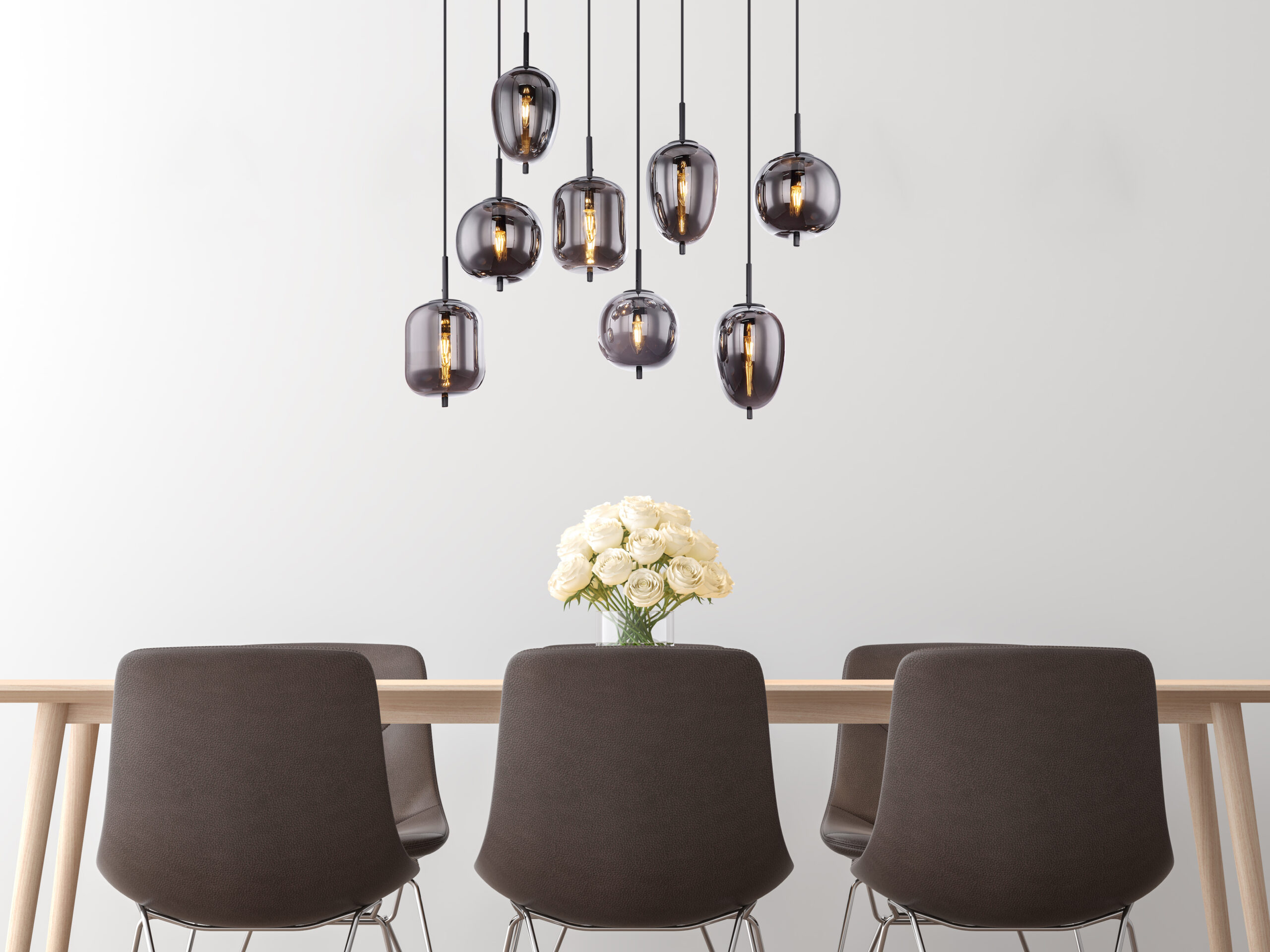 Ova viseća lampa BLACKY izrađena je od crnog metala sa staklima u boji dima. Osam visećih čaša su individualne po svojoj prezentaciji i veličini. Ova umjetnička lampa promjera 120 cm ima osam E14 grla (sa maks. 40 vati), što omogućava slobodan izbor sijalica. Zbog dugotrajnosti i uštede energije preporučujemo LED sijalice. Ova viseća lampa je idealna za vaš dnevni boravak i trpezariju.