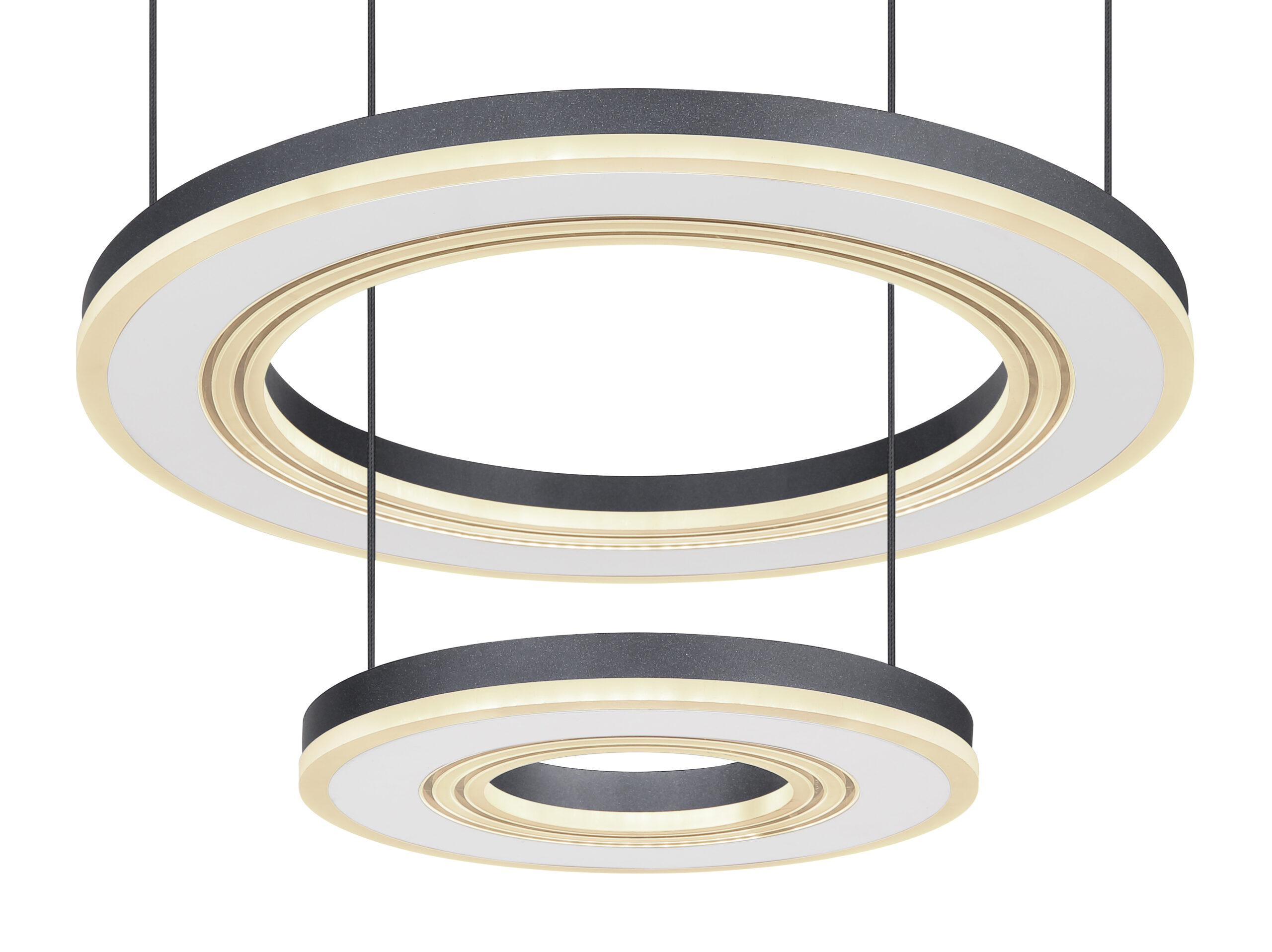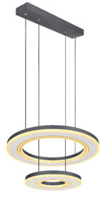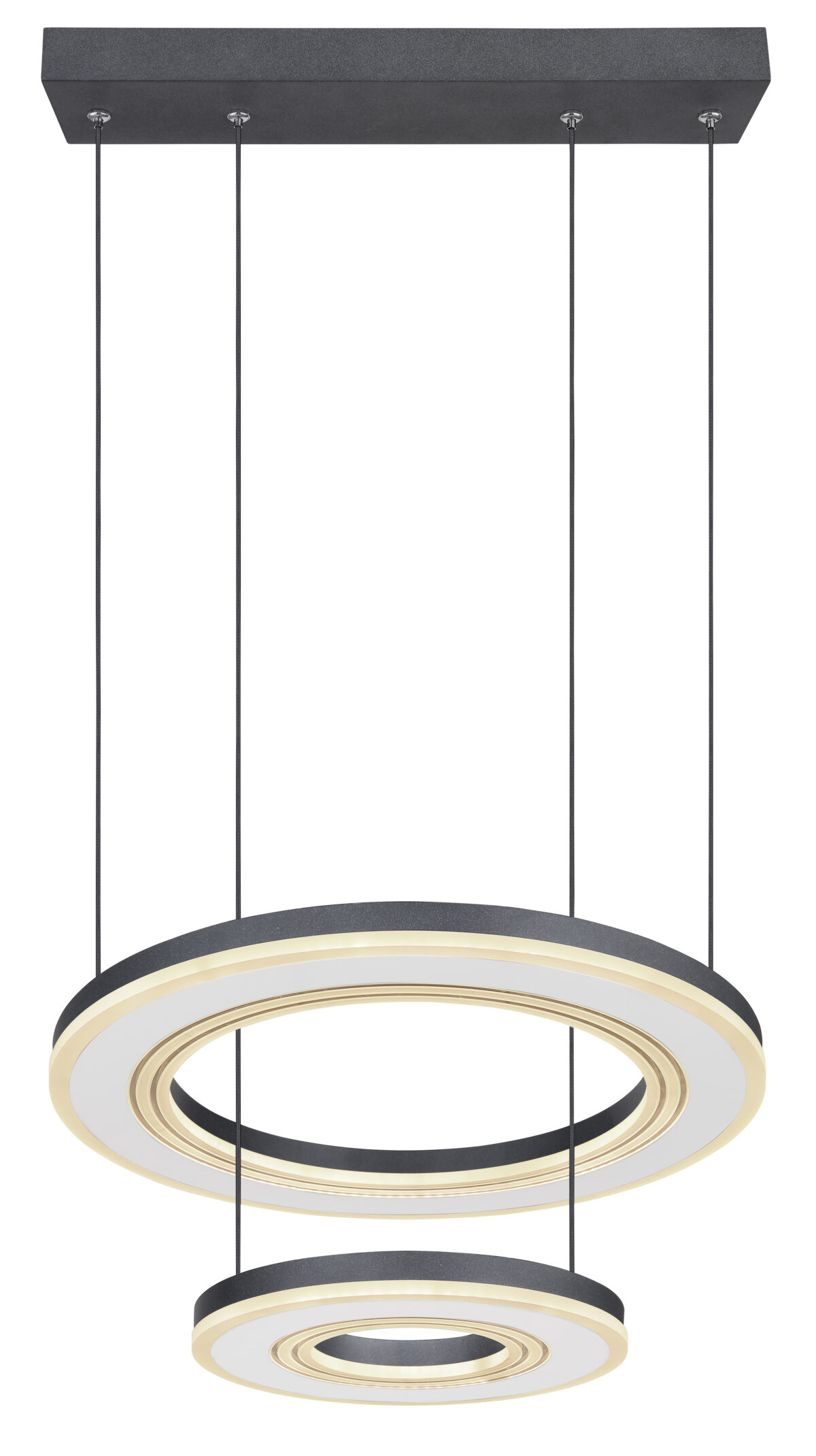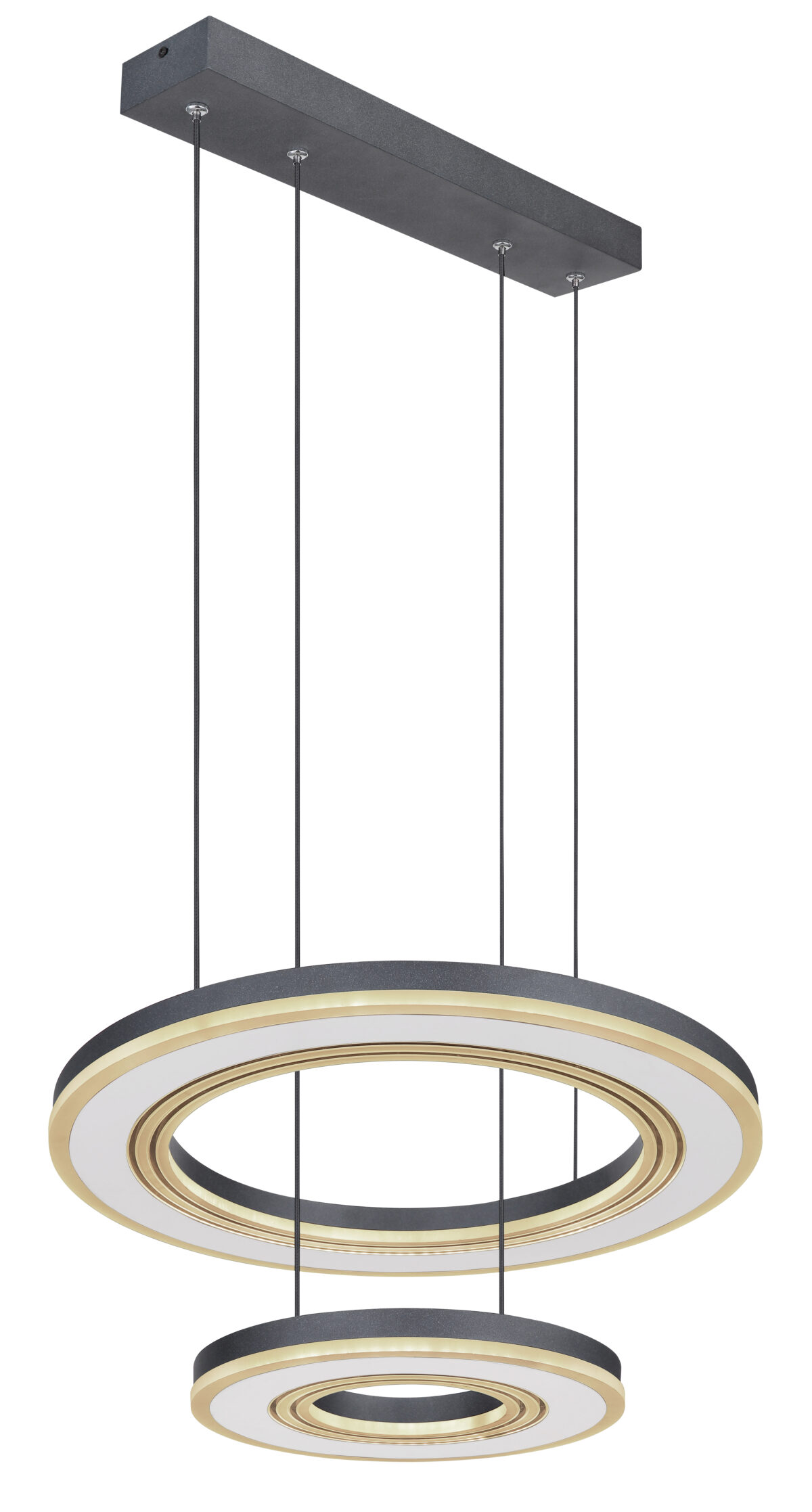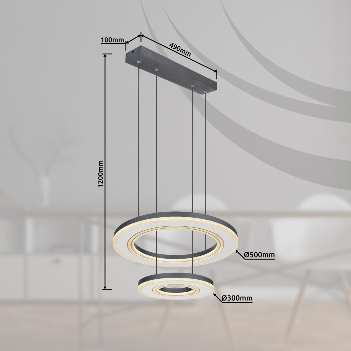 Ova okrugla viseća lampa iz serije Blasius (ø 50 cm) prekrasan je dodatak vašem interijeru. Sastoji se od dva crno-bijela zatamnjena metalna prstena različitih veličina na vrhu i bijele na dnu, koji vise sa stropa na po dva crna kabla i opremljeni su opalnim akrilom. Ovo pokriva uključene LED sijalice, koje pružaju 1800 lumena jakog svjetla, pri čemu možete podesiti boju svjetla u nekoliko faza između tople i hladne bijele (2700 do 6000 Kelvina) pomoću priloženog daljinskog upravljača. Na ovaj način možete prigušiti stropno svjetlo i imati funkciju noćnog svjetla. Osim toga, visina viseće lampe može se podesiti do 120 cm tokom ugradnje. Sa ostalim modelima iste serije možete upotpuniti cjelokupnu sliku u svoja četiri zida.