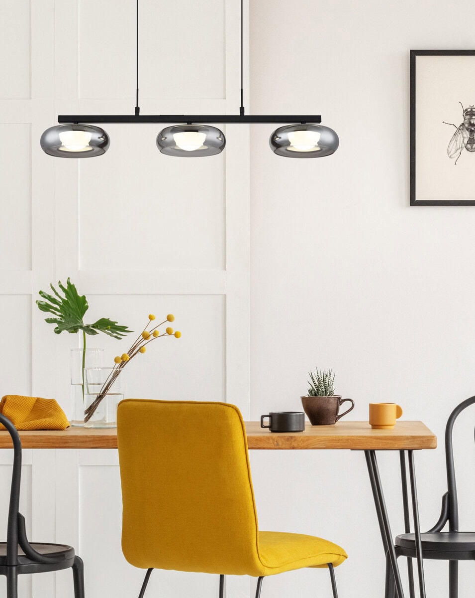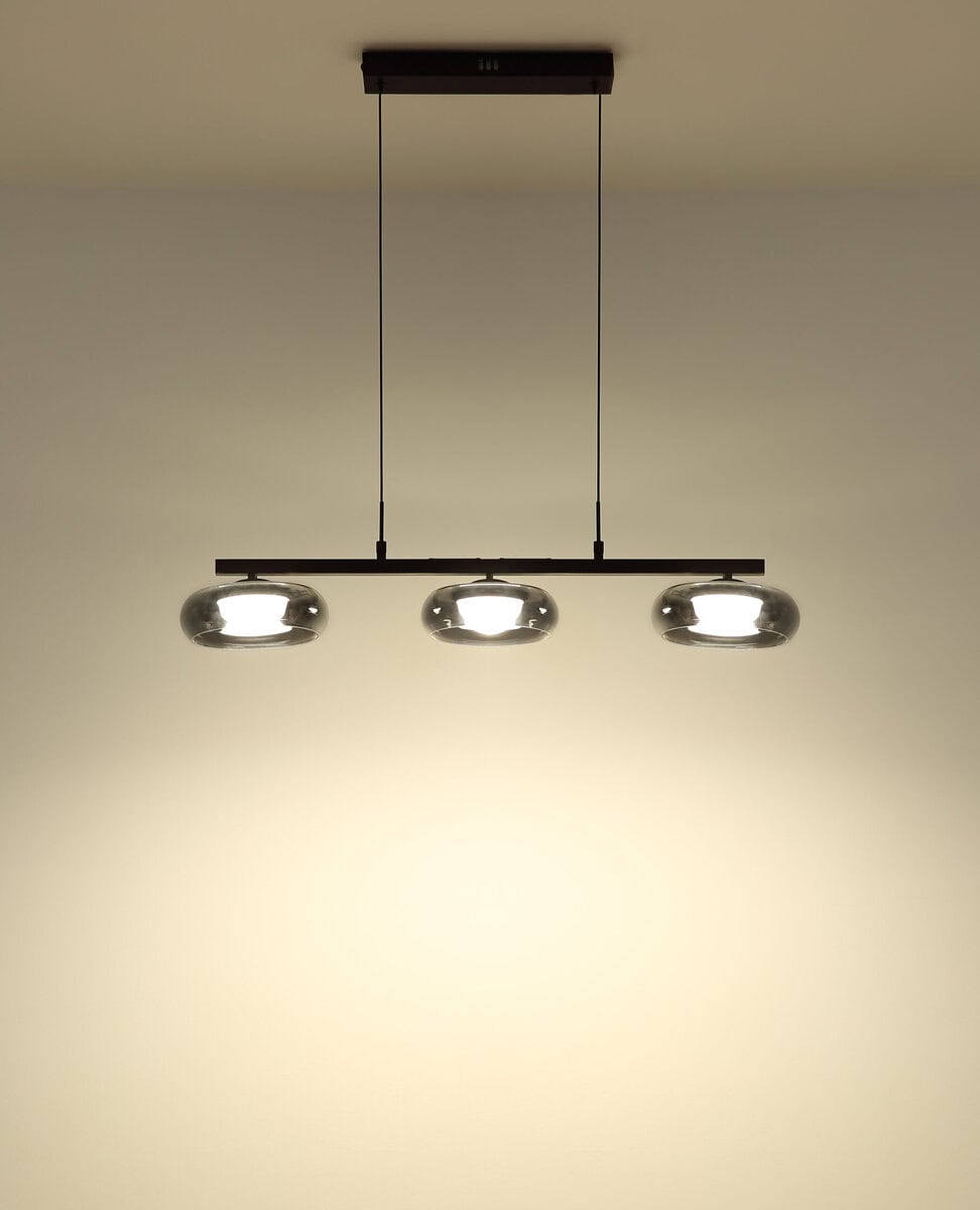 Izdužena visilica CARLENE kombinuje moderan dizajn sa inovativnom tehnologijom i visokom funkcionalnošću. Ravna greda sa tri okrugle, ravne nijanse impresionira čistim linijama i visokokvalitetnim kućištem od mat crnog metala, dodajući stilski naglasak svakoj prostoriji. Sjenila su izrađena od stakla u boji dima u kombinaciji s opal akrilom, nježno raspršujući svjetlost i pružajući ugodno osvjetljenje bez odsjaja. Sa svjetlosnom snagom od 1785 lumena i varijabilnom temperaturom boje (CCT) od 3000 do 6000 Kelvina, CARLENE se fleksibilno prilagođava različitim raspoloženjima i potrebama. Boje se mogu fiksirati, što vam omogućava da kreirate personalizovanu atmosferu osvetljenja. Zahvaljujući praktičnoj funkciji memorije, svjetlo pamti posljednju podešenu boju i svjetlinu svjetla. Uključujući LED tehnologiju koja štedi energiju, CARLENE je savršen izbor za moderne životne i radne prostore koji cijene dizajn i funkciju.