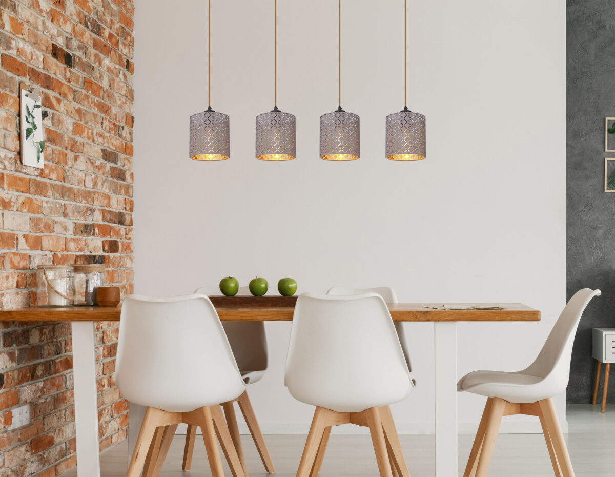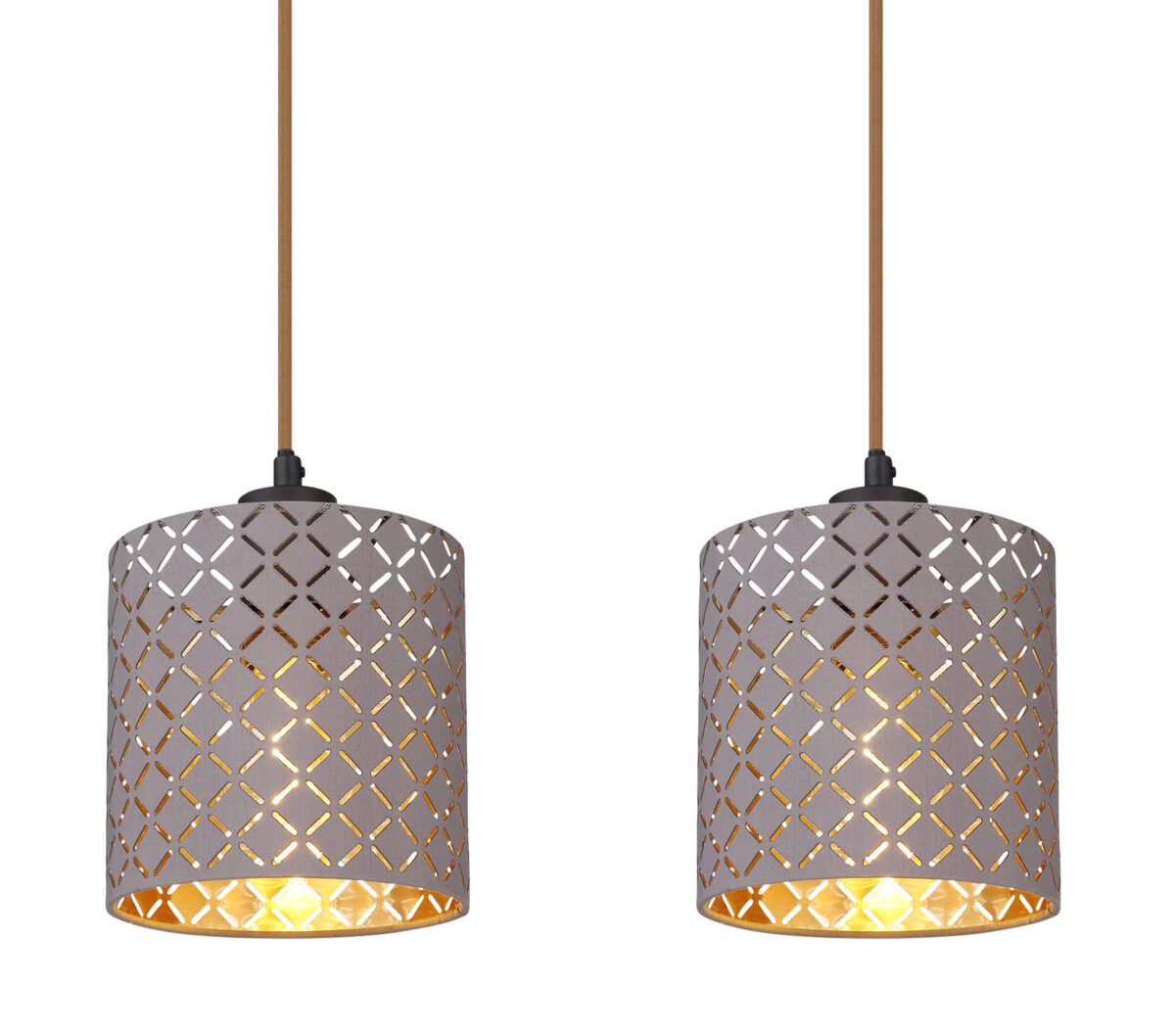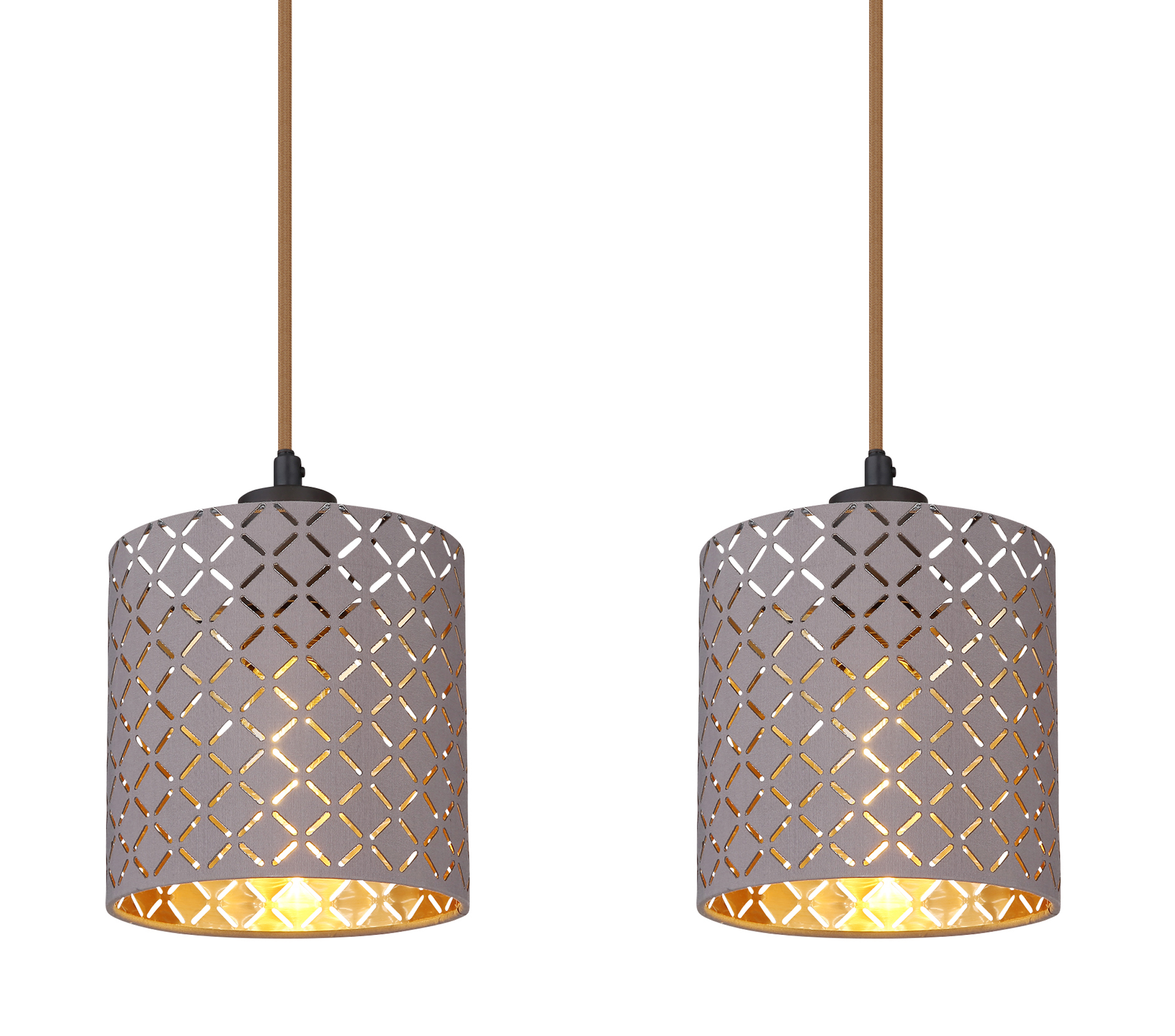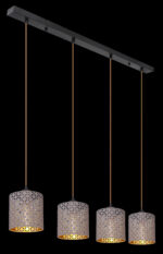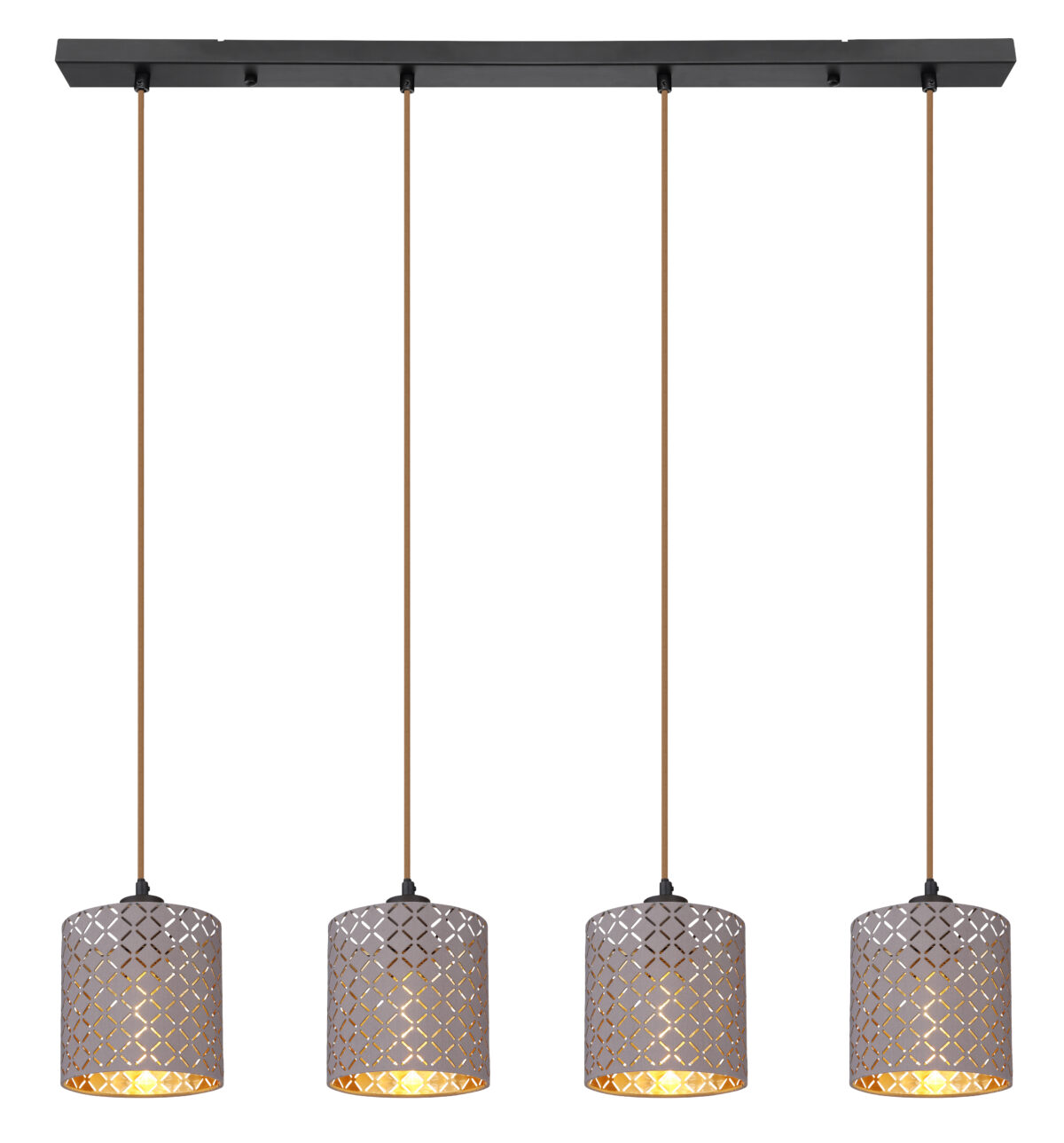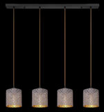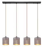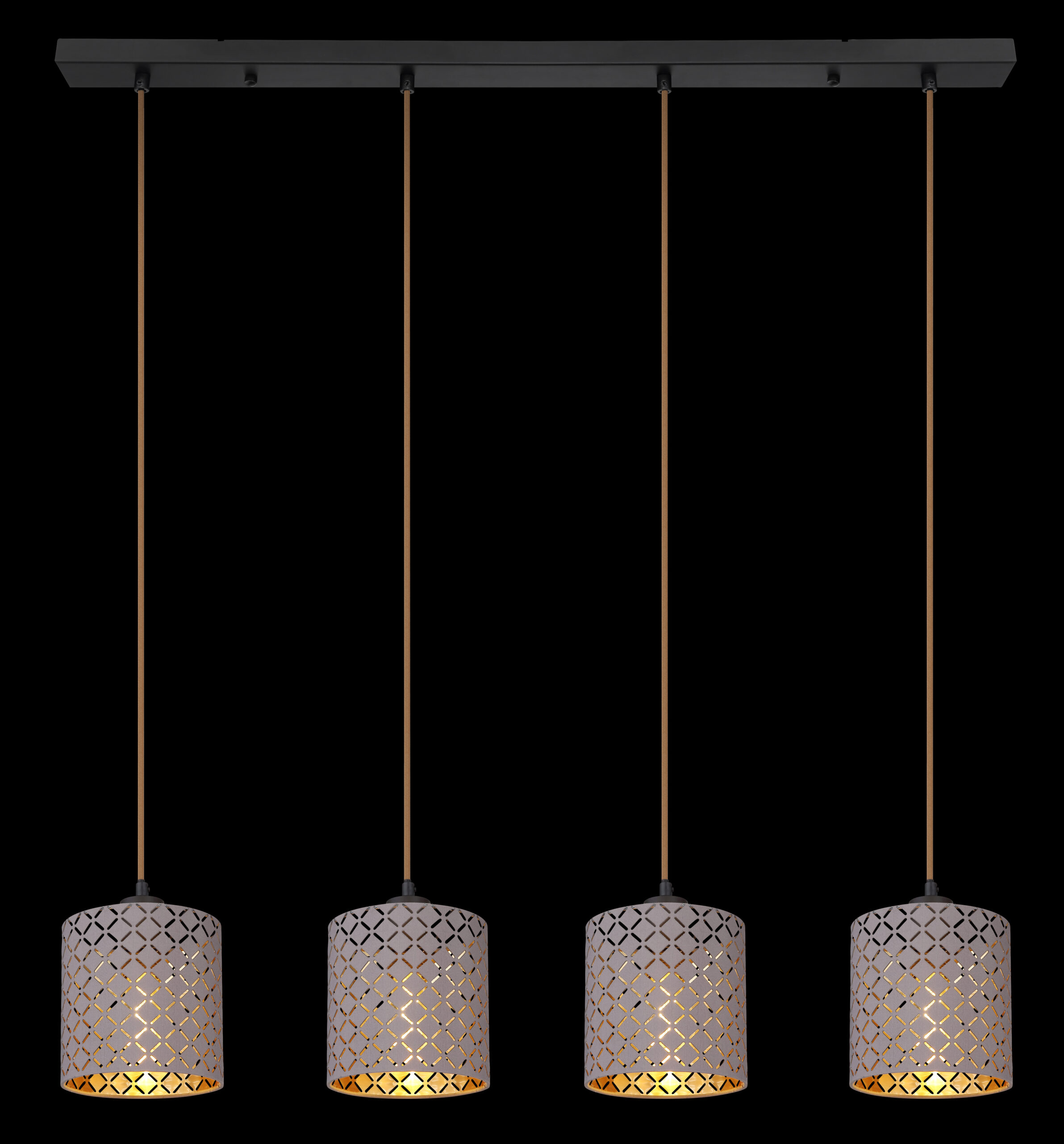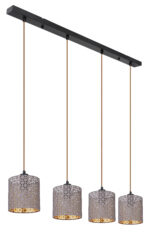 Ova viseća lampa iz Cindy serije je prekrasan dodatak vašem interijeru. Viseća lampa dužine 98 cm sastoji se od crno-mat metalne grede na kojoj vise četiri kabla sa sivim tekstilnim sjenilima sa elegantnim mrežastim šarama. One mogu biti opremljene sijalicama E27 po vašem izboru, što vam omogućava da individualno odredite boju svjetla i svjetlinu. Osim toga, visina svetiljke se može podesiti na 150 cm tokom ugradnje. Sa ostalim modelima iste serije možete upotpuniti cjelokupnu sliku u svoja četiri zida.