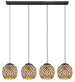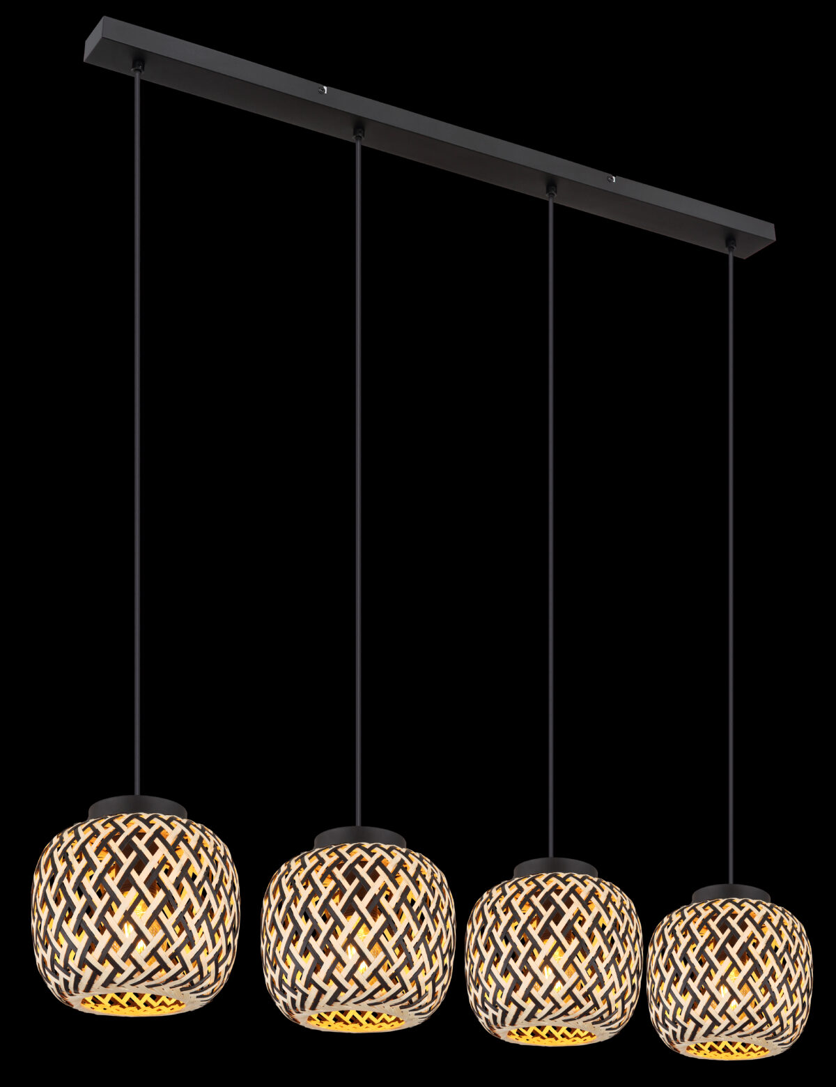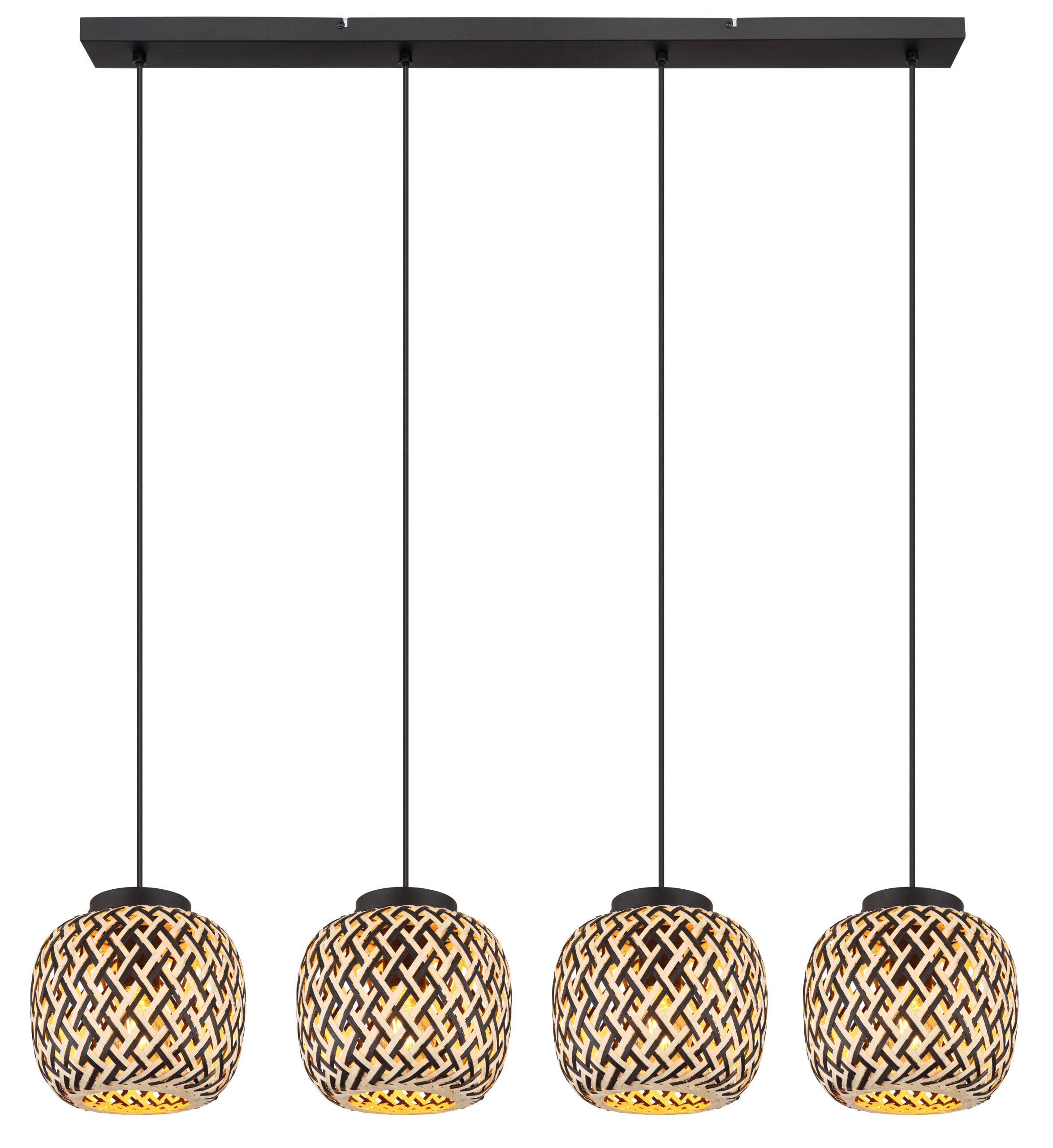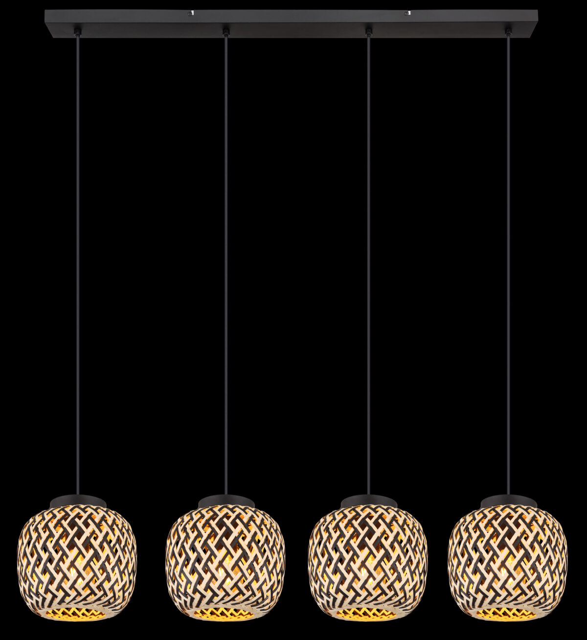 Ova prekrasna visilica serije COLLY inspirira sjajnom izradom od bambusa i metala. Četiri crna kabla dužine 1,2 m, svaki sa E27 utičnicom, vode na uskom plafonskom priključku (1 m) od crnog mat metala. Svaki od njih je opremljen sa sjenilom od bambusa (Ø 20 cm) u crnoj i prirodnim bojama i daju vam priliku da odredite boju svjetla i svjetlinu do maksimalne snage od 15 vati.