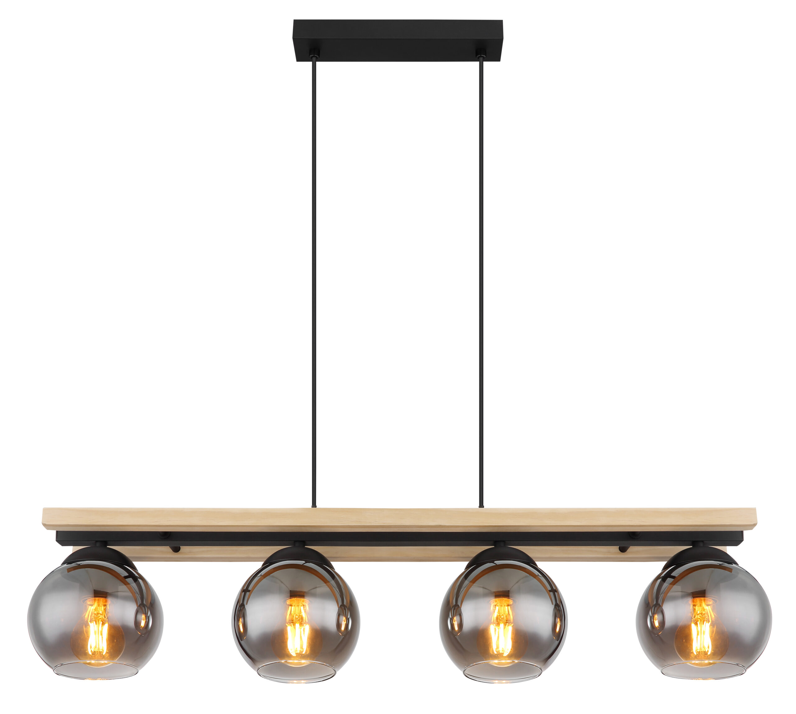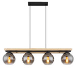 Ova sjajna viseća lampa inspiriše sjajnim dizajnom. Iz pravokutnog plafonskog priključka vire 2 crna mat konopa do 85 cm dugačke balansne šipke na kojoj se nalaze četiri E27 utičnice sa prekrasnim staklenim sjenilima u boji dima. E27 utičnice vam omogućavaju da sami odredite boju svjetla i svjetlinu do maksimalne snage od 25 vati. Zbog dugovečnosti i uštede energije preporučujemo LED sijalice.