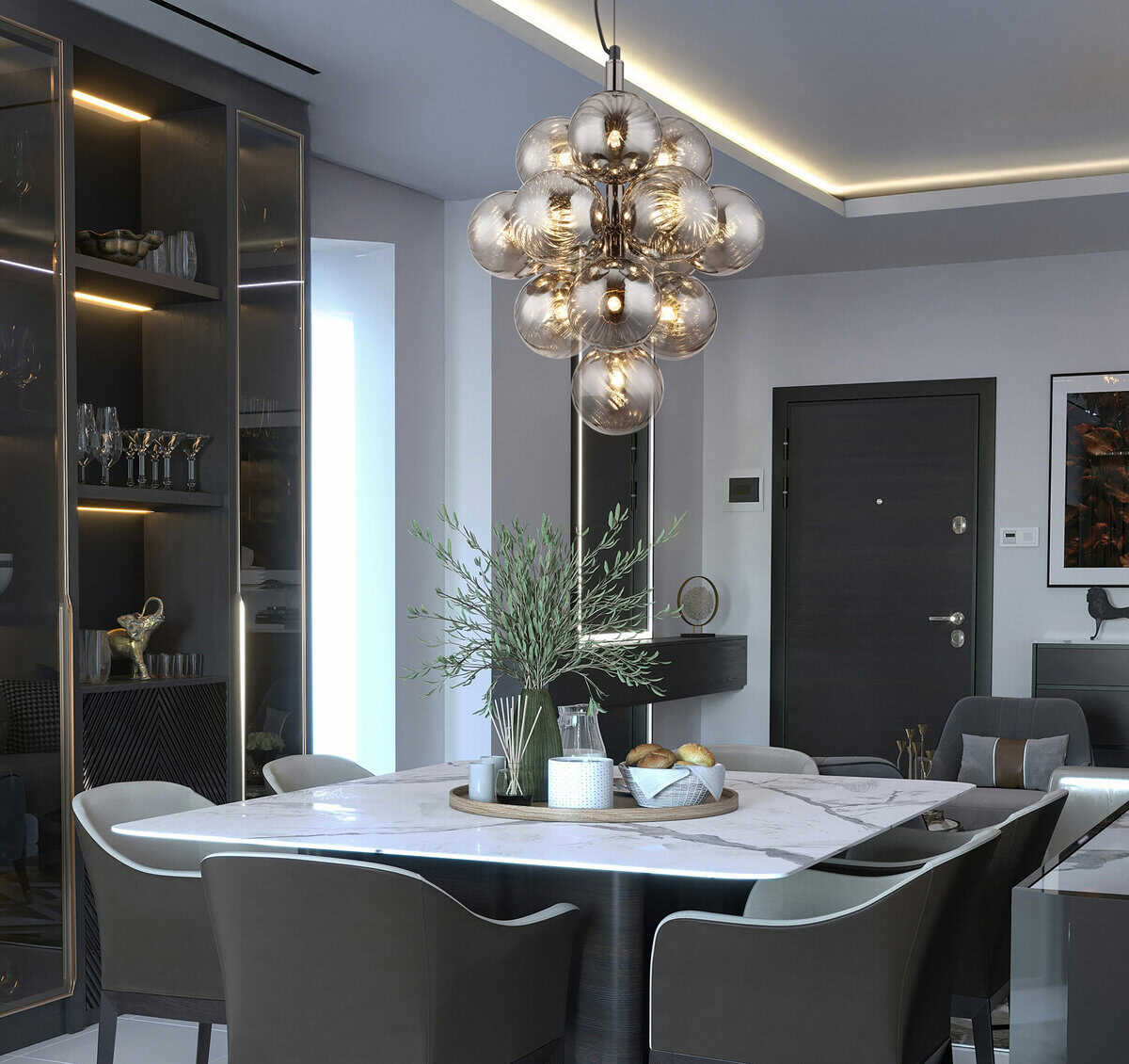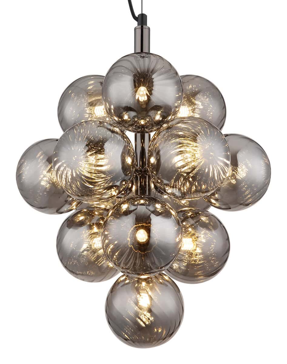 Viseća lampa CONOR u crnom i hromiranom dizajnu sa staklenim sferama u boji dima postavlja moderne akcente i nudi elegantno osvetljenje. Pogodno za G9 LED sijalice (ekskluzivno).