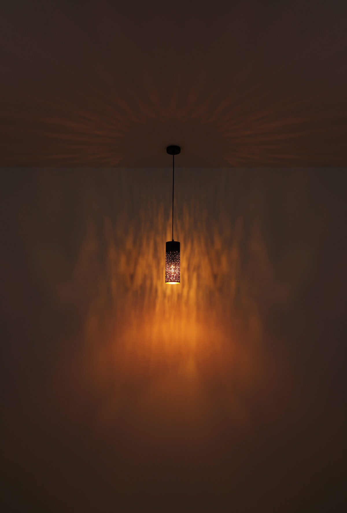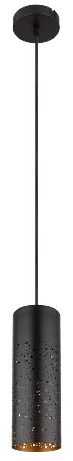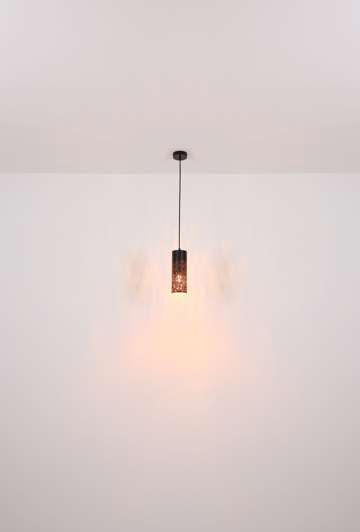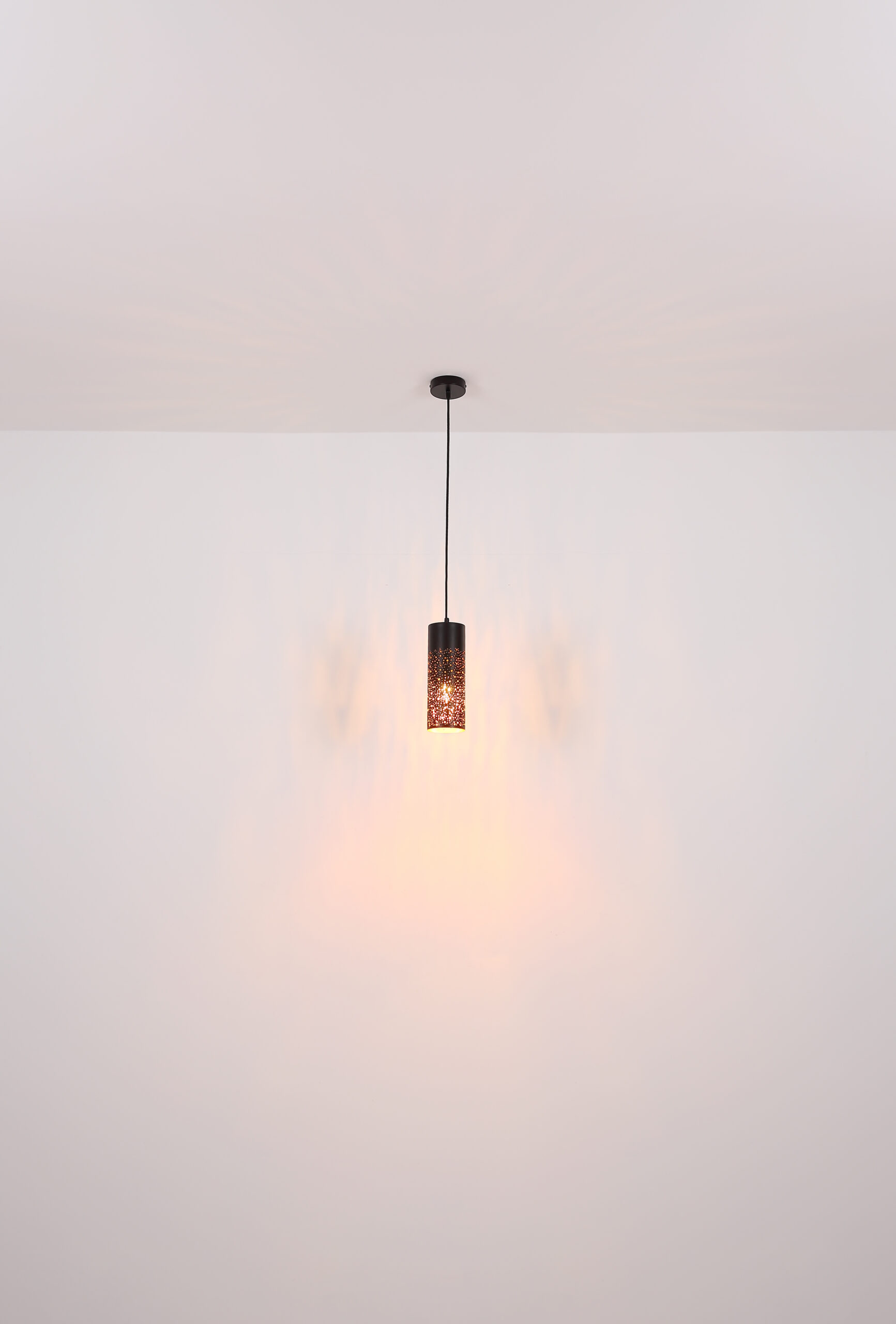 Ova viseća lampa serije CROCKY izrađena je od crnog metala i cilindričnog stakla sa ukrasnim perforacijama (Ø 10 cm). Kabl dužine 1,5 m viri iz okruglog plafonskog držača, koji se završava na E27 utičnici sa lepršavim sjenilom. E27 utičnica vam omogućava da odredite boju svjetla i svjetlinu do maksimalne snage od 40 vati. Zbog dugovečnosti i uštede energije preporučujemo LED sijalice