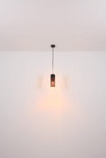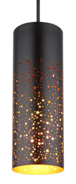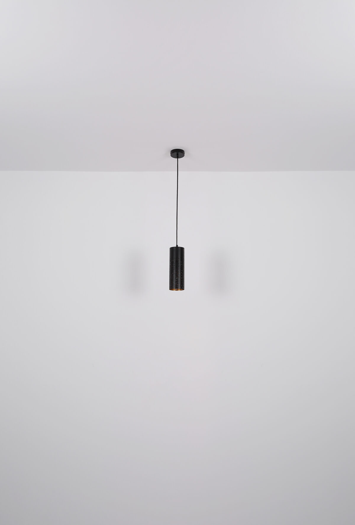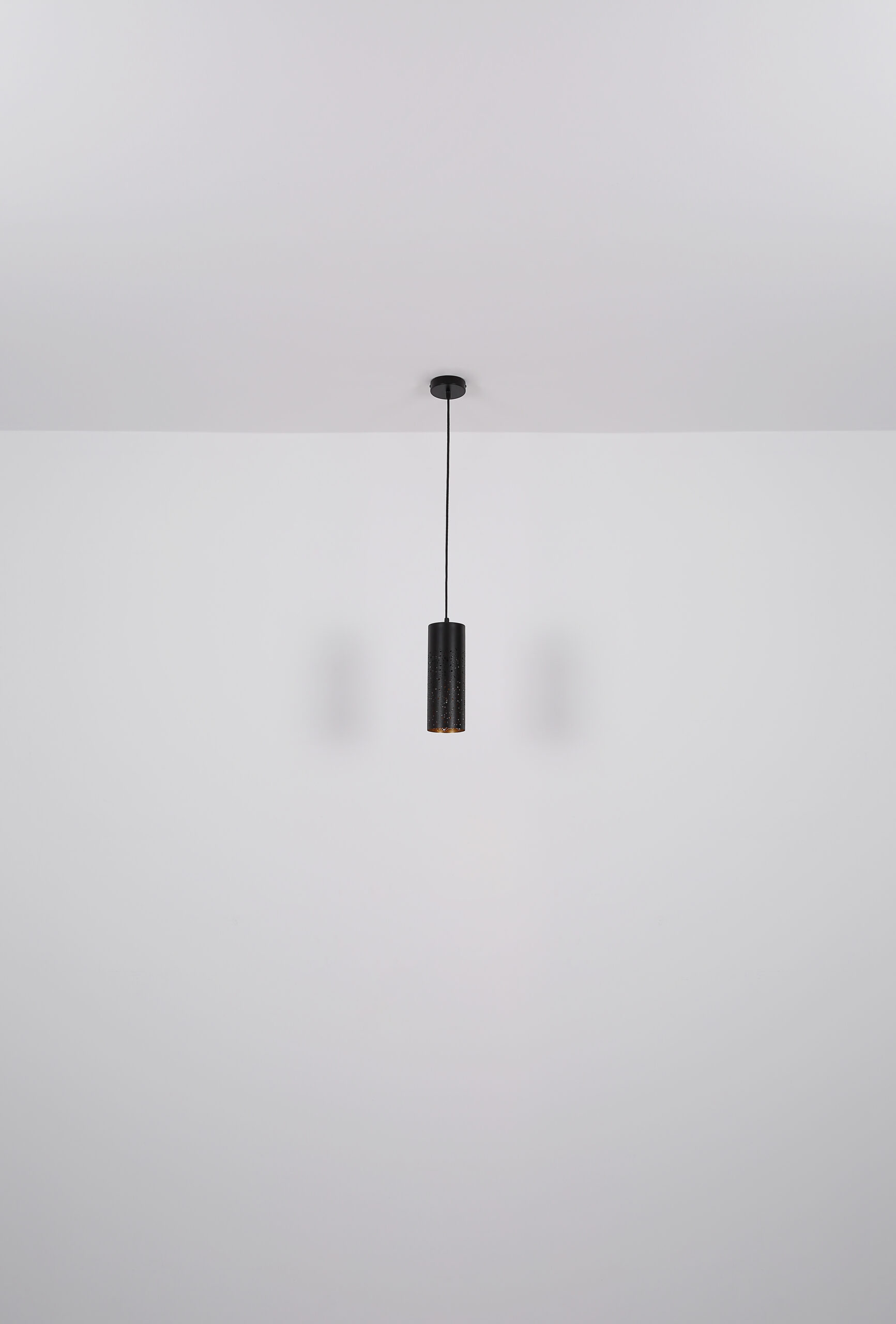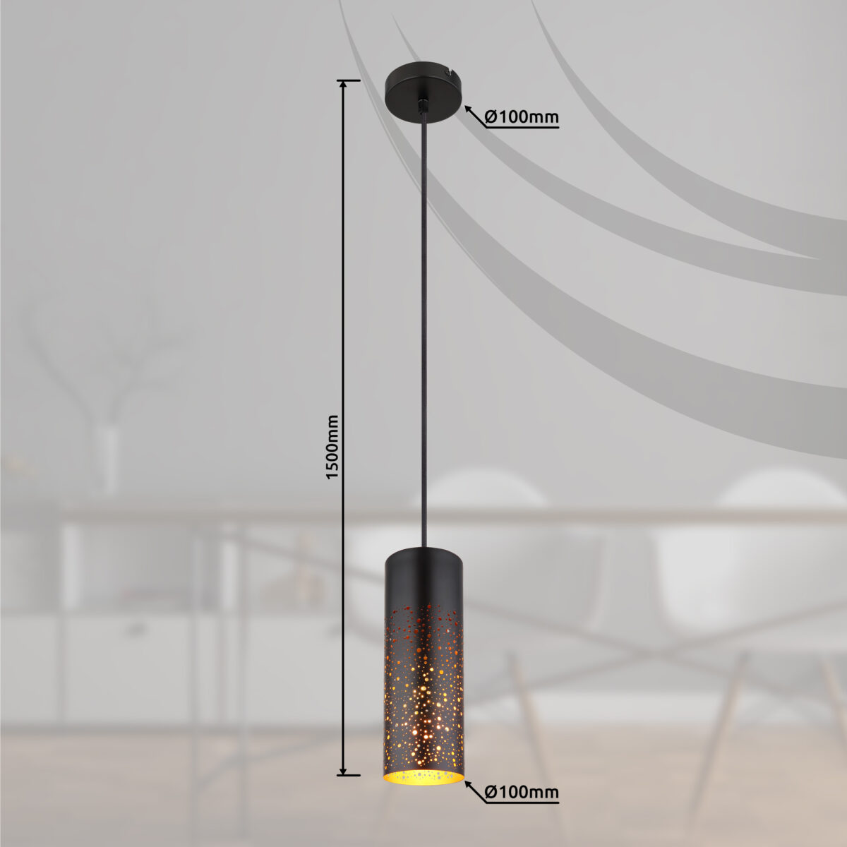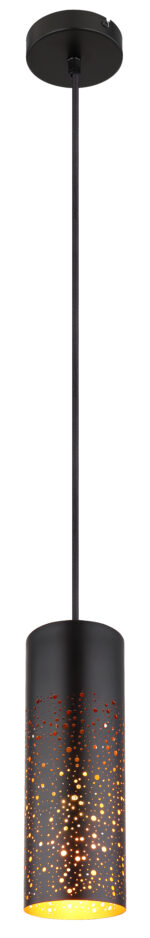Ova viseća lampa serije CROCKY izrađena je od crnog metala i cilindričnog stakla sa ukrasnim perforacijama (Ø 10 cm). Kabl dužine 1,5 m viri iz okruglog plafonskog držača, koji se završava na E27 utičnici sa lepršavim sjenilom. E27 utičnica vam omogućava da odredite boju svjetla i svjetlinu do maksimalne snage od 40 vati. Zbog dugovečnosti i uštede energije preporučujemo LED sijalice