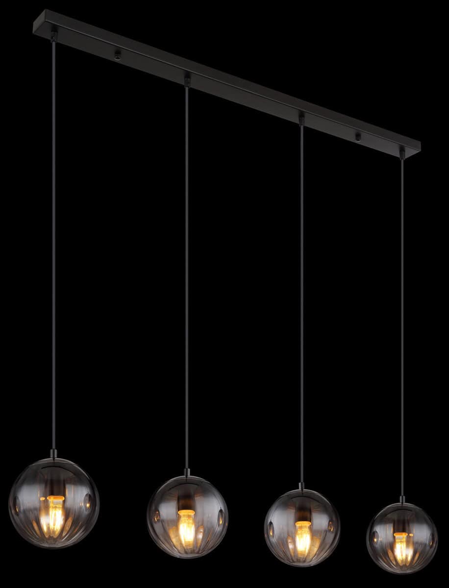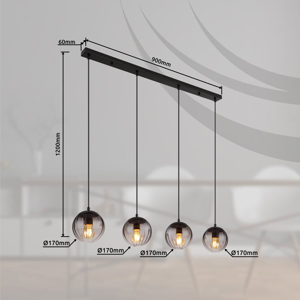Visina lampe je dužine 1040 mm, širine 170 mm i visine 1200 mm. Izrađen je od crnog, mat metala i stakla u boji dima koje ima jasan gradijent. Kabl je crne boje i izrađen od PVC-a. Napominjemo da se visilica isporučuje bez sijalica. Potrebne su 4x E27 60W 230V sijalice. Lampa je moderan i elegantan rasvjetni element, savršen za dnevni boravak, blagovaonicu ili spavaću sobu. Svojim staklom u boji dima i jasnim nagibom stvara ugodnu atmosferu u svakoj prostoriji.
