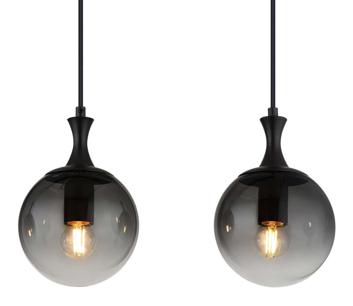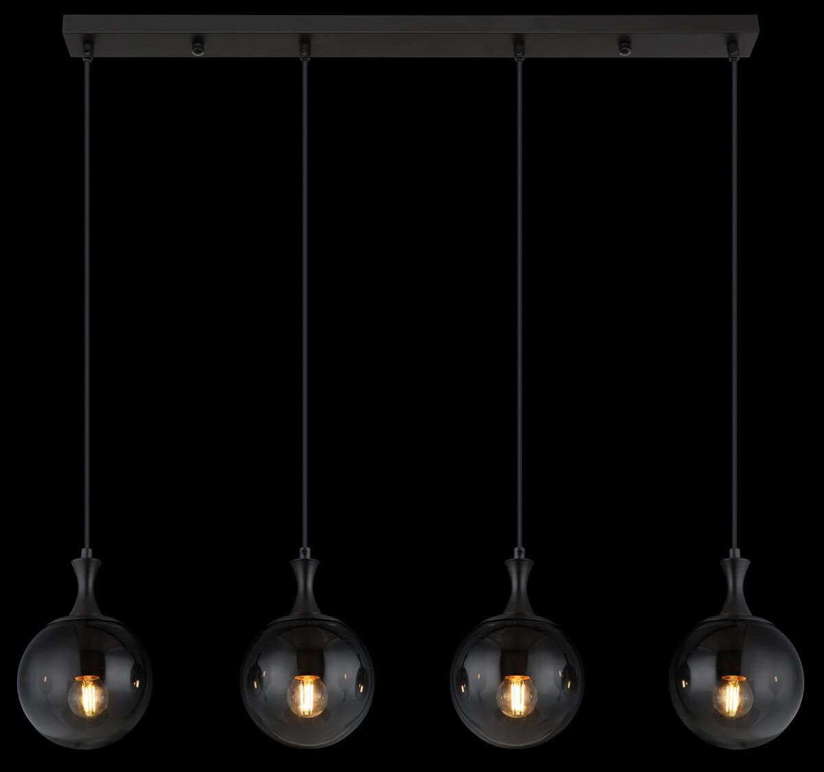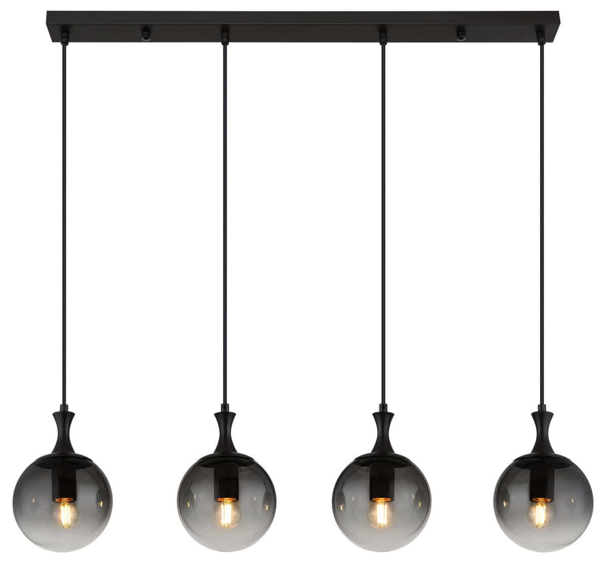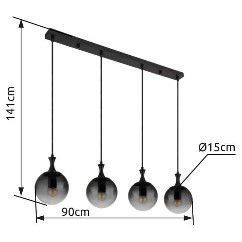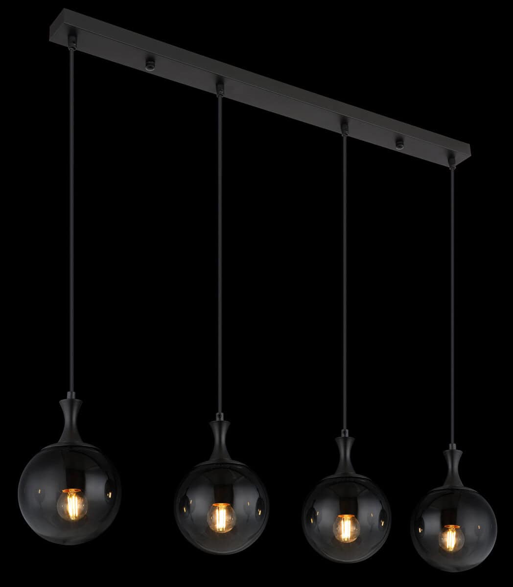 Viseća lampa DALTON nudi izdužen dizajn sa četiri staklene kugle koje pružaju ujednačeno i elegantno osvjetljenje u izgledu boje dima. Crno, mat metalno kućište upotpunjuje elegantan izgled. Pogodno za E27 ILLU sijalice (ekskluzivno).