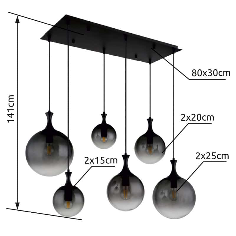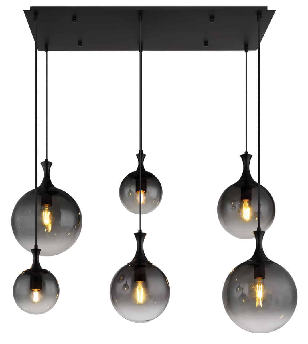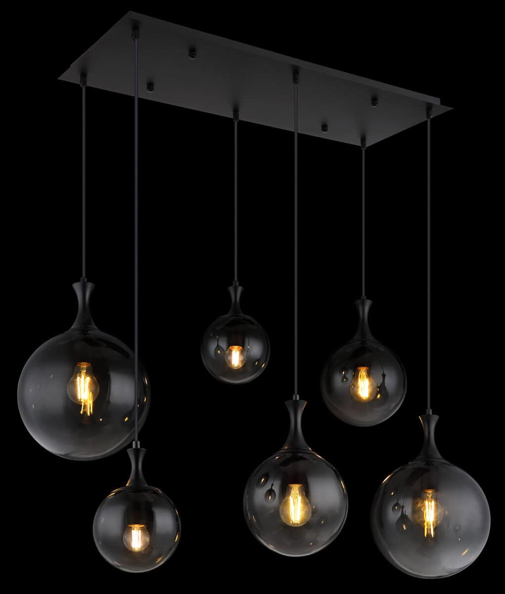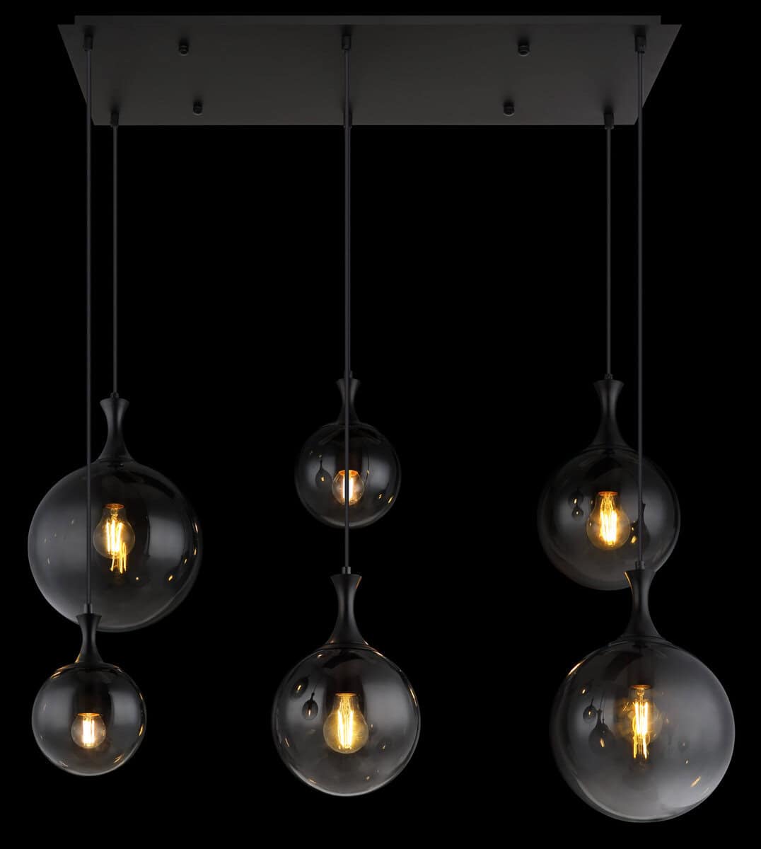 Viseća lampa DALTON impresionira svojim pravokutnim dizajnom i šest elegantnih staklenih sfera koje svjetlucaju u boji dima. Crno, mat metalno kućište zaokružuje moderan izgled. Pogodno za E27 LED sijalice (ekskluzivno).