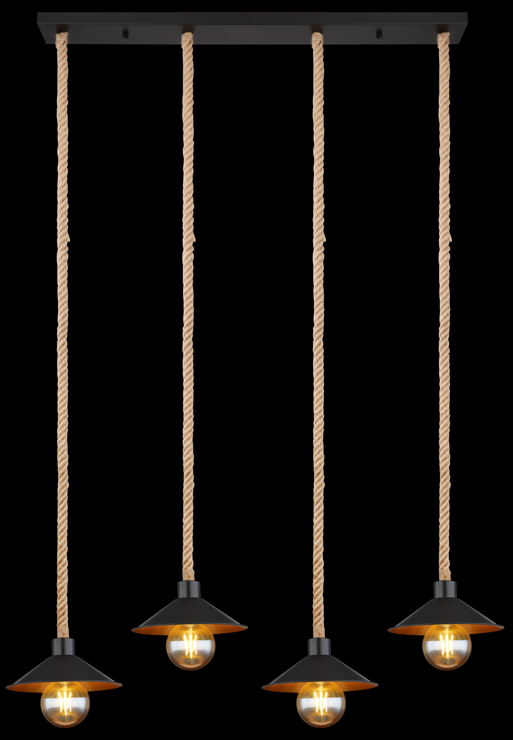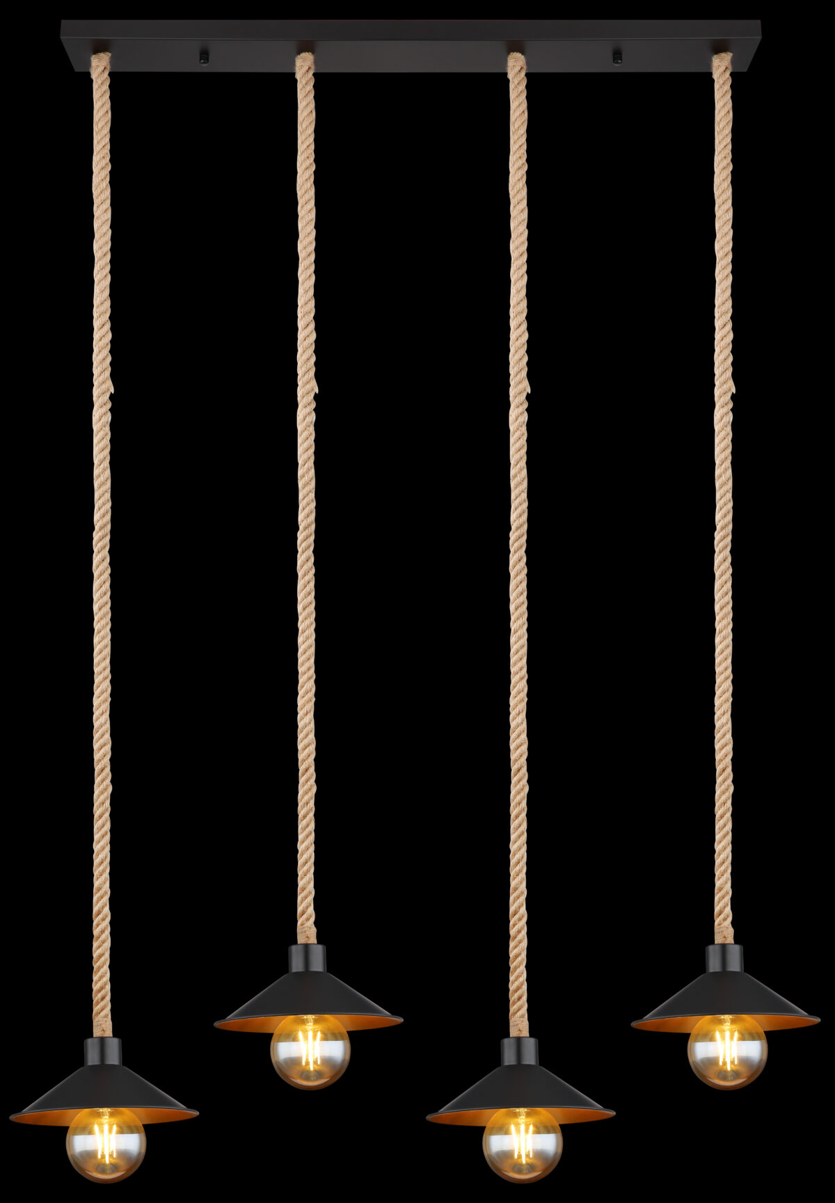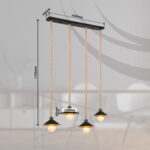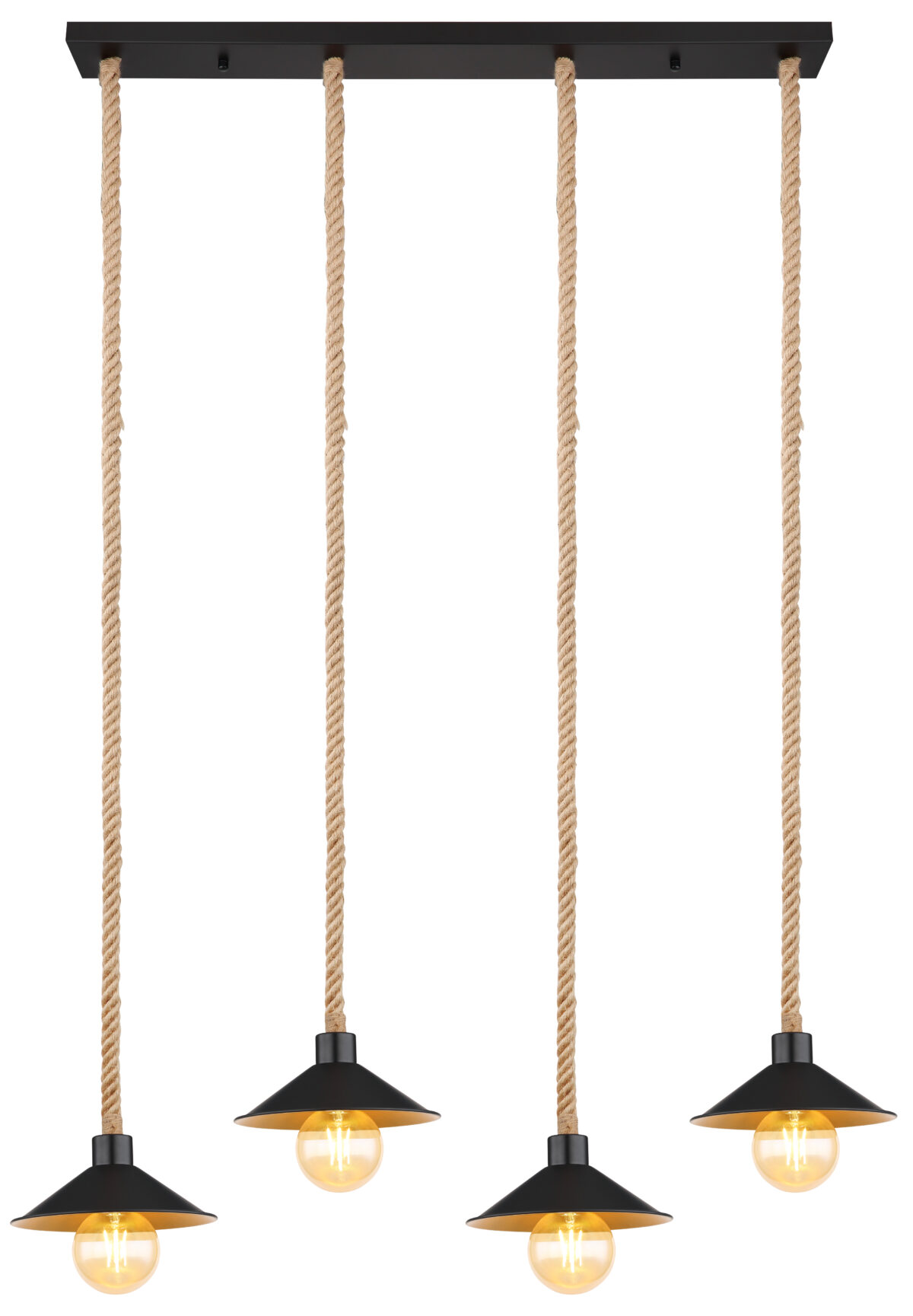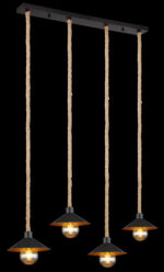 Ova visilica uvjerava svojim prekrasnim dizajnom od crne i zlatne boje. Lampa se sastoji od 4 sjenila (Ø22cm) sa zlatnom unutrašnjom i crnom vanjštinom, svaki je opremljen E27 grlom i visi 1,7m od stropa lijepo ispletenim užadima od konoplje. Pomoću utičnica E27 možete odrediti vlastiti izvor svjetlosti do maksimalne snage od 60 vati.