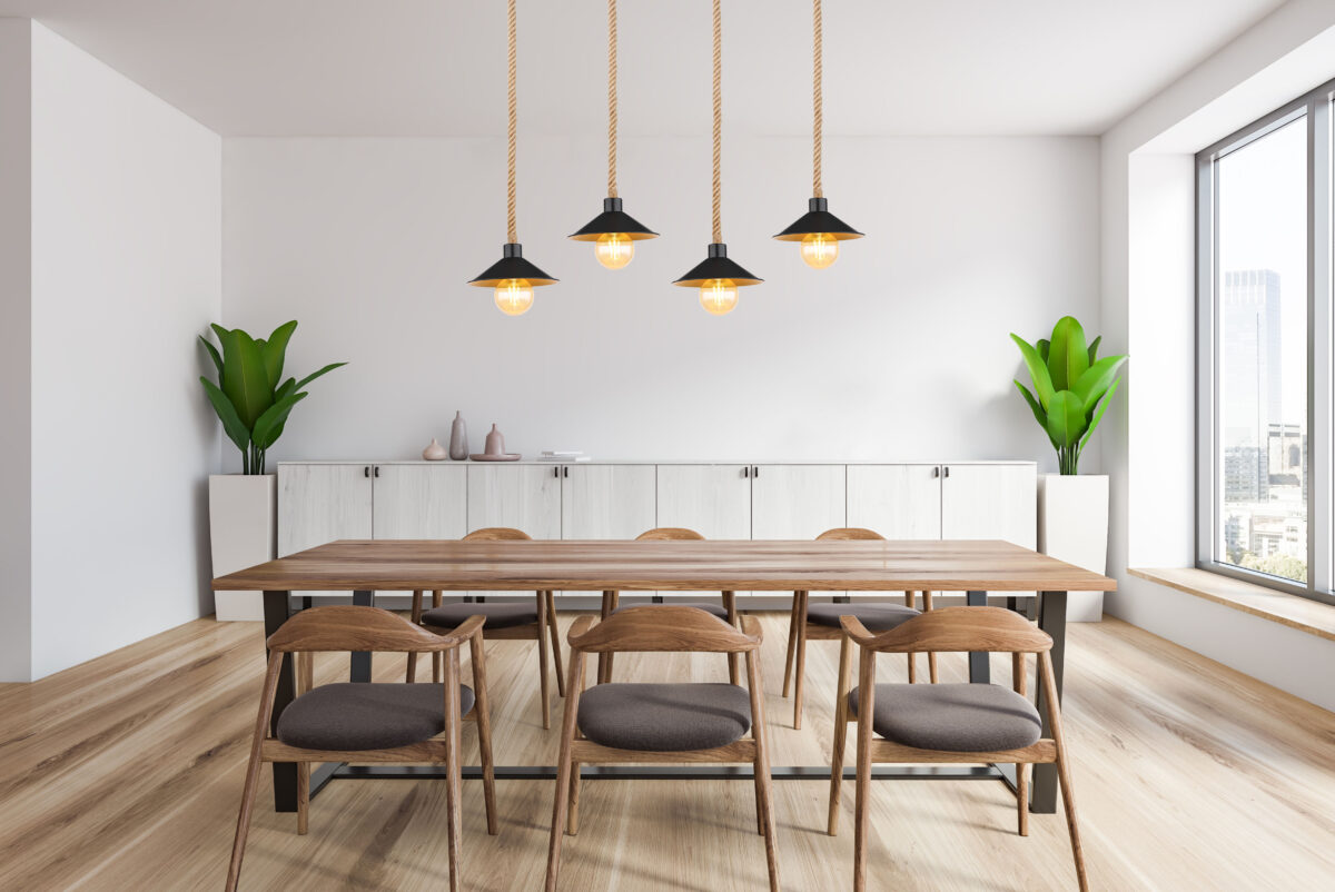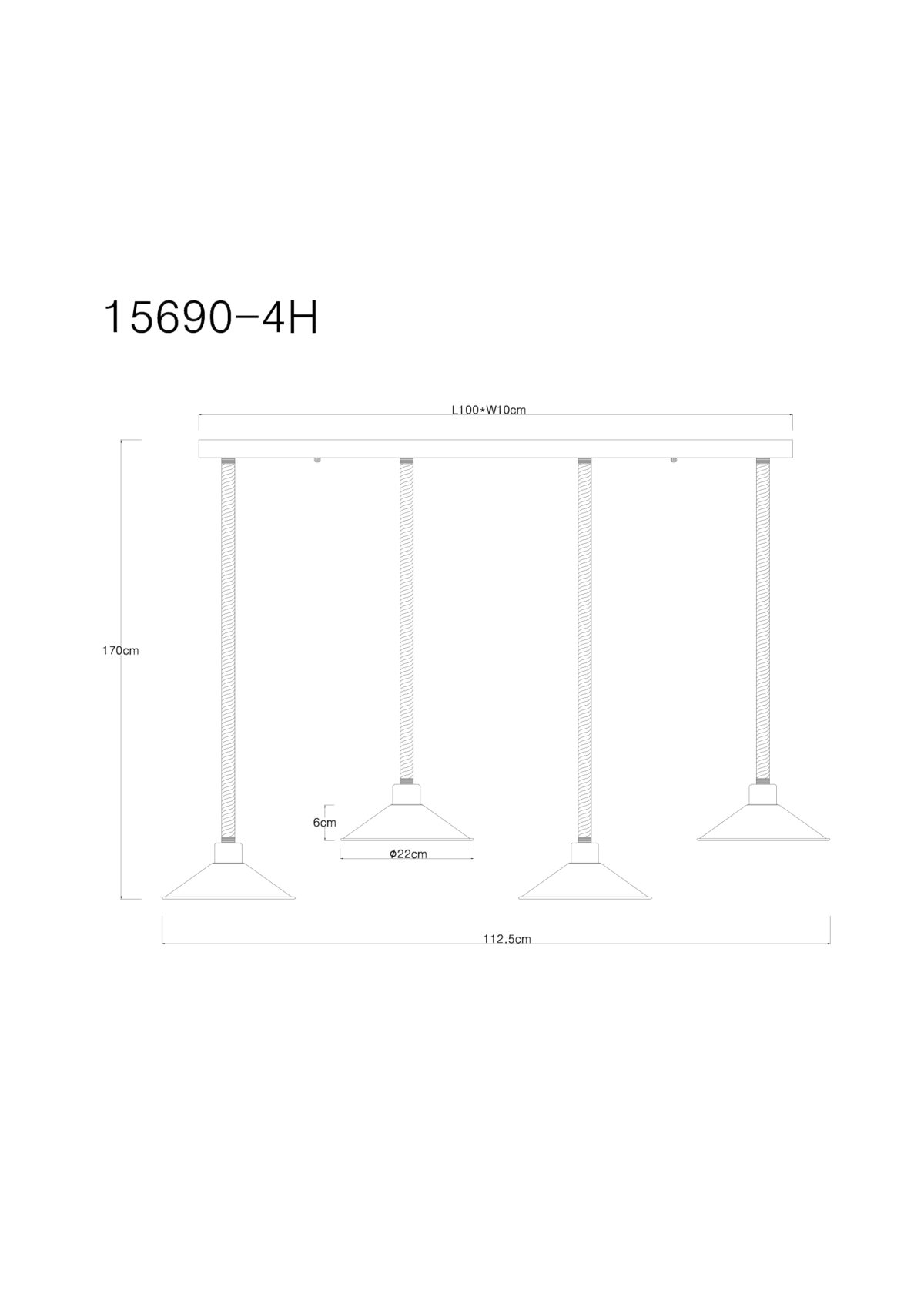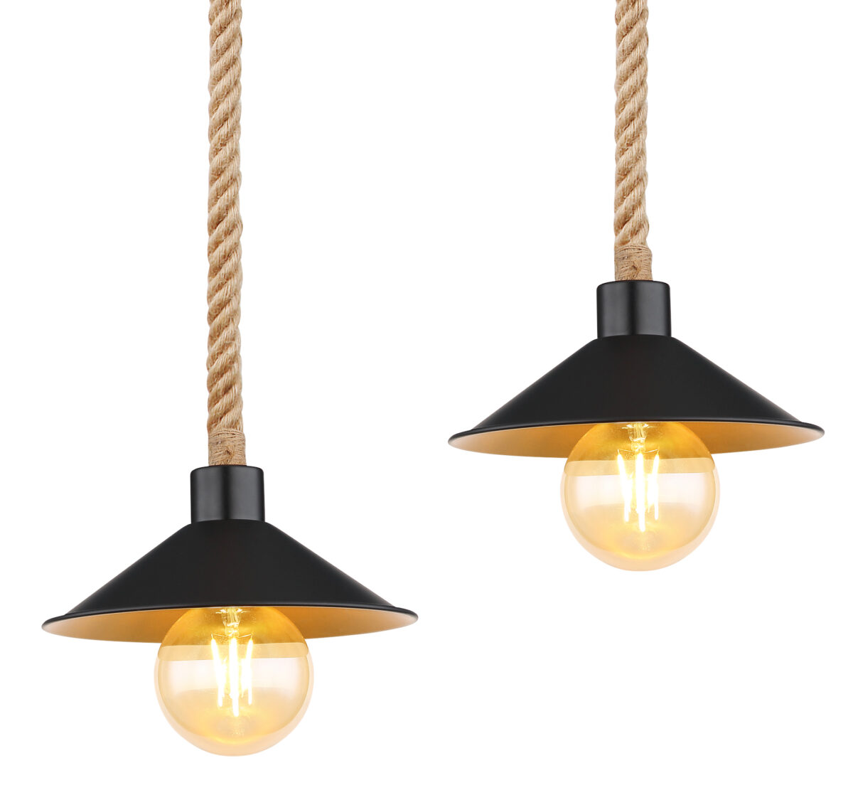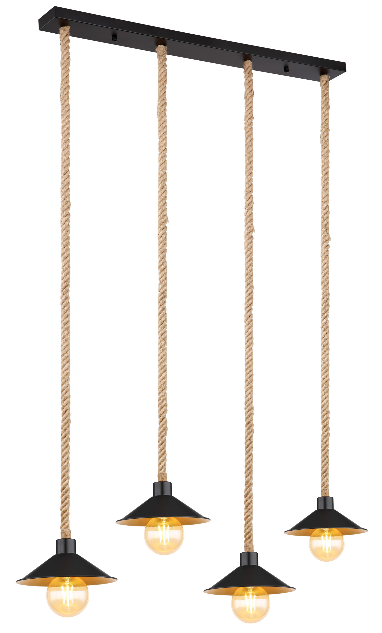 Ova visilica uvjerava svojim prekrasnim dizajnom od crne i zlatne boje. Lampa se sastoji od 4 sjenila (Ø22cm) sa zlatnom unutrašnjom i crnom vanjštinom, svaki je opremljen E27 grlom i visi 1,7m od stropa lijepo ispletenim užadima od konoplje. Pomoću utičnica E27 možete odrediti vlastiti izvor svjetlosti do maksimalne snage od 60 vati.