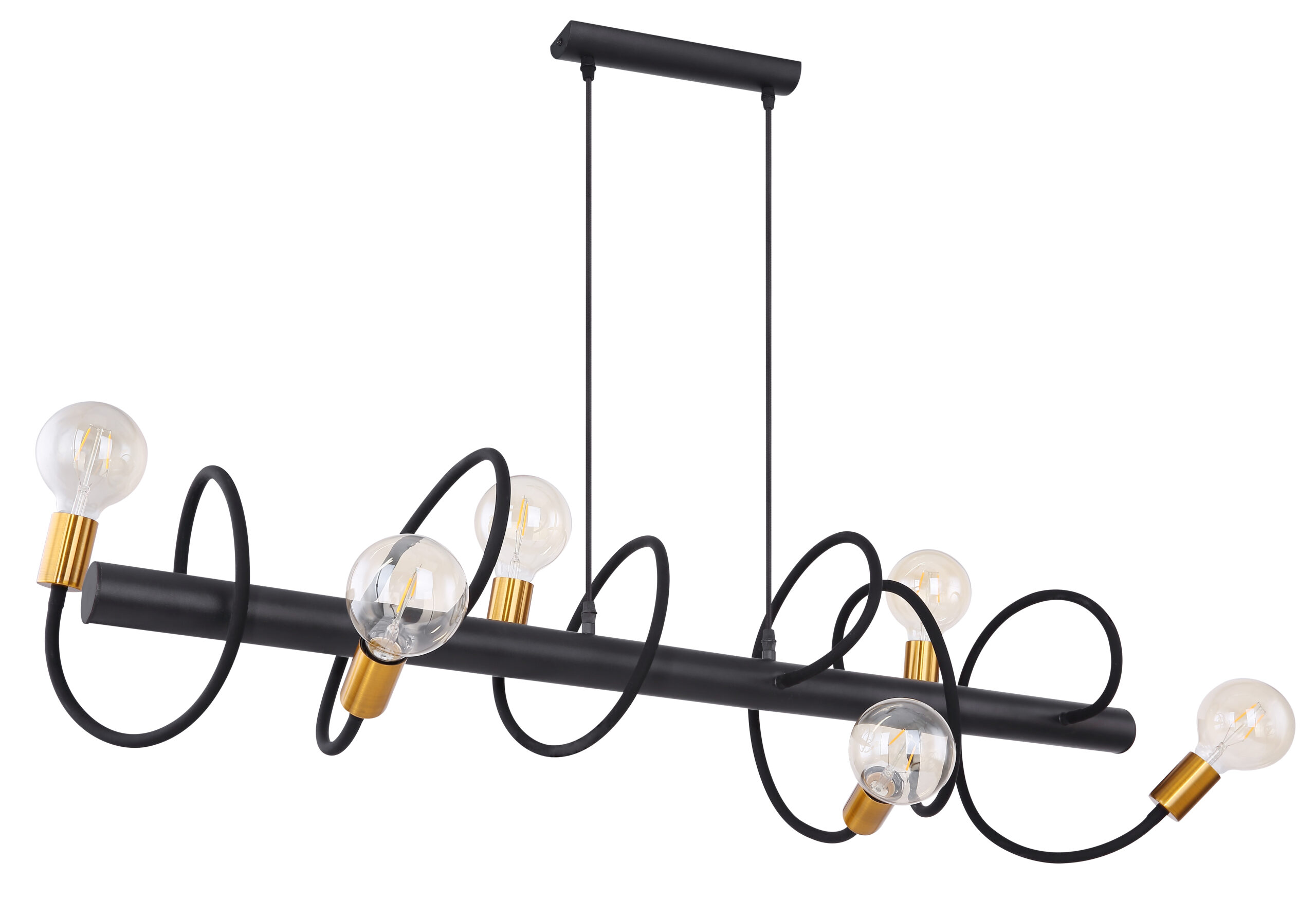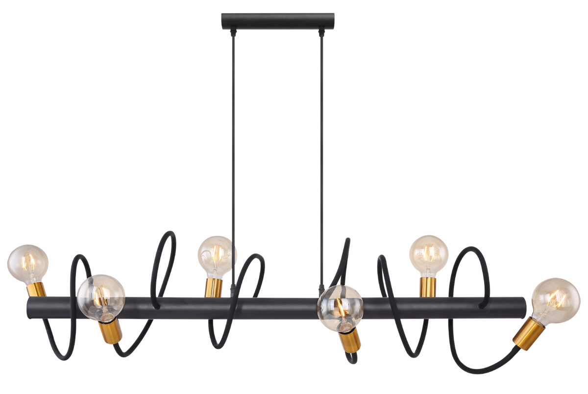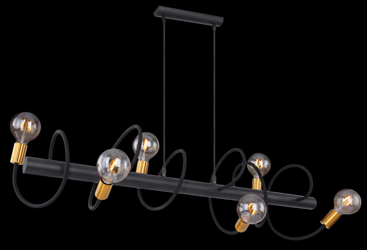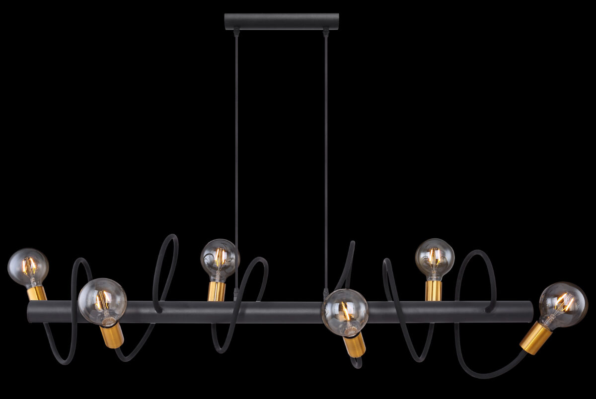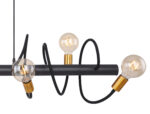Viseća lampa EDDY ističe se svojim starinskim i istovremeno jednostavnim dizajnom. Kombinacija materijala crnog i zlatnog metala daje ovoj stolnoj lampi tipičan starinski stil. Na dvije viseće, crne tekstilne sajle nalazi se šina sa koje se šest flekso krakova koji se nalaze na njoj mogu pojedinačno podesiti. E27 grla koja se nalaze na njemu omogućavaju slobodan izbor sijalica do 60 vati. Sa ostalim modelima ove serije možete dodatno uljepšati životni prostor.