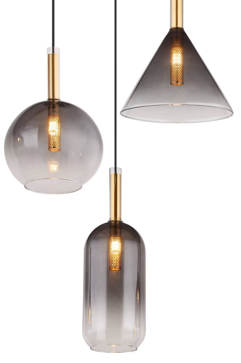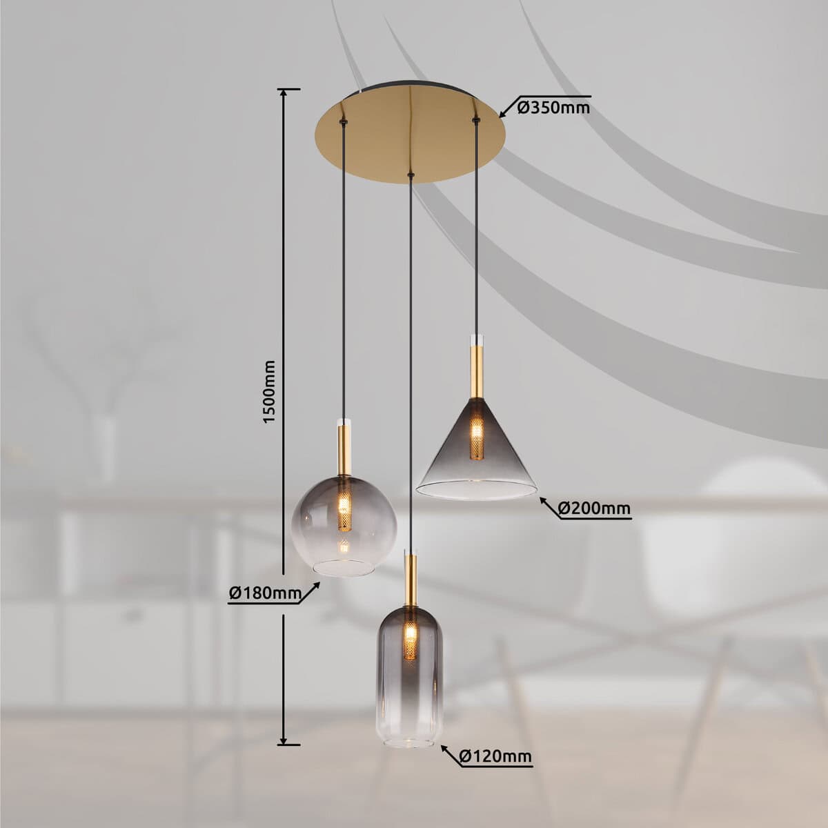 Viseća lampa Globo Lighting je elegantan i jednostavan izbor za vaš dom. Lampa je izrađena od visokokvalitetnog metala u mat crnoj i mesinganoj boji, kao i stakla u boji dima, koje ima jasan gradijent. Kabl je crne boje, a visina svetiljke se može skratiti. Sa prečnikom od 430 mm i visinom od 1500 mm, ova viseća lampa je prava privlačna za oči u svakoj prostoriji. Lampa je opremljena sa tri stakla prečnika 12cm, 18cm i 20cm. Za svetiljku su potrebne tri G9 LED sijalice, svaka snage 10W i napona 230V, koje nisu uključene.