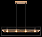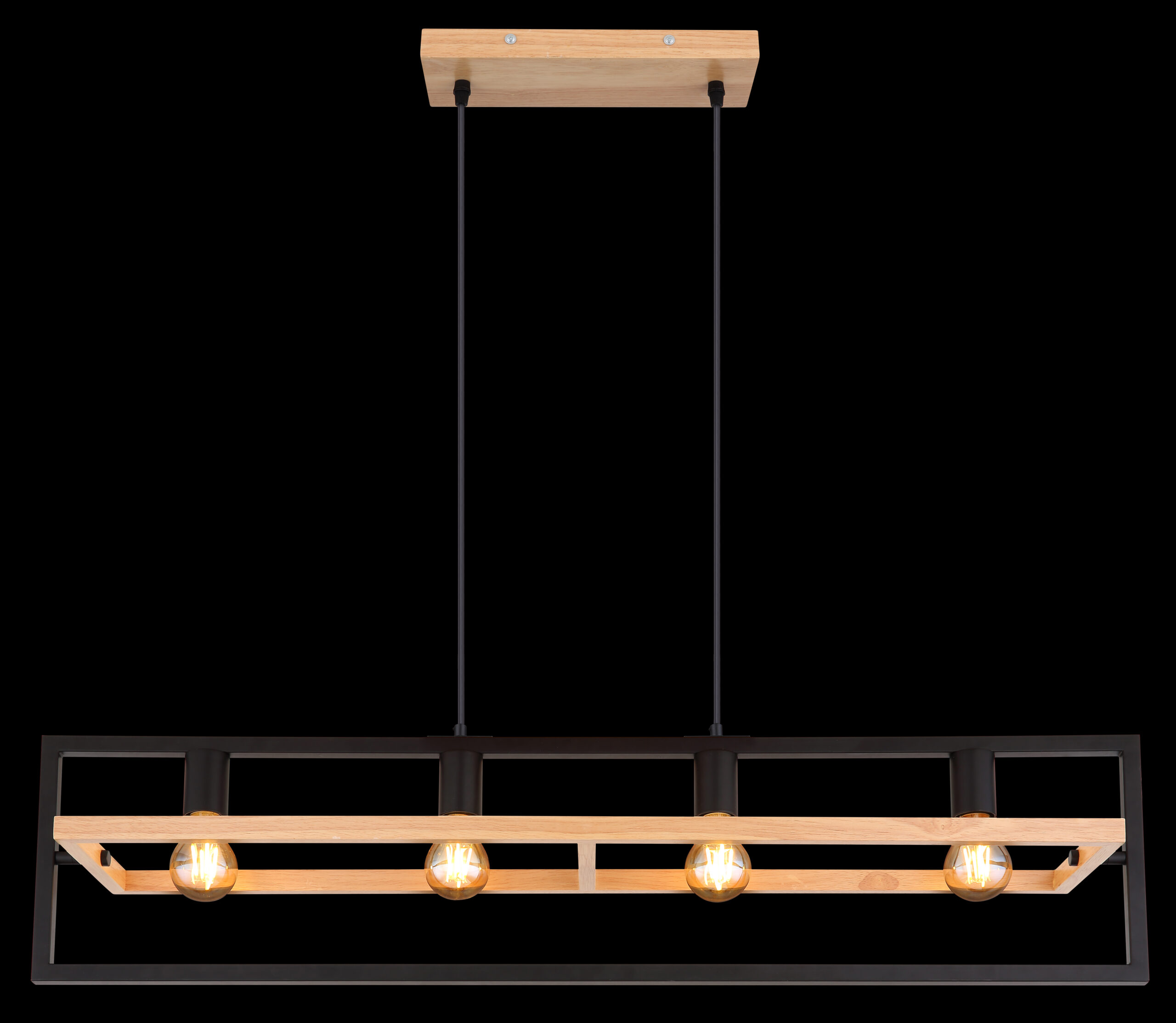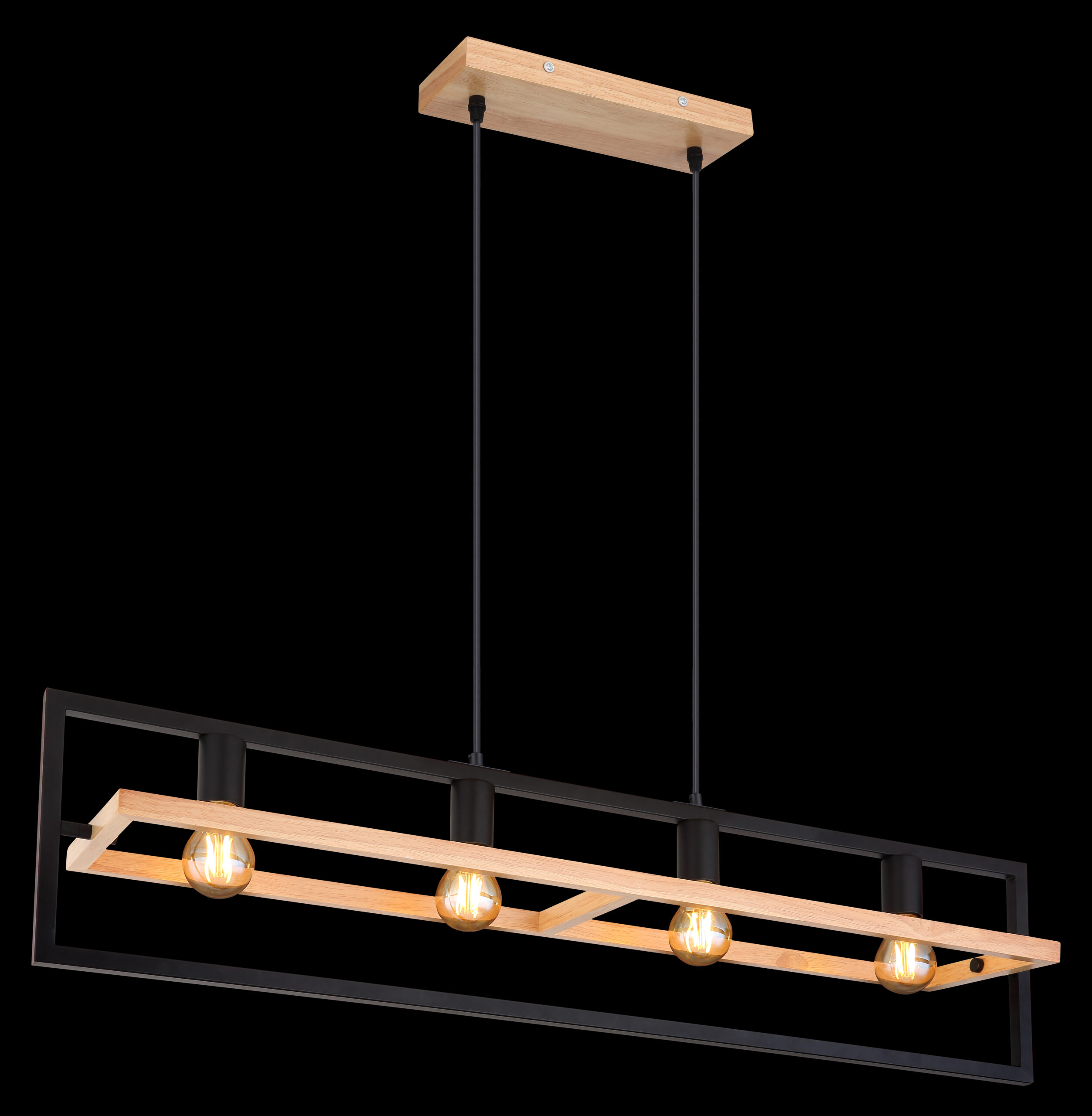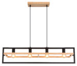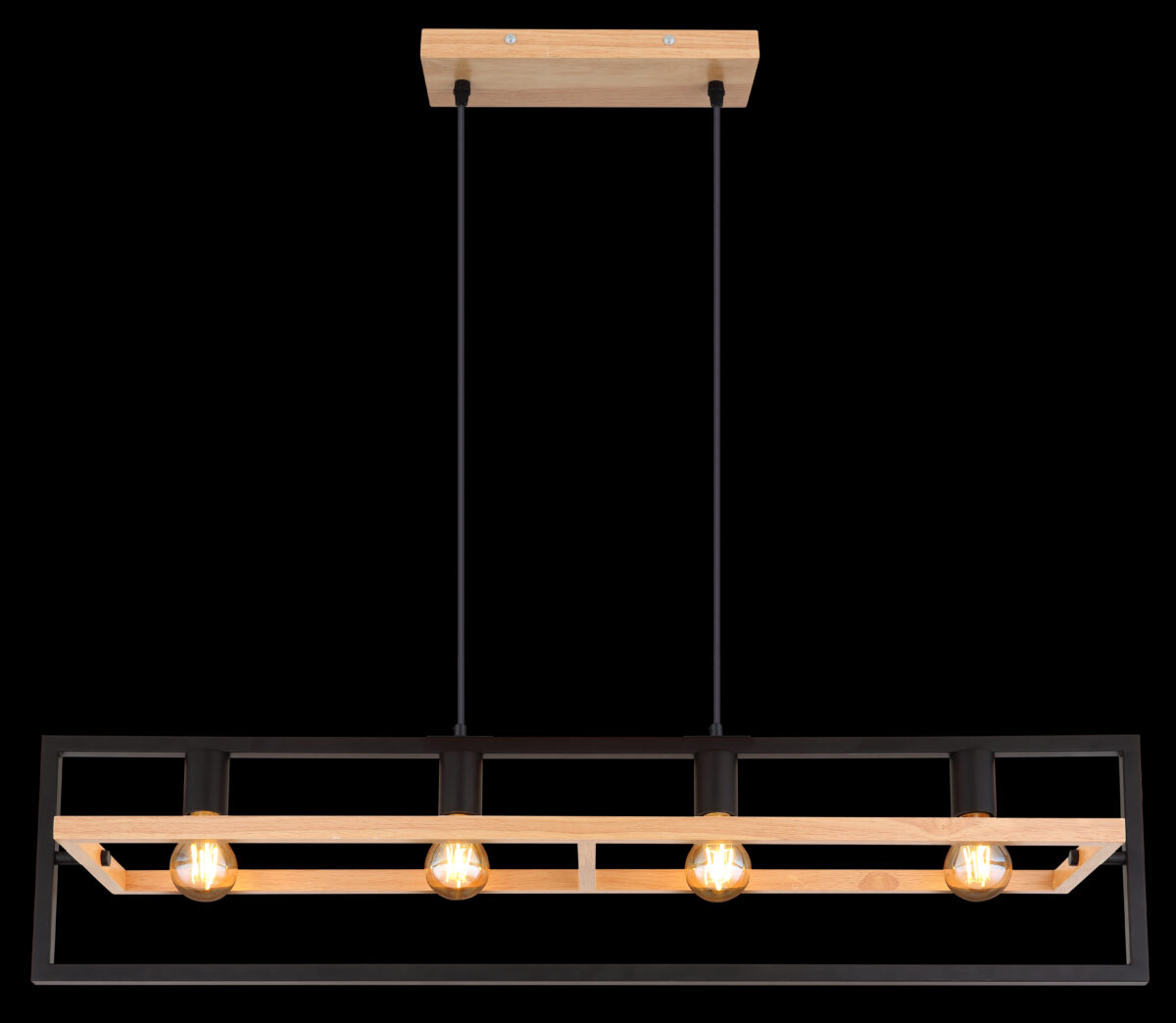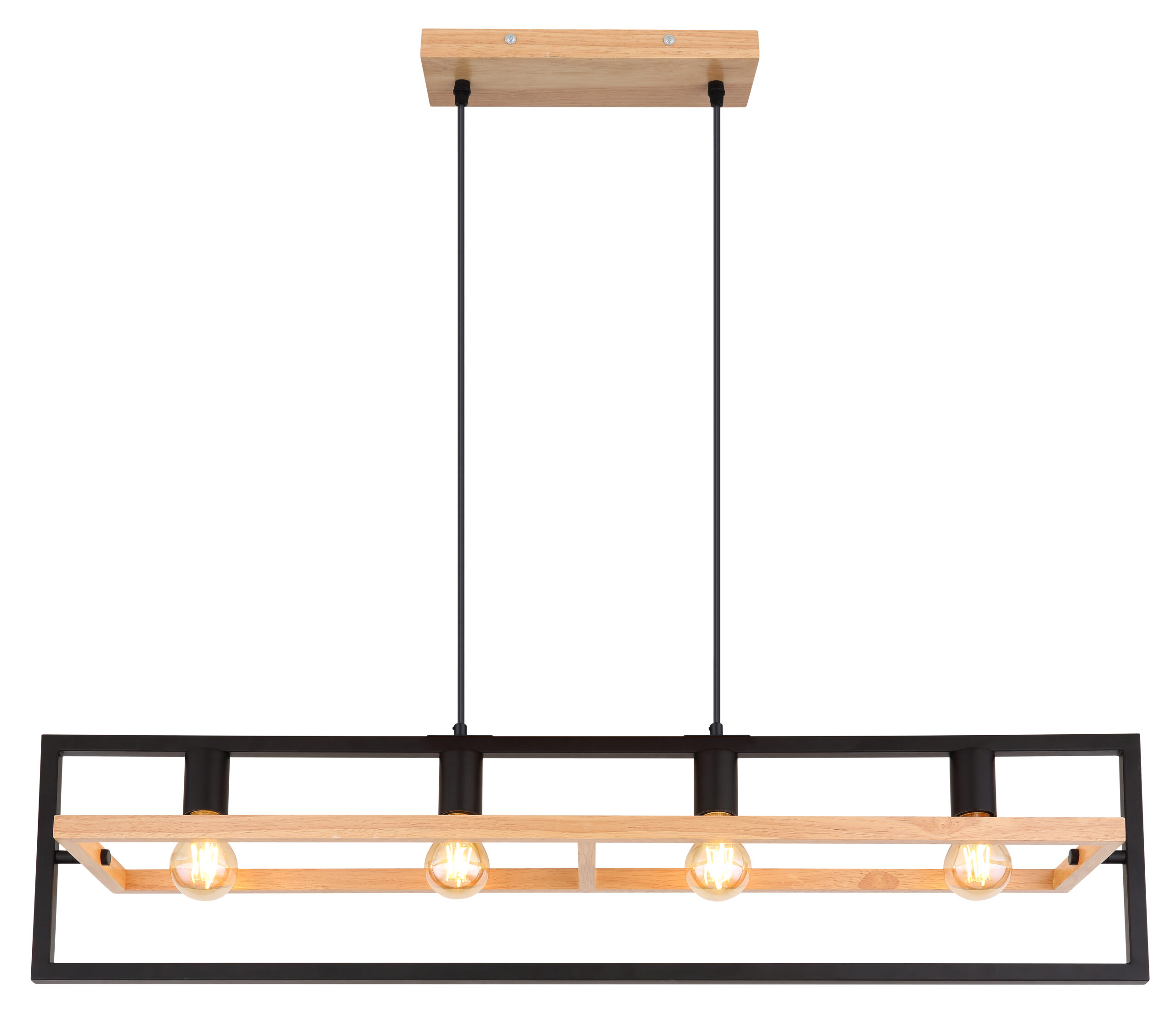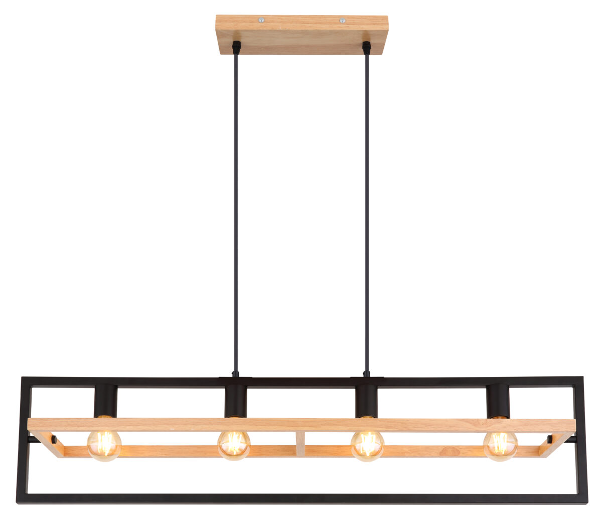 Ova izuzetno moderna plafonska lampa iz serije Erica inspiriše svojim sjajnim dizajnom. Sastoji se od crnog mat pravougaonog metalnog okvira dužine 98cm na kojem se nalaze četiri E27 utičnice i zaokružen je drugim pokretnim pravougaonikom od drveta širine 20cm. Sa pravougaonog plafonskog nosača od drveta, lampa visi na dve metalne šipke 1,5m od plafona. E27 utičnice vam omogućavaju da slobodno odaberete opremanje do maksimalne snage od 40 vati.