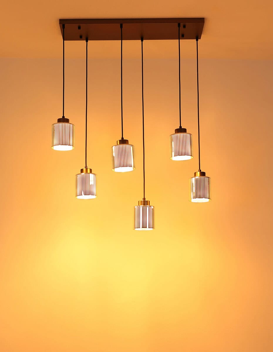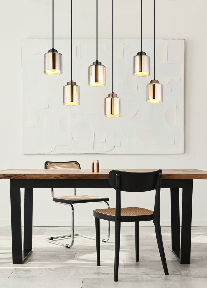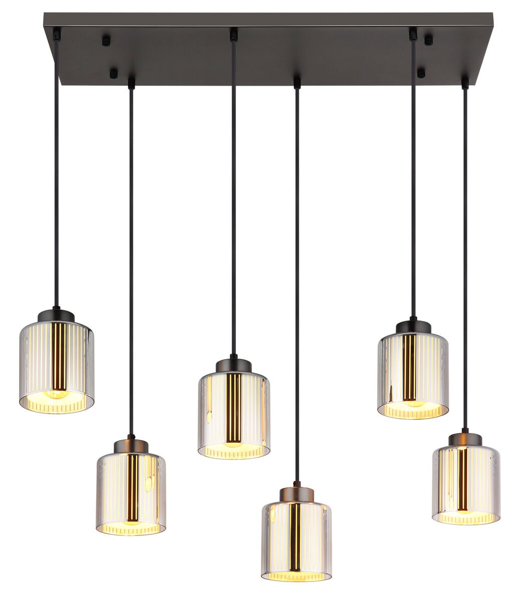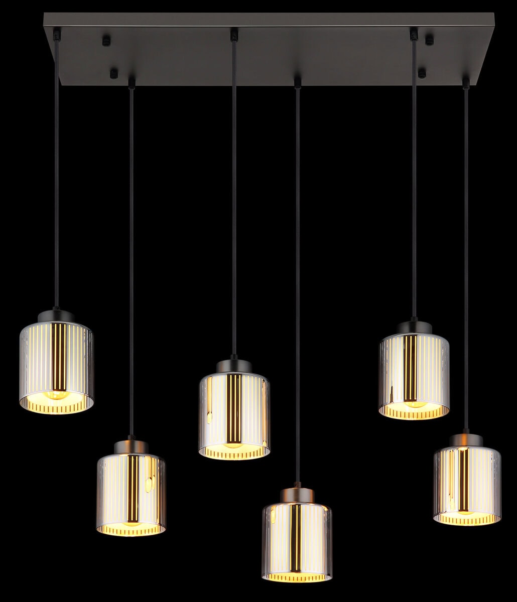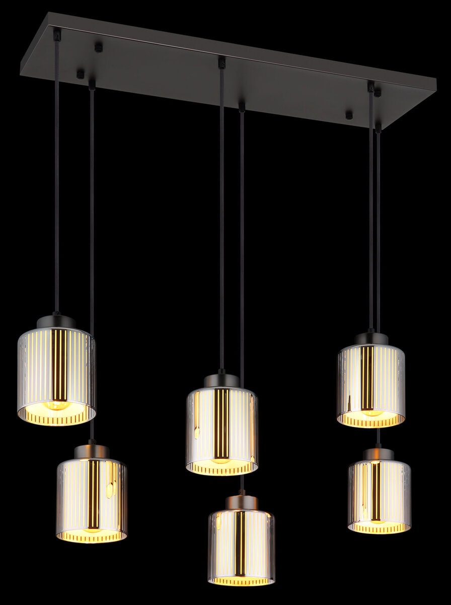 Pravougaona visilica impresionira svojim modernim, elegantnim dizajnom i pruža elegantno osvjetljenje u vašoj sobi. Metalno kućište u crnoj i hromiranoj boji daje lampi elegantan izgled koji se uklapa u svaki interijer. Šest cilindričnih sjenila od hromiranog stakla sa prugastim uzorkom i opalnim unutrašnjim staklom stvaraju fascinantan svjetlosni efekat i osiguravaju ugodno, ravnomjerno osvjetljenje. Sa dužinom od 830 mm i širinom od 300 mm, lampa je savršena za veće prostorije, kao što su trpezarije ili dnevne sobe. Opremljen je sa šest E27 grla (sijalice nisu uključene), tako da možete podesiti svjetlinu i boju svjetla po svom ukusu. Ova viseća lampa kombinuje moderan dizajn sa funkcionalnom rasvetom i postavlja impresivne akcente. Stvara ugodnu atmosferu i garantovano će privući oči u svakoj prostoriji.