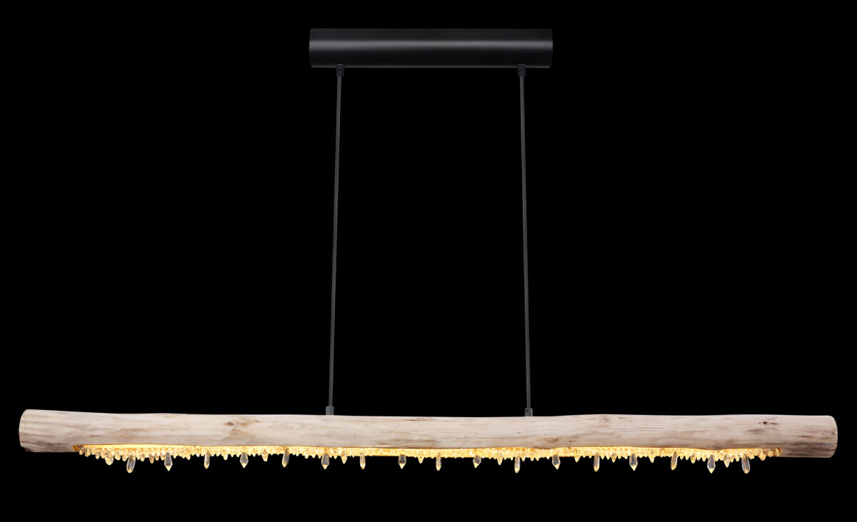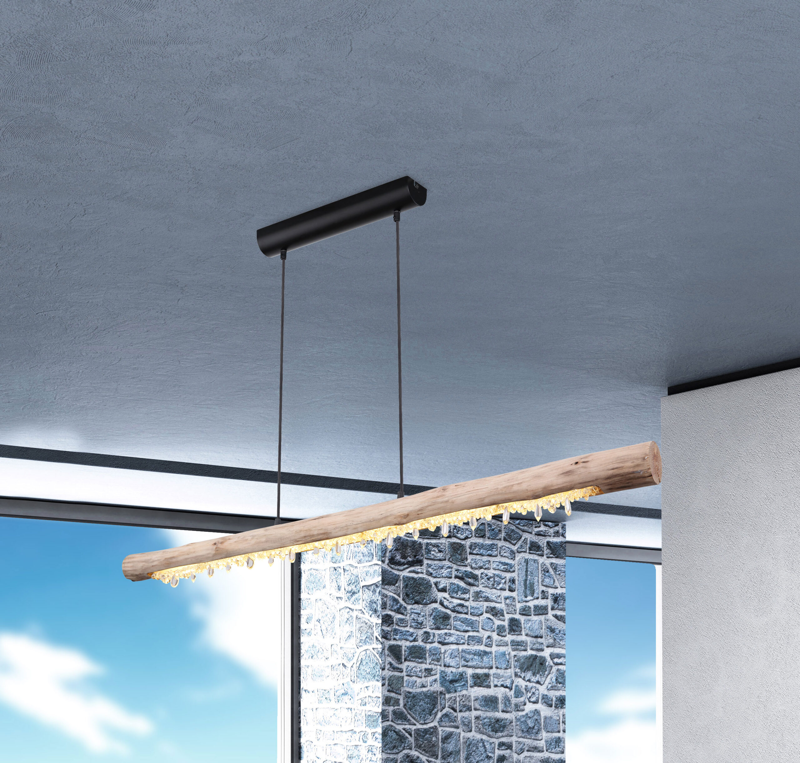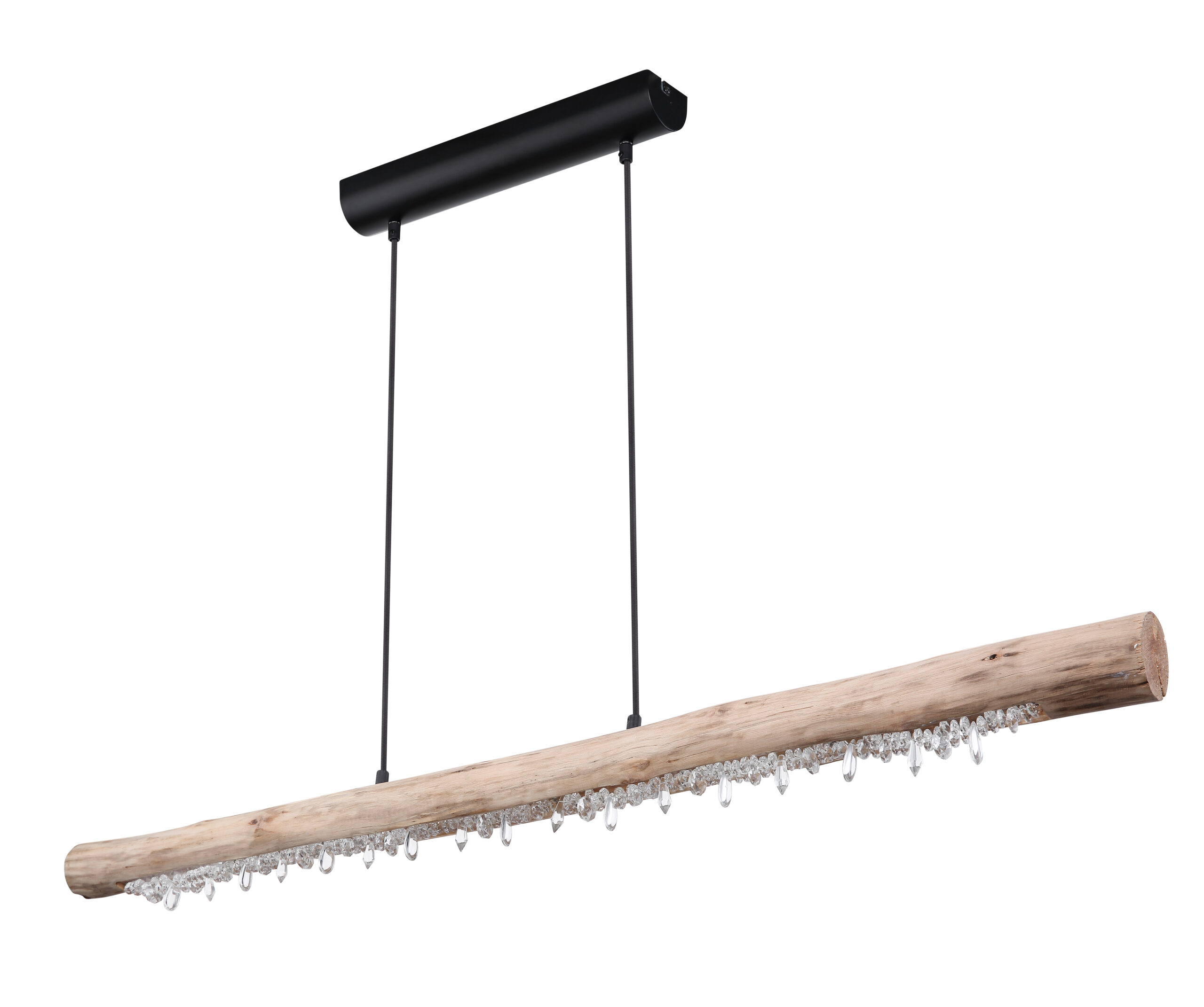 Sa ovom visećom lampom, modernost se susreće sa isprobanim. Na visećim crnim kablovima nalazi se drvena greda od prirodnog drveta. Prozirni akrilni kristali pričvršćeni na drvenu gredu privlače pažnju u vašoj sobi. Zahvaljujući uključenoj LED sijalici od 20 vati, ovo unutrašnje svjetlo nije samo vizualno privlačno za oči, jer pruža do 1030 lumena jakog svjetla s ugodnom, ugodno toplom bojom svjetlosti od 3000 Kelvina. Ovo unutrašnje svjetlo je odlično za vaš dnevni boravak i blagovaonicu.
