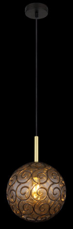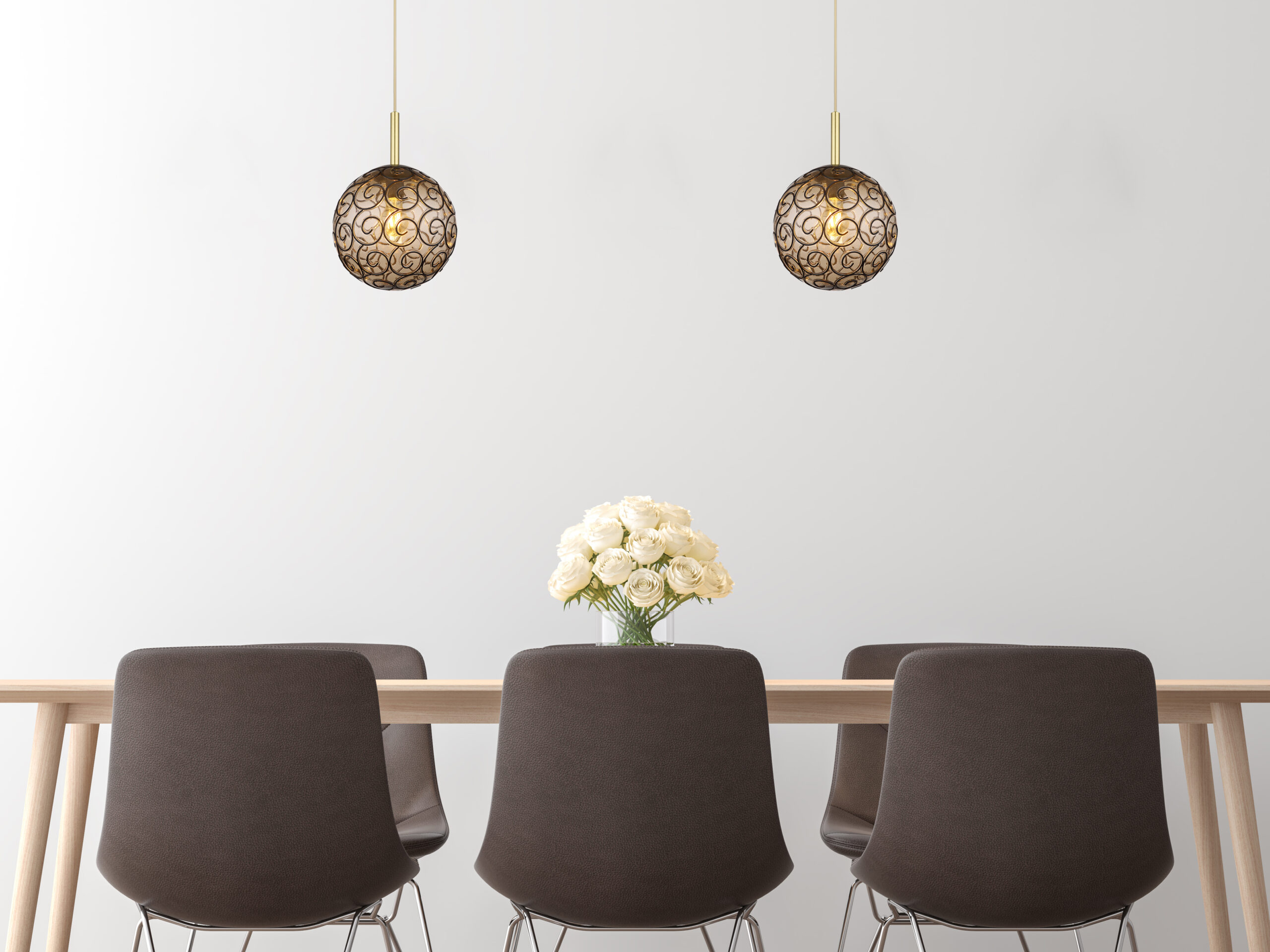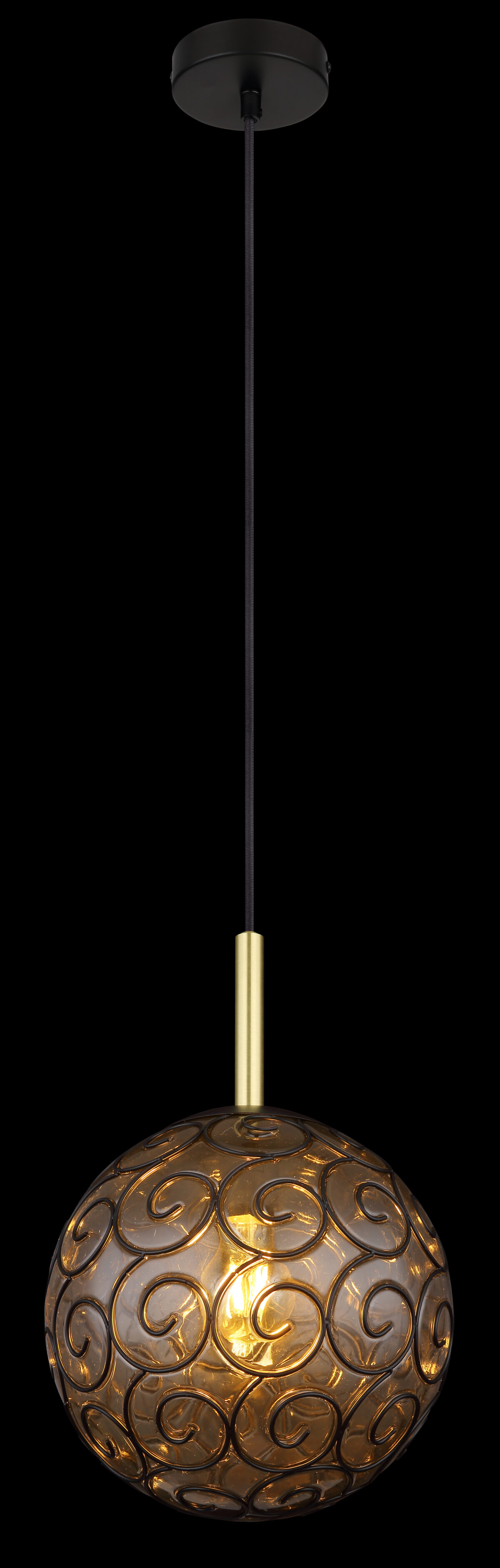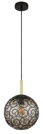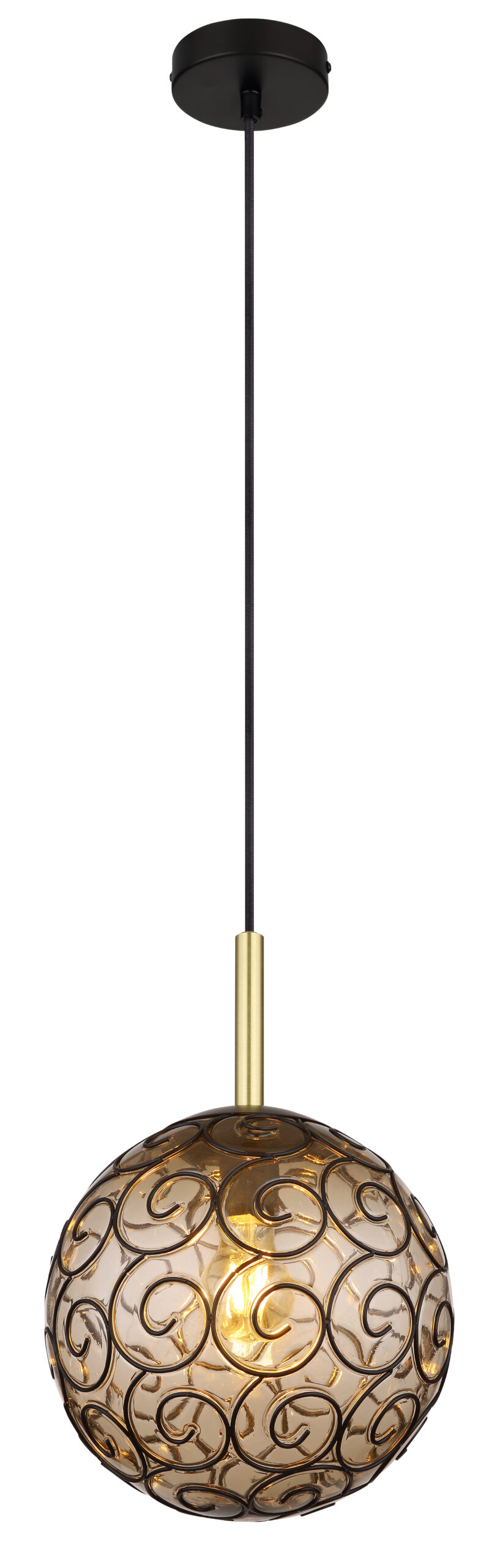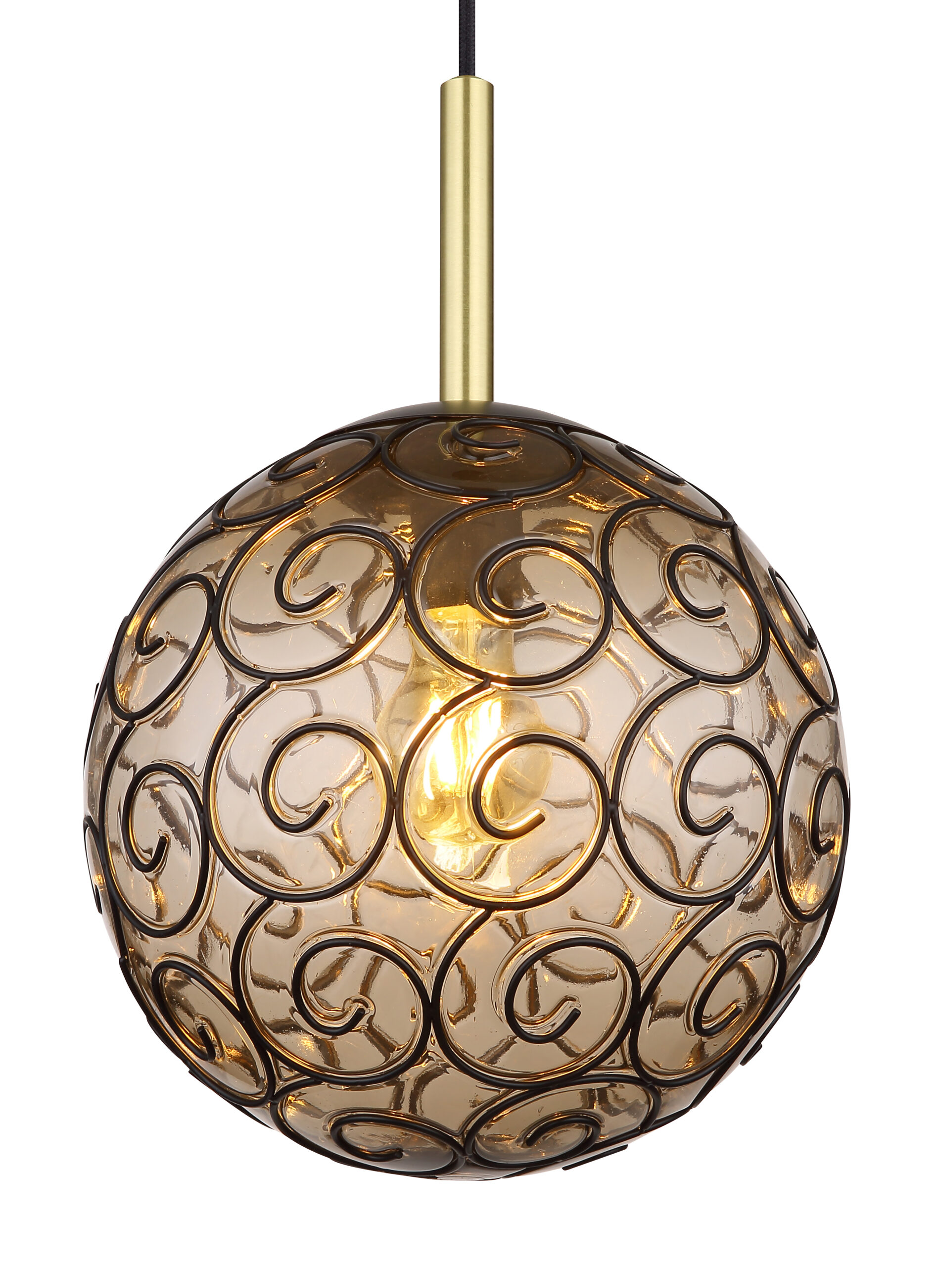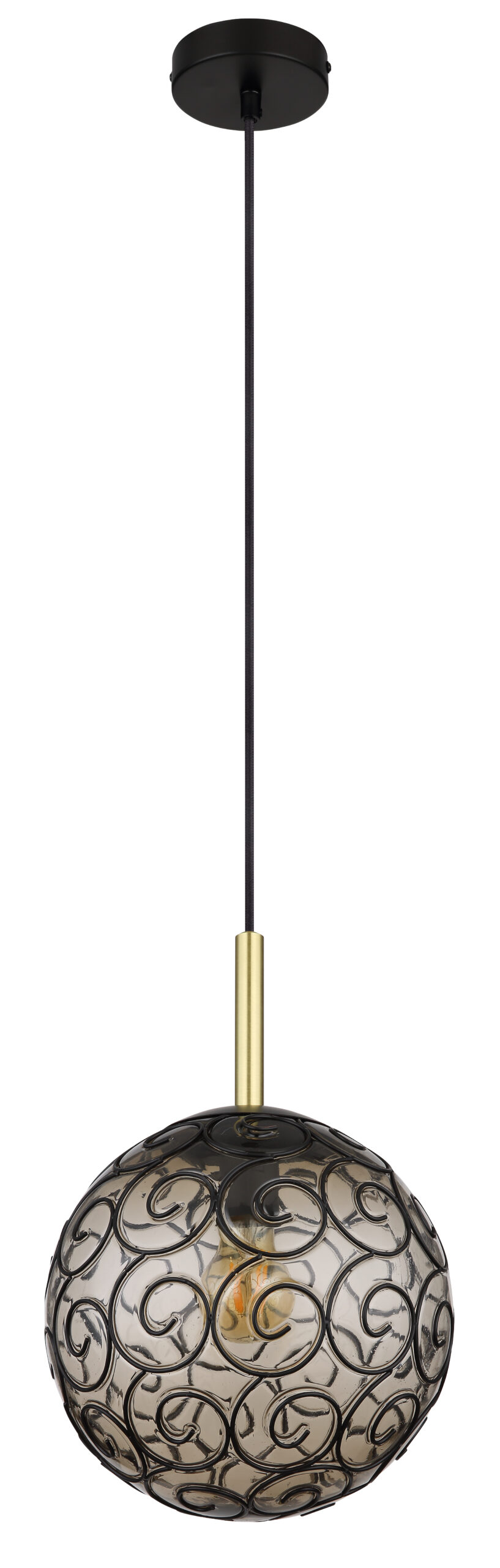 Ova prekrasna viseća lampa inspirira odličnim dizajnom. Iz okruglog plafonskog priključka viri zlatni kabl maksimalne dužine 1,2m i završava se na E27 LED utičnici koja je opremljena prekrasno dekorativnim staklenim sjenilom u dimnim bojama (Ø25cm). E27 LED utičnica vam daje mogućnost da sami odlučite o boji svjetla i jačini do maksimalne snage 9 vati. Zbog dugotrajnosti i uštede energije preporučujemo LED sijalice.