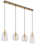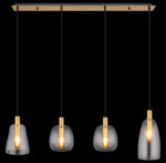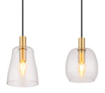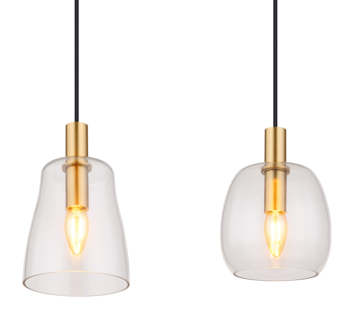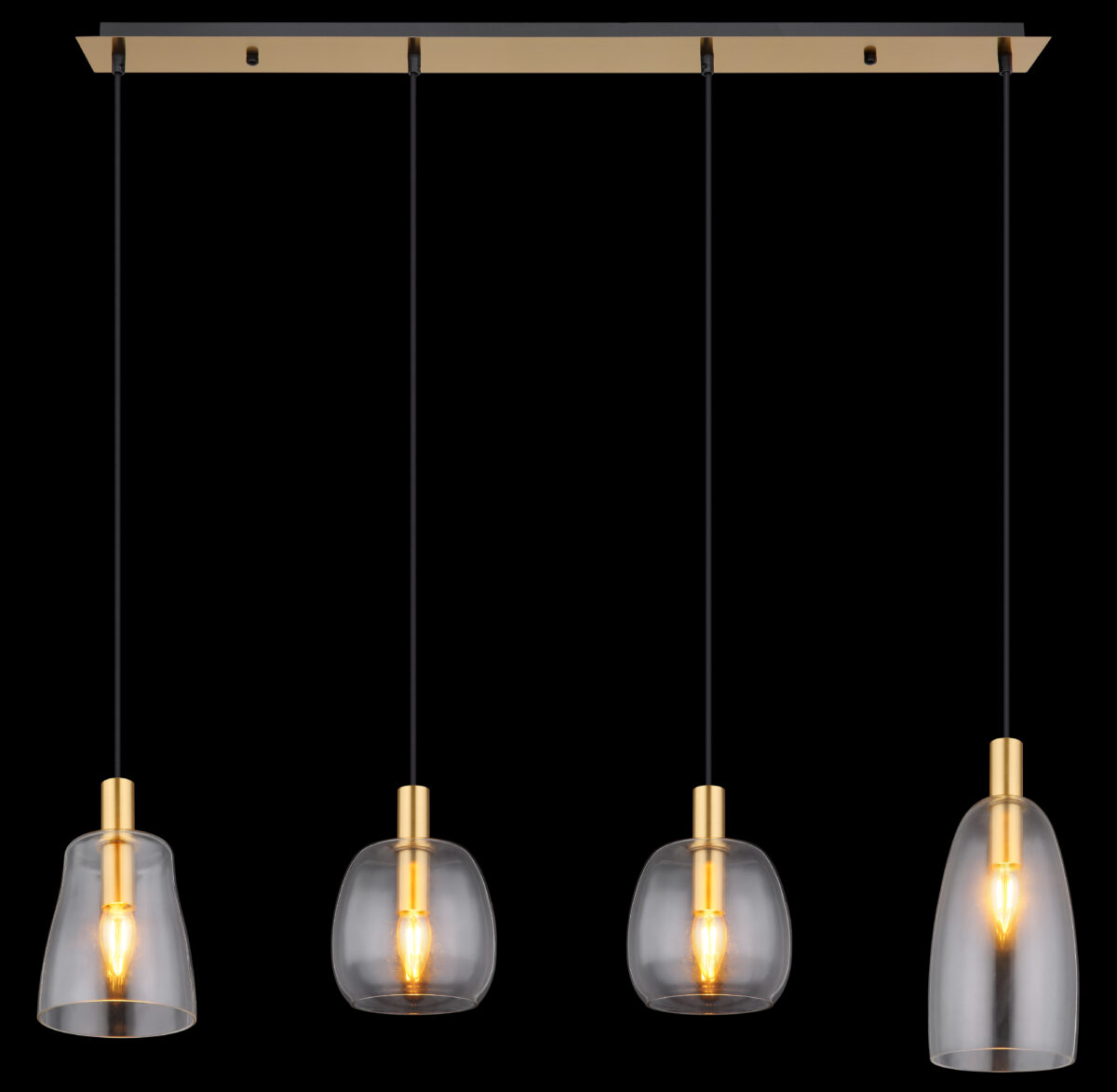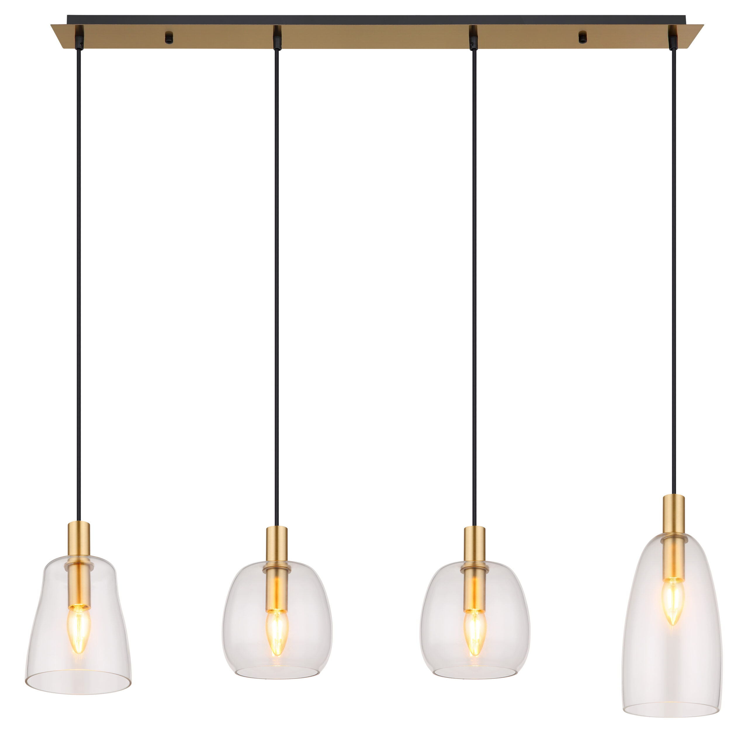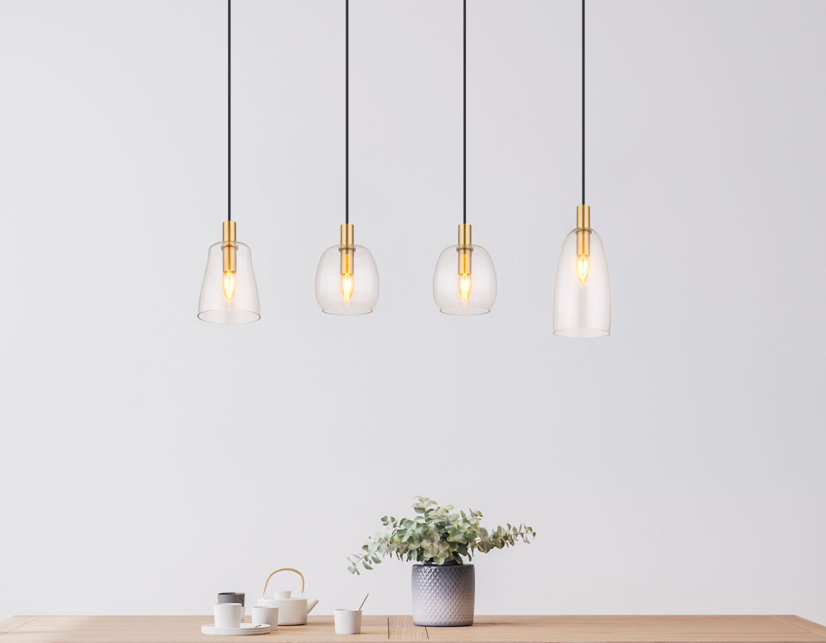 Ova elegantna viseća lampa inspiriše prelepim dizajnom. Na plafonsku montažu dužine 107 cm povežite četiri crna kabla dužine 1,2 m do svake E14 utičnice, koji su opremljeni staklenim zastorima u obliku stakla različitih oblika i ukrasima od mesinga. E14 utičnice vam omogućavaju da sami odredite boju svjetla i svjetlinu do maksimalne snage od 40 vati. Zbog dugovečnosti i uštede energije preporučujemo LED sijalice.