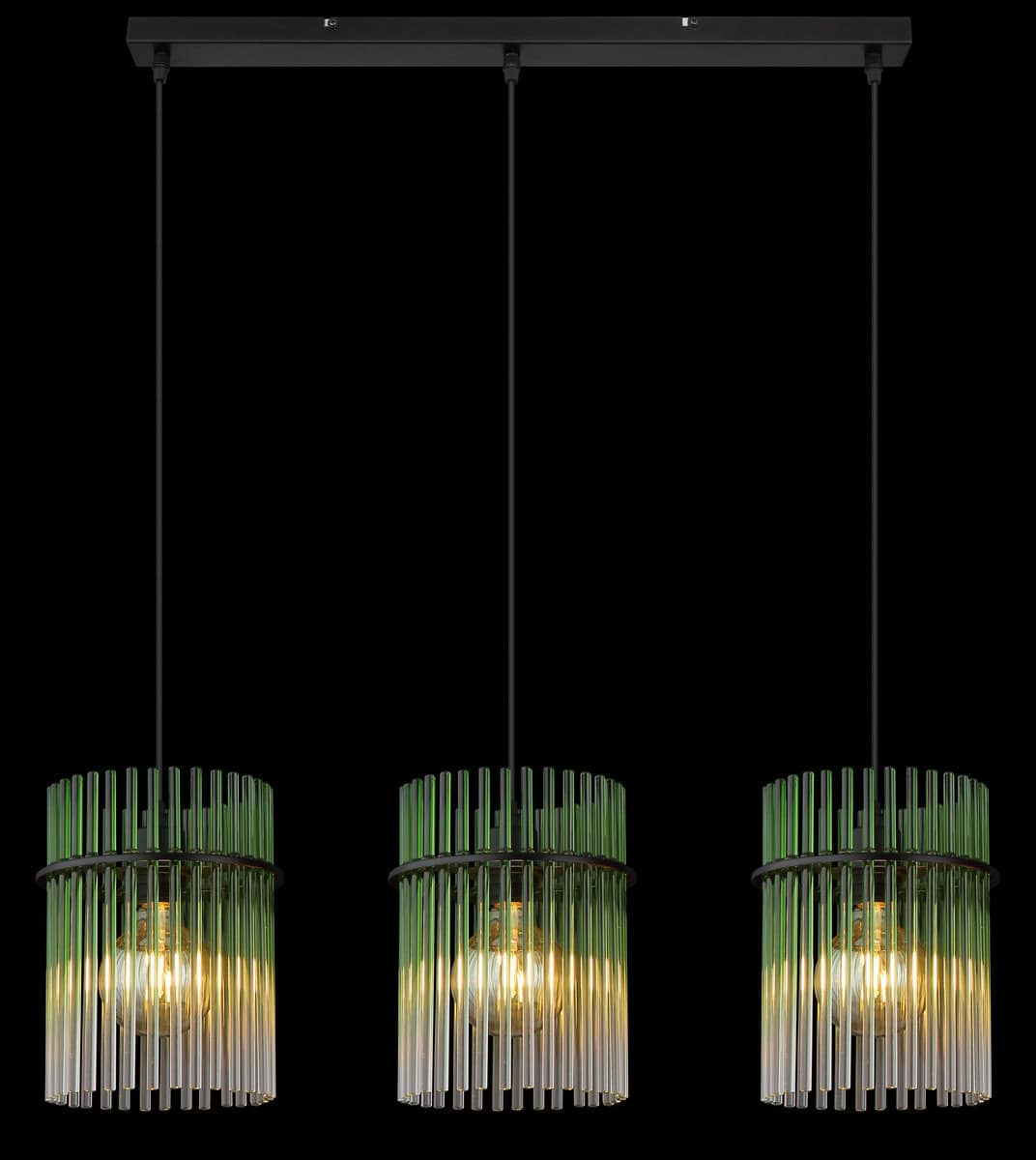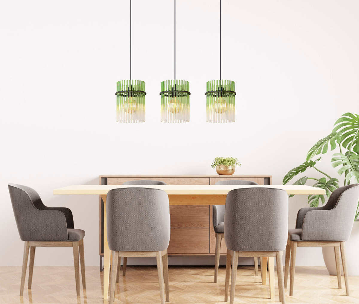 Viseća lampa GORLEY kombinuje moderan dizajn sa elegantnom funkcionalnošću. Ova elegantna visilica ima ravnu stazu na koju su pričvršćene tri vješalice. Svaka vješalica je opremljena okruglim kišobranom od staklenih šipki. Staklene šipke su dizajnirane u fascinantnoj zelenoj, jasnoj i gradijenti, stvarajući jedinstvenu igru svjetlosti. Izduženi oblik svjetiljke idealan je za korištenje iznad trpezarijskih stolova, u dnevnim boravcima ili preko pulta i harmonično se uklapa u različite stilove opremanja. Tijelo visilice izrađeno je od mat crnog metala, što joj daje moderan i istovremeno bezvremenski izgled. Uz GORLEY visilicu unosite vrhunac u svoj dom, koji ne uvjerava samo svojim atraktivnim izgledom, već i visokokvalitetnom izradom. Kombinacija metala i stakla čini ovu lampu posebnom privlačnom za oči koja uljepšava svaku prostoriju i pruža ugodno osvjetljenje.