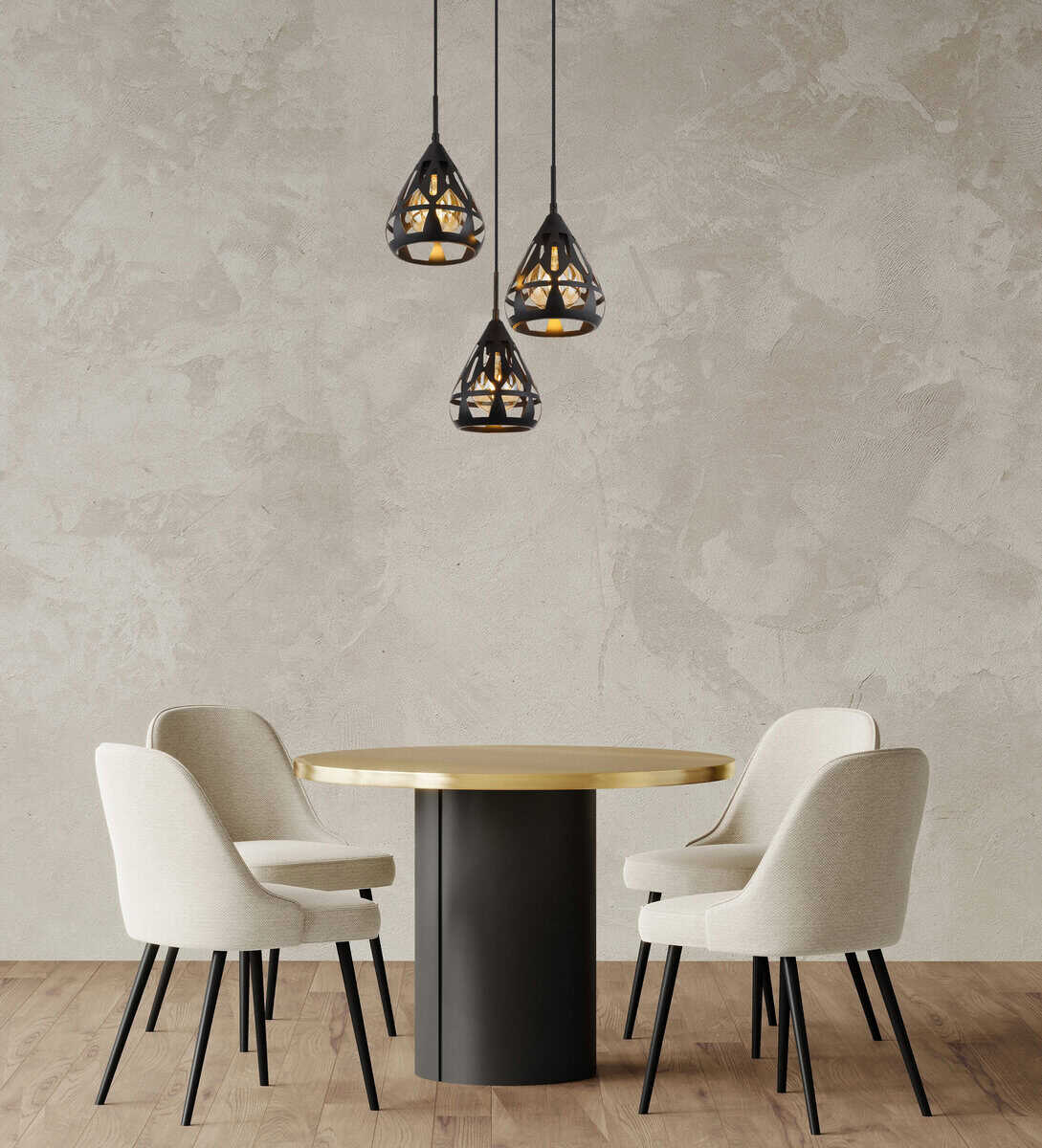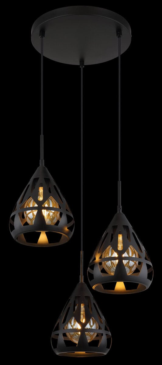 Viseća lampa HASSAN se predstavlja kao elegantan rasvjetni element za vaš dom. Sa svojim okruglim dizajnom i tri vješalice, nudi šarmantan ugođaj. Sjenila su također okrugle i ukrašene ukrasnim udarcima koji stvaraju fascinantnu igru svjetla. Mat crno metalno kućište daje lampi moderan dodir i savršeno se uklapa u različite stilove enterijera. Sjenila, također izrađene od mat crnog metala, harmonično nadopunjuju dizajn i omogućavaju da svjetlost lagano sija kroz ukrasne izreze. Sa prečnikom od 410 mm, HASSAN viseća lampa savršeno se uklapa u širok spektar prostorija. Bilo iznad trpezarijskog stola u dnevnoj sobi ili kao elegantna rasveta u hodniku – ova visilica vešto kombinuje funkcionalnost i estetiku i daje vašem domu poseban štih.