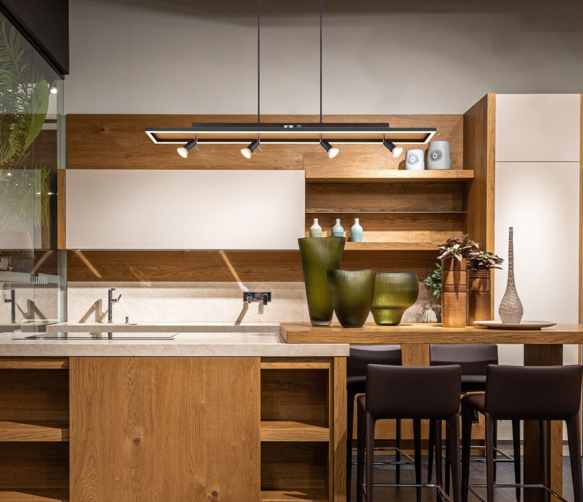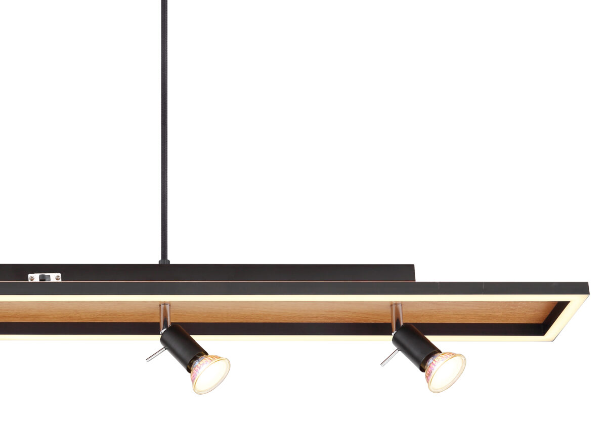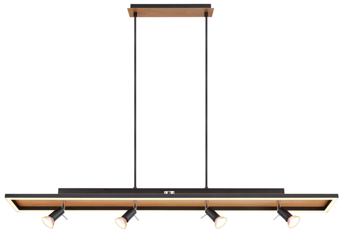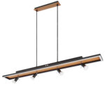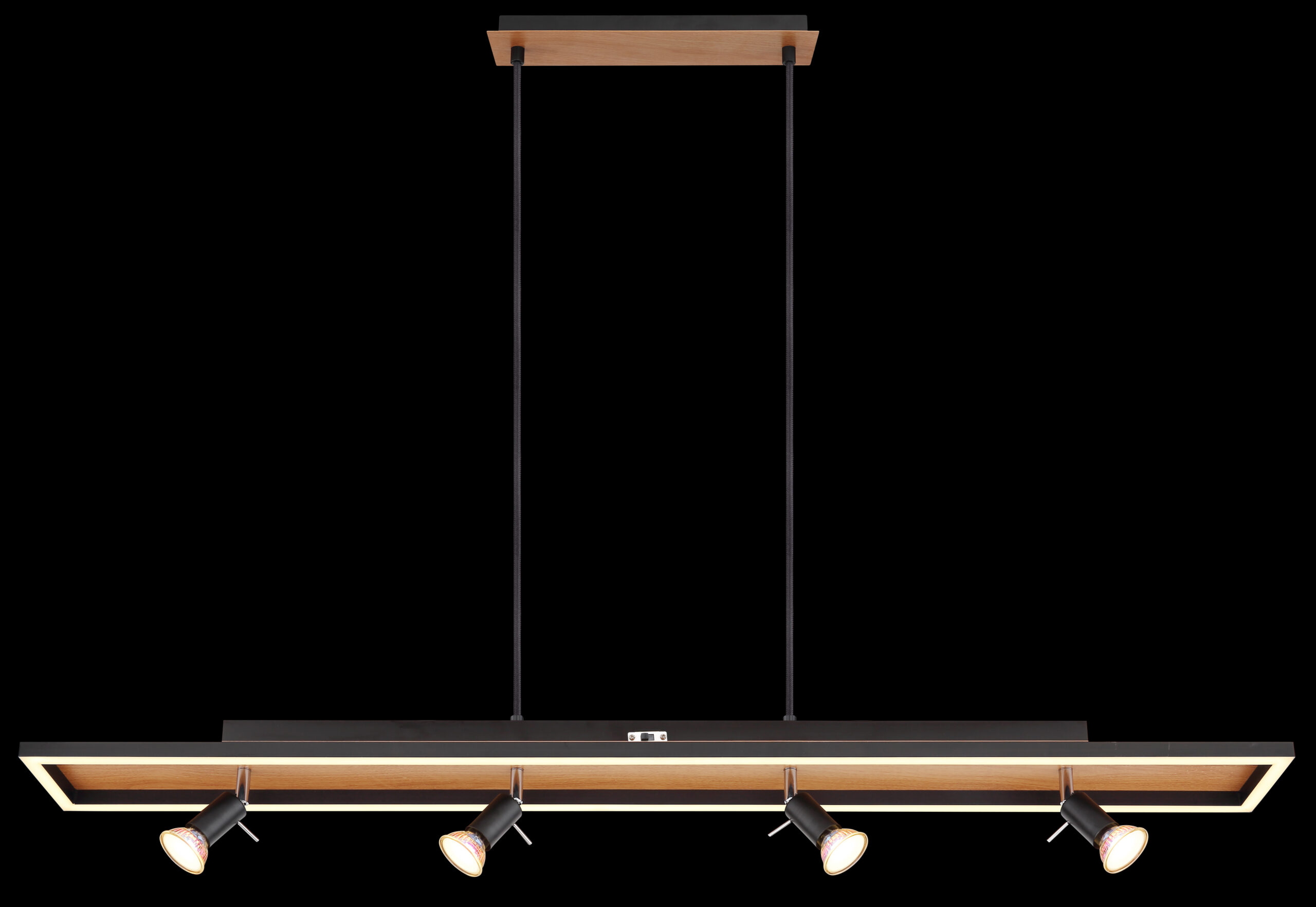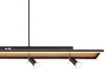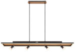 Ova moderna plafonska lampa inspiriše svojim sjajnim izgledom. Četiri GU10 utičnice sa dodatnim oblikovanim pravougaonim LED panelom (116x12cm) vire iz drvenog bloka i vise 1,2m od plafona na dva crna kabla. Uz pomoć memorijske funkcije čuvaju se posljednje korištene postavke.