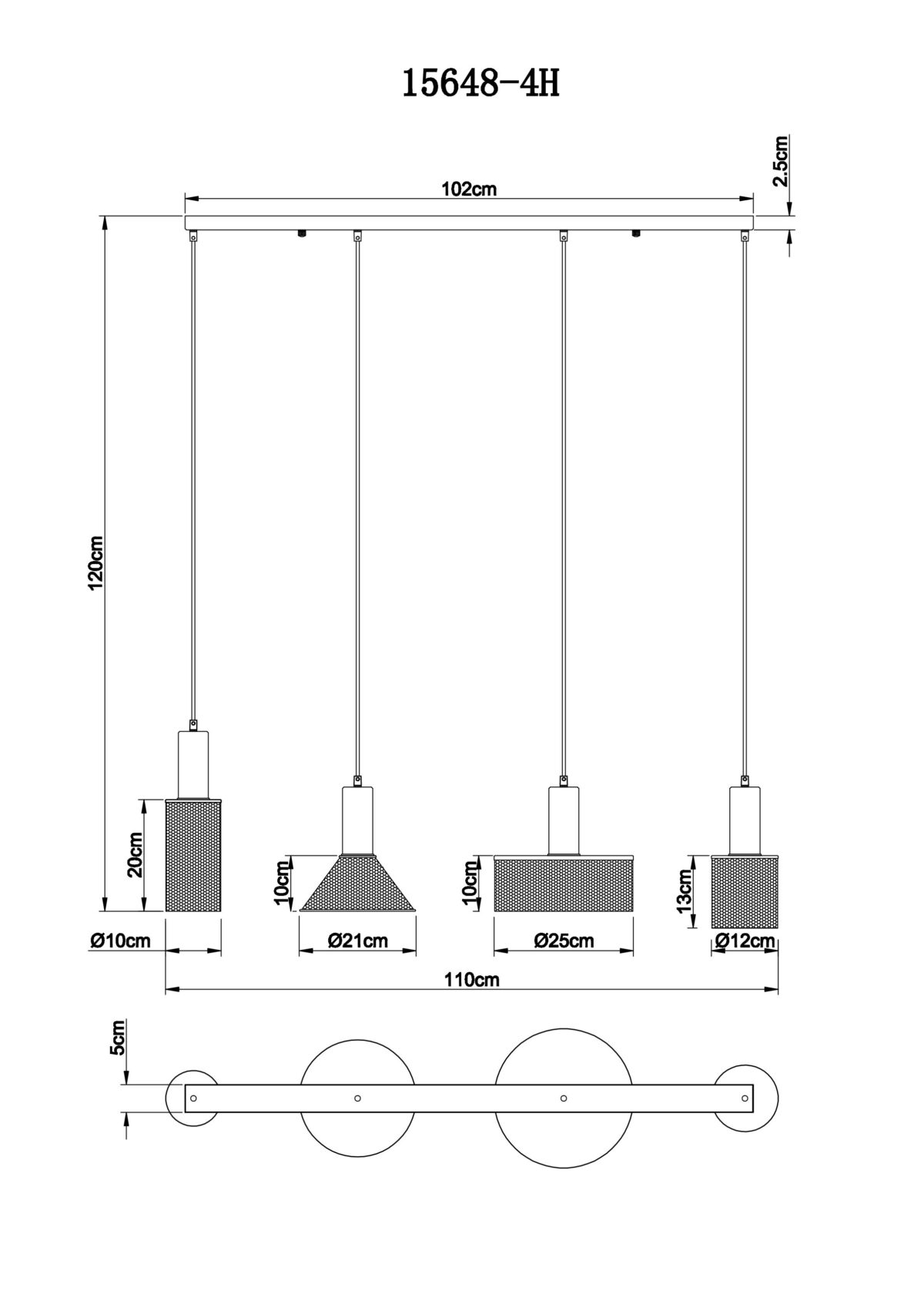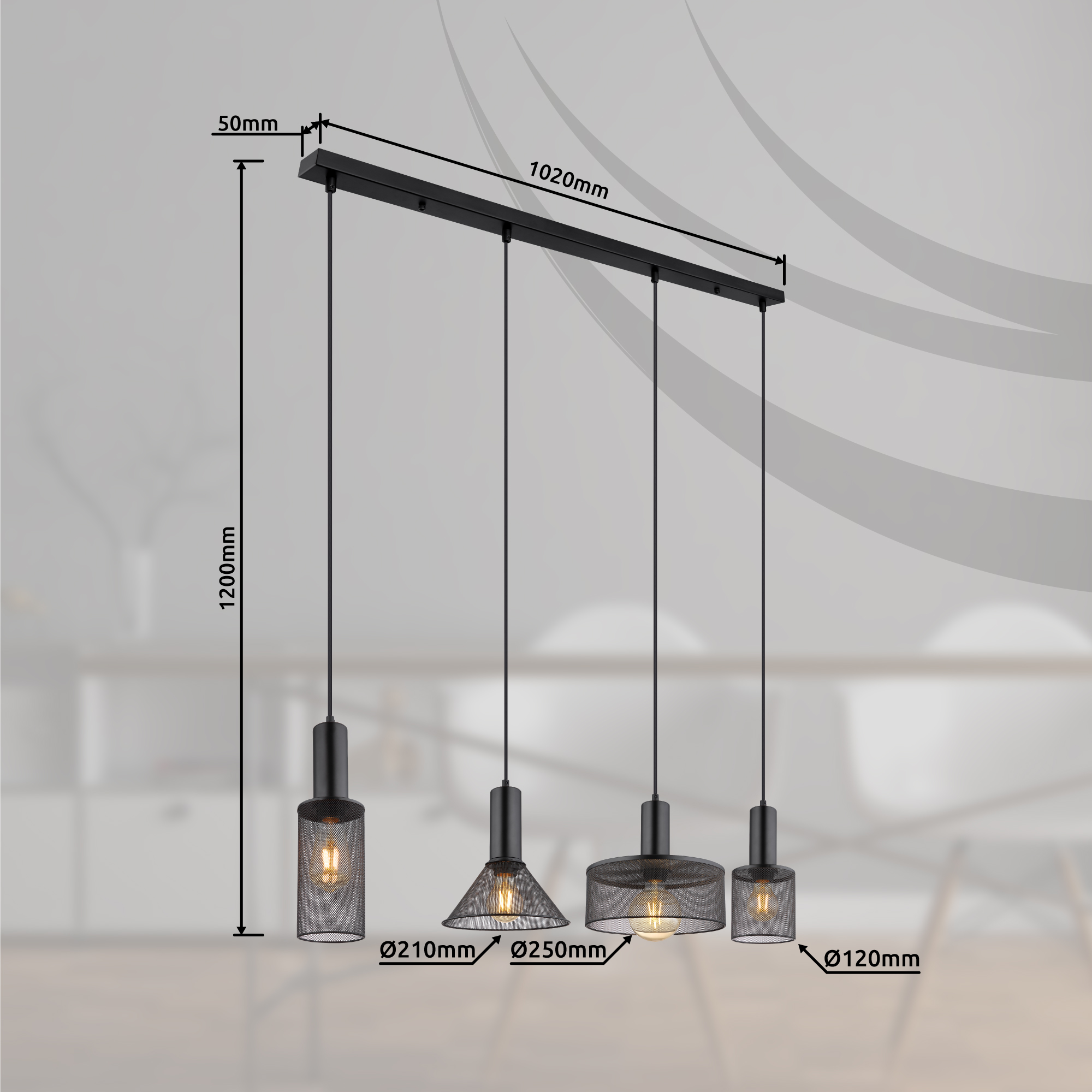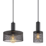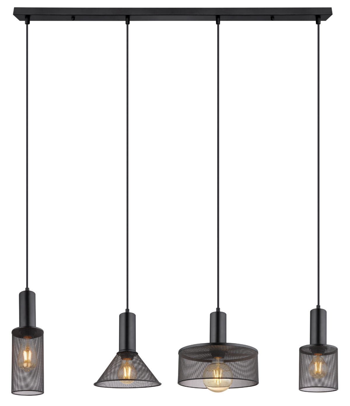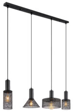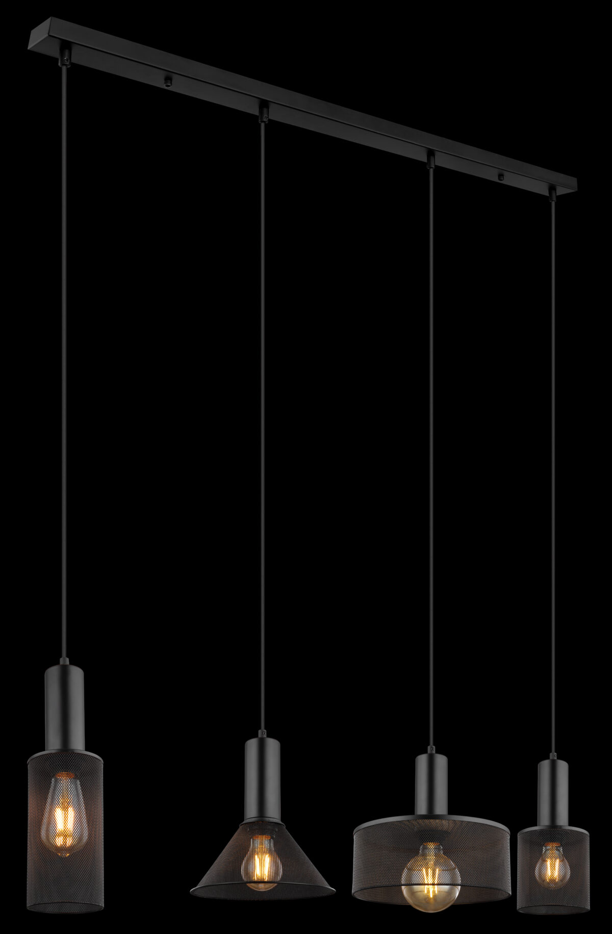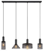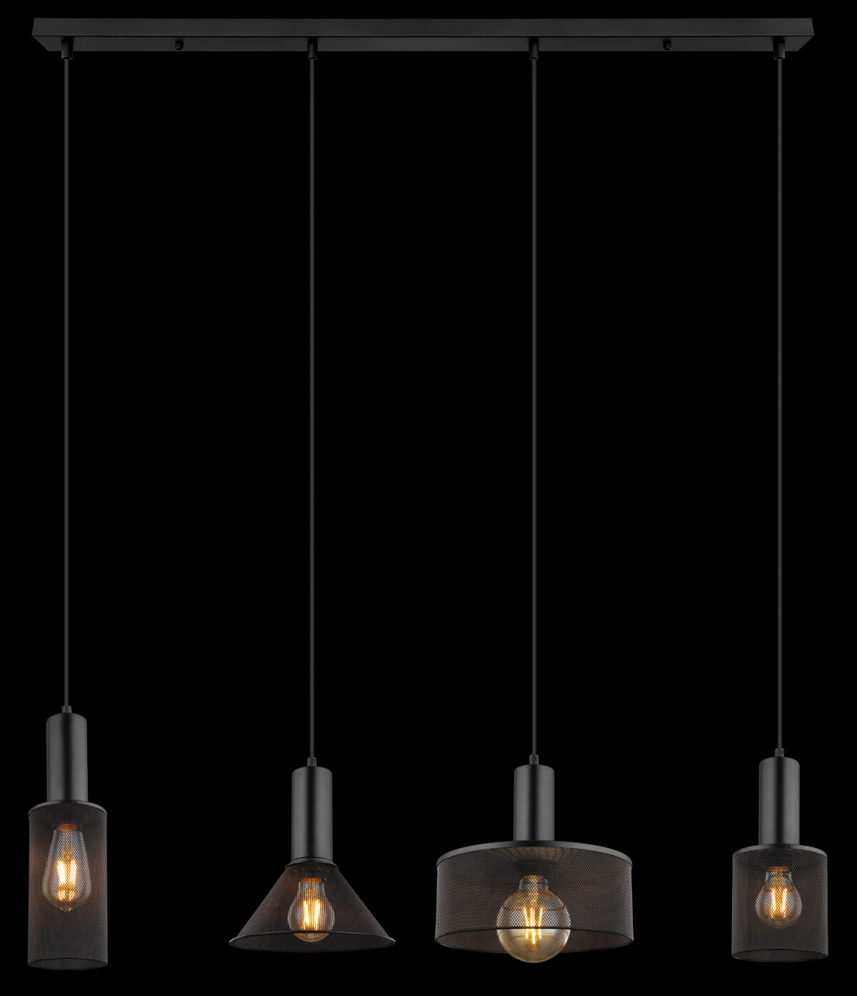 Ova sjajna viseća lampa serije JEDD inspiriše elegantnim dizajnom. Četiri kabla dužine 1,2 m vire iz 105 cm dugog crnog plafonskog nosača, svaki sa E27 utičnicom. Svaka od njih je opremljena različitim oblikovanim nijansama od crne metalne mreže. E27 utičnice vam omogućavaju da sami odredite boju svjetla i svjetlinu do maksimalne snage od 60 vati. Zbog dugovečnosti i uštede energije preporučujemo LED sijalice.