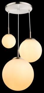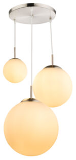 Elegantna i istovremeno moderna plafonska lampa Joel, privlači pažnju u svakom dnevnom boravku. Tri svjetlosne sfere različite veličine (Ø20cm, Ø25cm i Ø30cm) od bijelog opalnog stakla koje visi sa odgovarajućeg okruglog ovjesa omogućavaju slobodan izbor (max.60W) lampi zahvaljujući ugrađenim E27 grlima. Zbog uštede energije i dugovečnosti preporučujemo LED lampe. Serija modela nudi vam dodatne mogućnosti da svoj životni prostor učinite zapanjujuće lijepim.