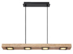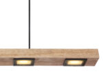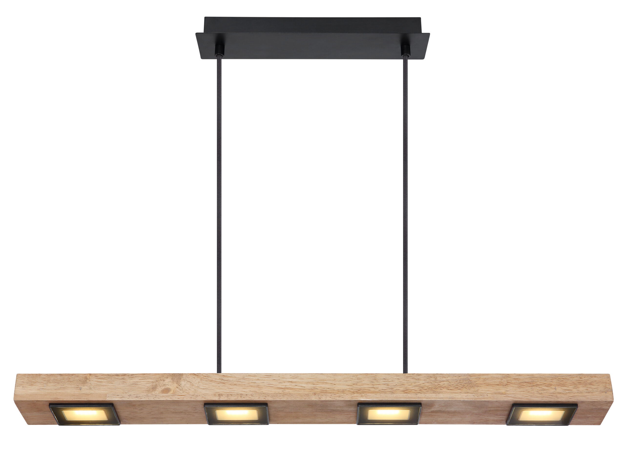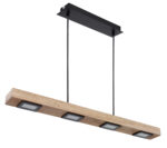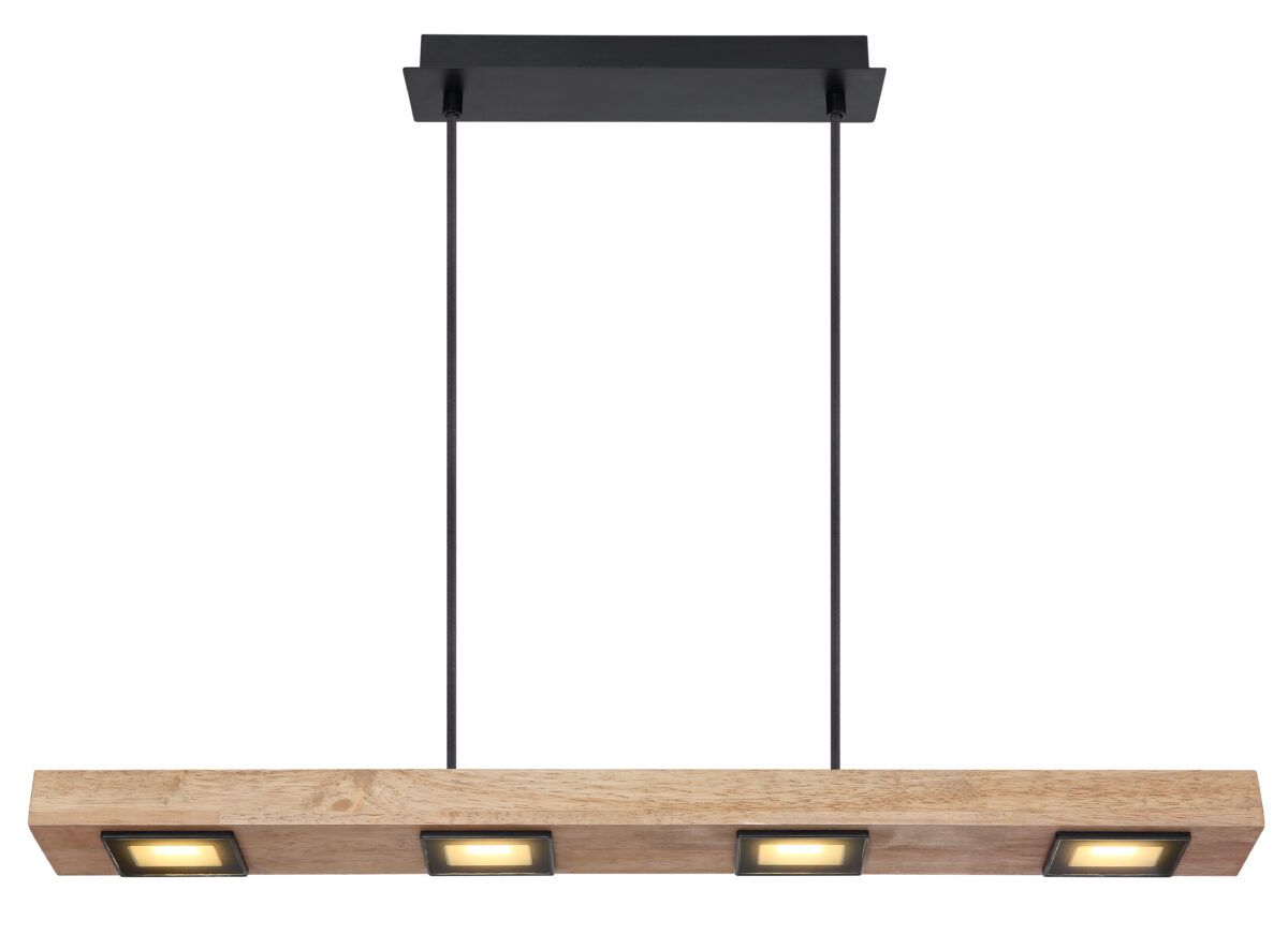 Ova viseća lampa iz serije Joya uvjerava svojim prekrasnim dizajnom od crno-mat metala i drveta. Zbog svog izduženog oblika, plafonska lampa se može divno montirati preko trpezarijskog stola, koji tada dobija ujednačeno osvetljenje. Četiri reflektora opremljena su satiniranim staklom i umetnuta u elegantnu drvenu ploču (80×8 cm), s kojom vise 1,2 m od plafona zahvaljujući dvije šipke. Osim toga, visilica ima funkciju pozadinskog osvjetljenja, koju realizuju dva reflektora umetnuta iznad drvene ploče, koja također osvjetljavaju prostor iznad viseće lampe. Zahvaljujući uključenim LED lampama, viseća lampa Joya 2520 Lumen pruža jako svjetlo sa prijatnom bojom svjetlosti od 3000 Kelvina (toplo bijelo). S više artikala iz serije Joya možete upotpuniti cjelokupnu sliku vašeg interijera.