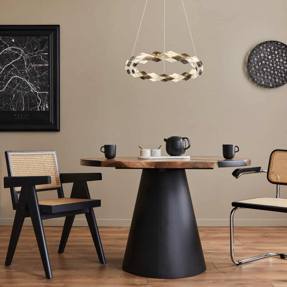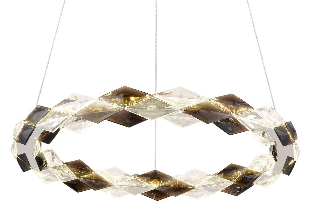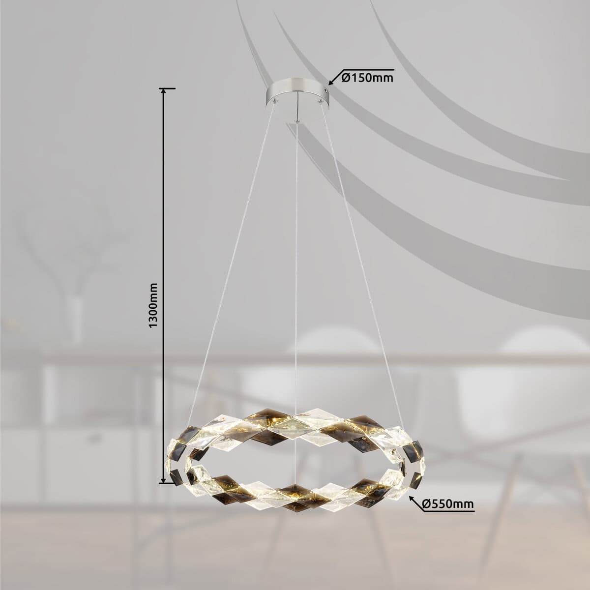Visina lampe je prečnika 550 mm i visine 1300 mm. Izrađen je od hromiranog metala i akrilnih kristala u boji dima. Lampa se napaja LED lampom sa potrošnjom energije od 36 vati, koja proizvodi svjetlosnu snagu od 4100 lumena (izvor) i 920 lumena (efektivno) pri temperaturi boje od 4000 Kelvina 1. Ova viseća lampa je prava oka- catcher i odličan je za moderne životne prostore. Kombinacija hromiranog metala i akrilnih kristala u boji dima daje lampi elegantan izgled koji uljepšava svaku prostoriju. Podešavanje visine vam omogućava da svetiljku prilagodite svojim potrebama i postavite je na različita mesta u prostoriji. LED lampa pruža jako i energetski efikasno osvjetljenje koje prostoriju okupa ugodnim svjetlom.
