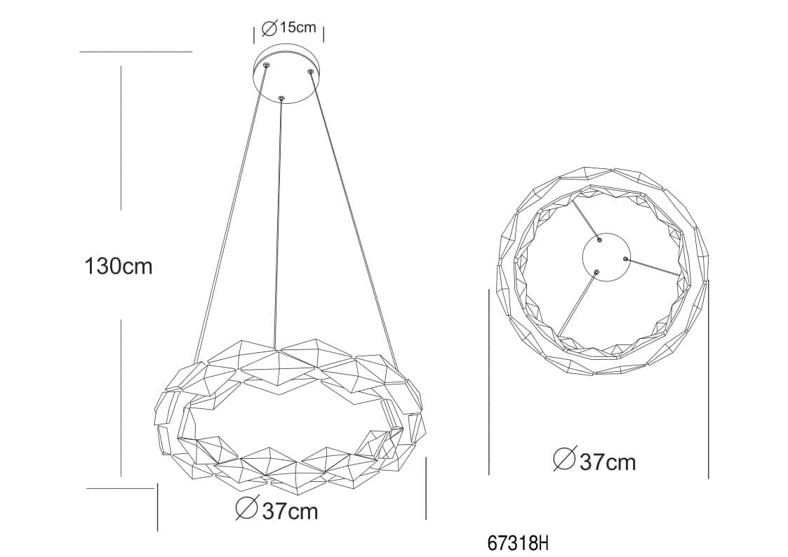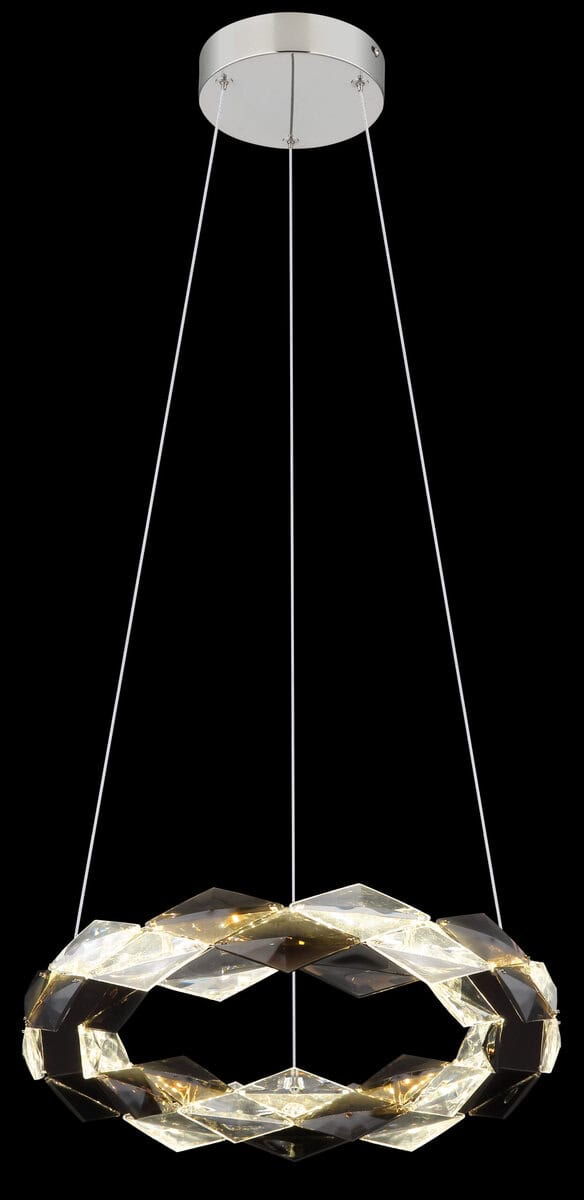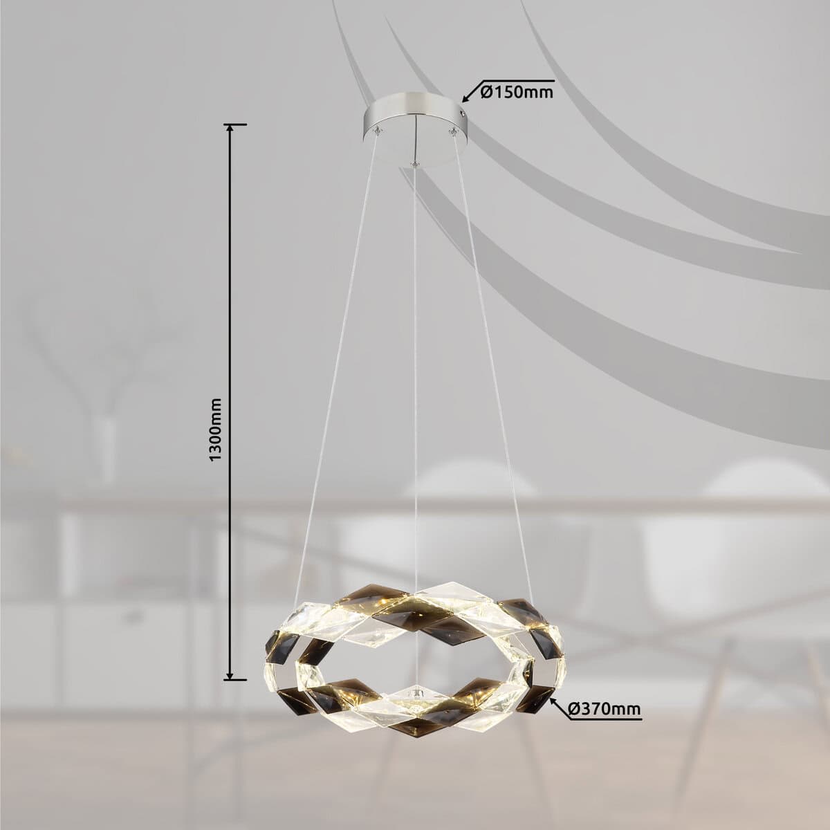 Visina lampe je prečnika 370 mm i visine 1300 mm. Podesiva je po visini i izrađena je od hromiranog metala i akrilnih kristala u boji dima. Lampa se napaja LED lampom sa potrošnjom energije od 24 vata, koja proizvodi svjetlosnu snagu od 2750 lumena (izvor) i 840 lumena (efektivno) pri temperaturi boje od 4000 Kelvina 1. Ova viseća lampa je prava oka- catcher i odličan je za moderne životne prostore. Kombinacija hromiranog metala i akrilnih kristala u boji dima daje lampi elegantan izgled koji uljepšava svaku prostoriju. Podešavanje visine vam omogućava da svetiljku prilagodite svojim potrebama i postavite je na različita mesta u prostoriji. LED lampa pruža jako i energetski efikasno osvjetljenje koje prostoriju okupa ugodnim svjetlom.