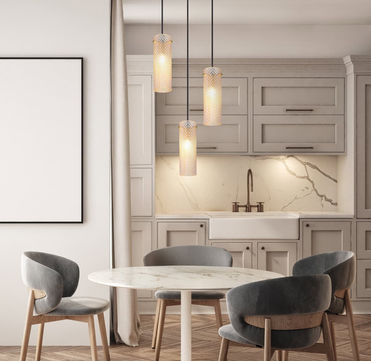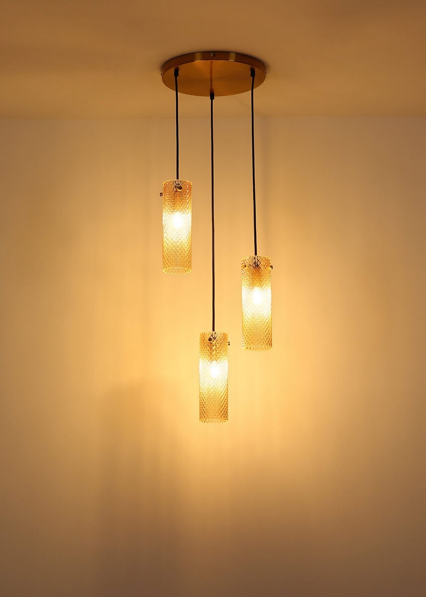 Viseća lampa KAROLO – elegancija i stil za vaš dom Viseća lampa KAROLO okruglog oblika impresionira svojim jedinstvenim dizajnom, koji se sastoji od tri cilindrična stakla sa strukturom saća i osigurava fascinantnu refleksiju svjetlosti. Tijelo izrađeno od metala zlatne boje daje lampi elegantan i bezvremenski izgled koji stavlja akcente u svaku prostoriju. Amber staklene sjenila pružaju toplo, ugodno svjetlo koje stvara privlačnu atmosferu. Sa promjerom od 350 mm, lampa je posebno pogodna za blagovaonice, dnevne sobe ili kuhinjske otoke. E14 grla (nisu uključeni) nude mogućnost opremanja lampe prema individualnim potrebama rasvjete. Viseća lampa KAROLO je savršen izbor za sve koji traže elegantno rasvjetno rješenje koje je i funkcionalno i estetski ugodno.