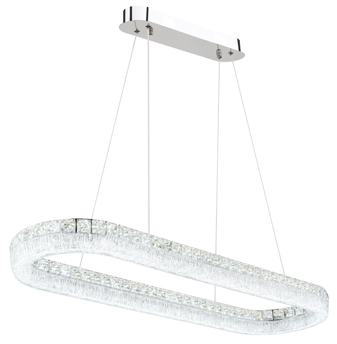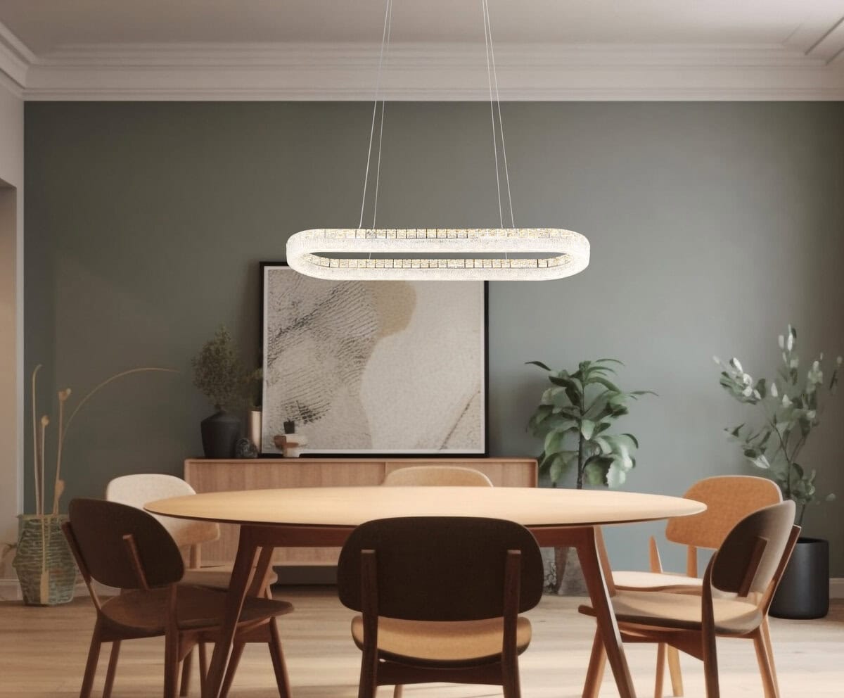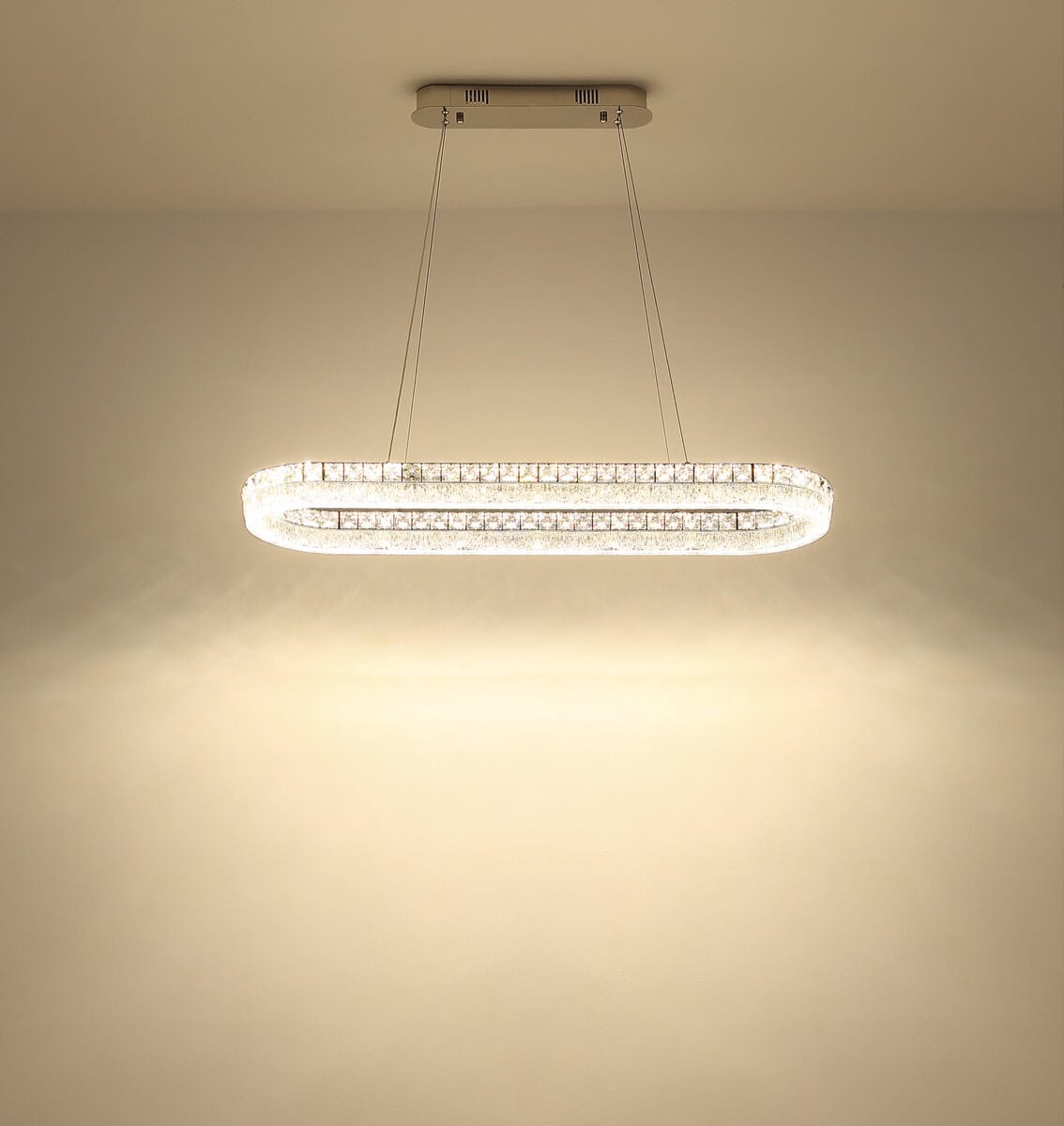 Viseća lampa LAUREL impresionira svojim elegantnim, ovalnim dizajnom i visokokvalitetnom izradom. Kromirani metalni okvir skladno se kombinira s prozirnom akrilnom nijansom, naglašenom svjetlucavim kristalima od prozirnog stakla. Sa dužinom od 1001 mm i širinom od 315 mm, LAUREL stvara elegantne svjetlosne akcente u modernim dnevnim i blagovaonicama. Lampa isporučuje snažan svjetlosni učinak od 3580 lumena i ima izdržljivu LED tehnologiju. Pomoću praktičnog daljinskog upravljača, svjetlina i boja svjetla mogu se glatko prigušiti i podesiti između tople bijele (2700 K) i dnevno bijele (6000 K) (CCT funkcija). Pojedinačne boje se mogu fiksirati, a integrirana memorijska funkcija čuva posljednje postavke. Dodatno noćno svjetlo pruža nježno osvjetljenje u večernjim satima.